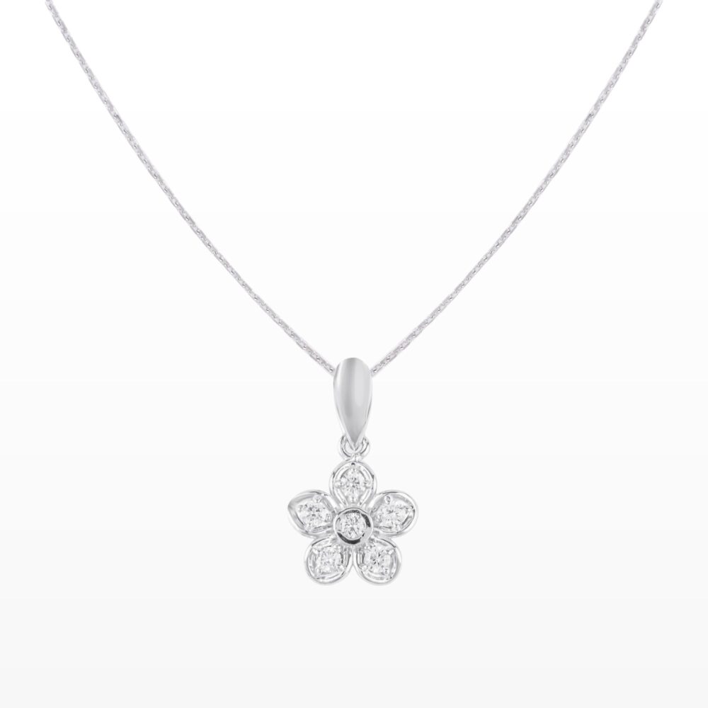 Thiết kế hoa năm cánh được chế tác cân đối, mềm mại, mỗi cánh hoa là một viên kim cương được viền khéo léo, hội tụ quanh viên chủ trung tâm lấp lánh. Cách sắp xếp tinh xảo giúp mặt dây chuyền tỏa sáng nhẹ nhàng, không phô trương nhưng vẫn nổi bật ở mọi góc nhìn