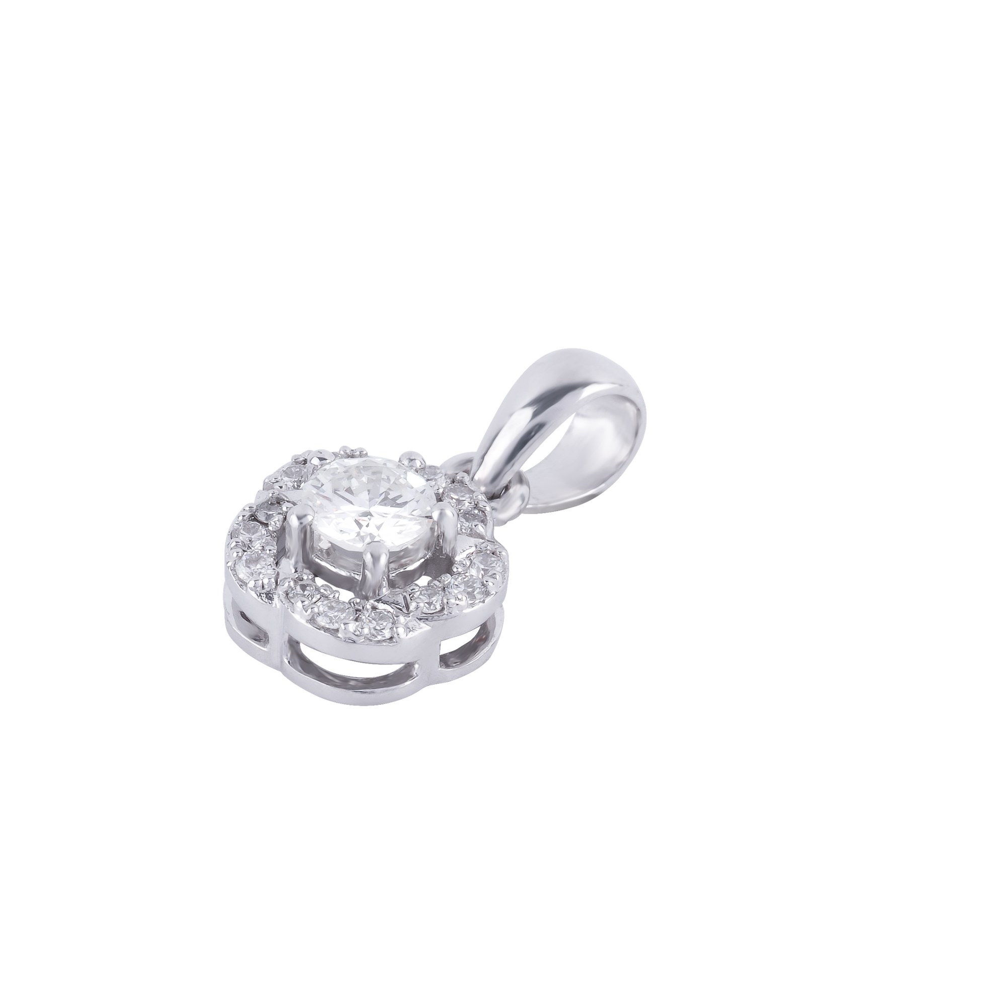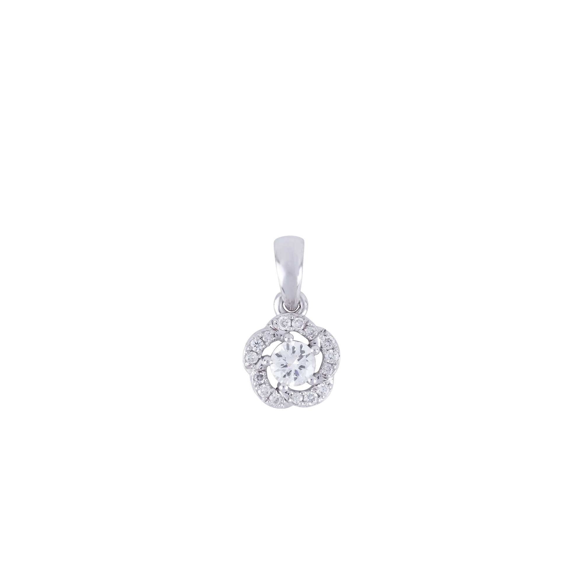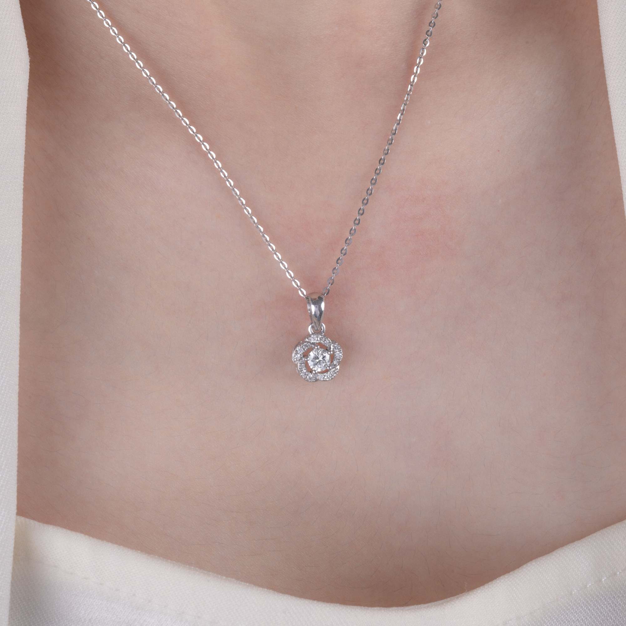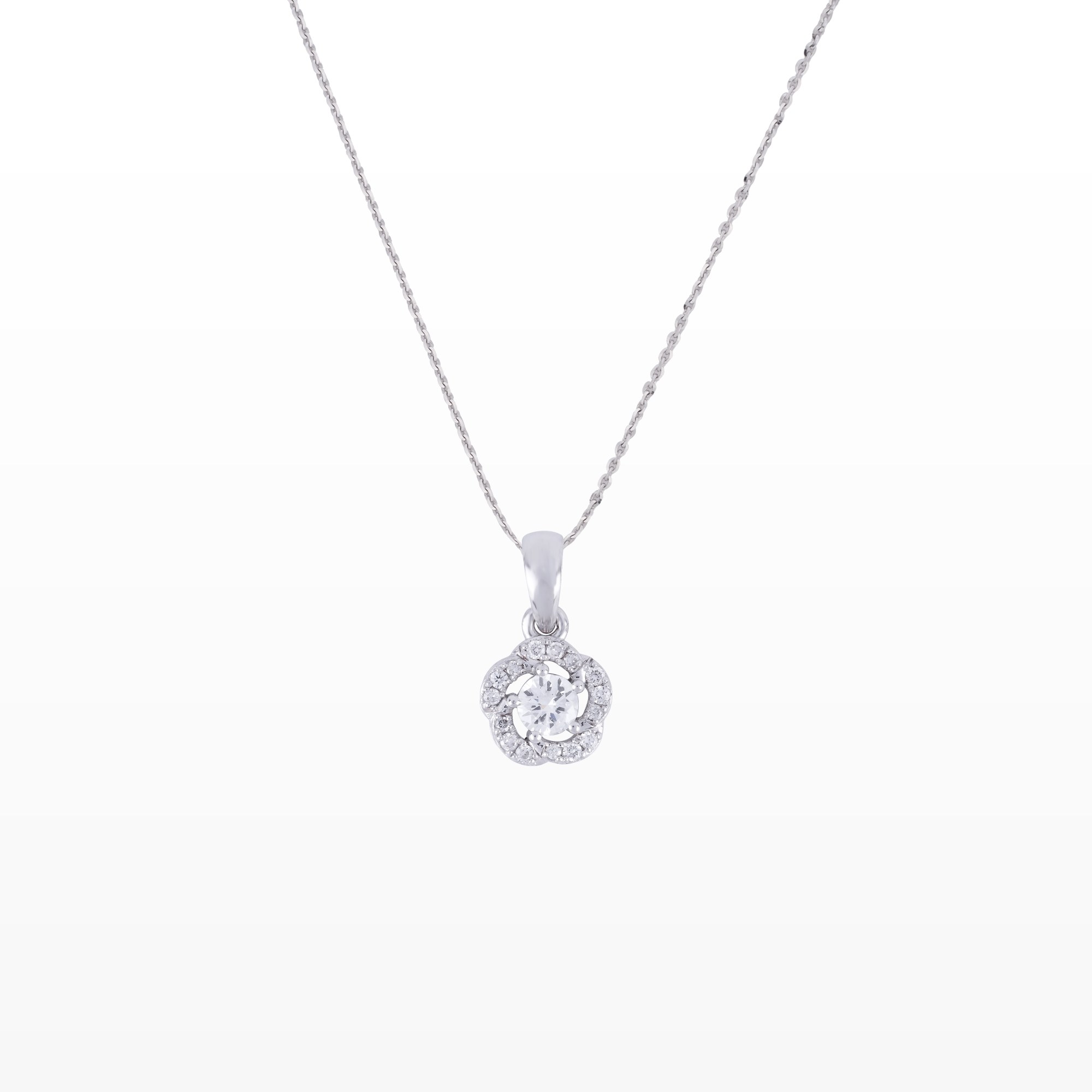 Mặt dây chuyền thiết kế tinh tế với viên đá chủ dáng tròn rực rỡ, được bao bọc bởi vòng kim cương tấm sắp xếp như những cánh hoa mềm mại. Hiệu ứng halo không chỉ gia tăng độ bắt sáng mà còn tạo cảm giác viên đá trung tâm lớn hơn, lấp lánh nổi bật trong từng chuyển động.