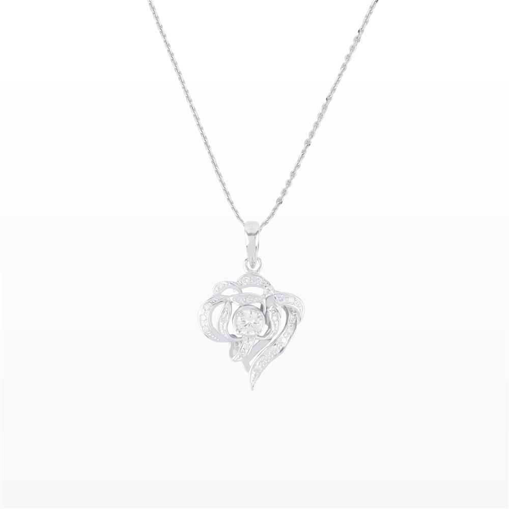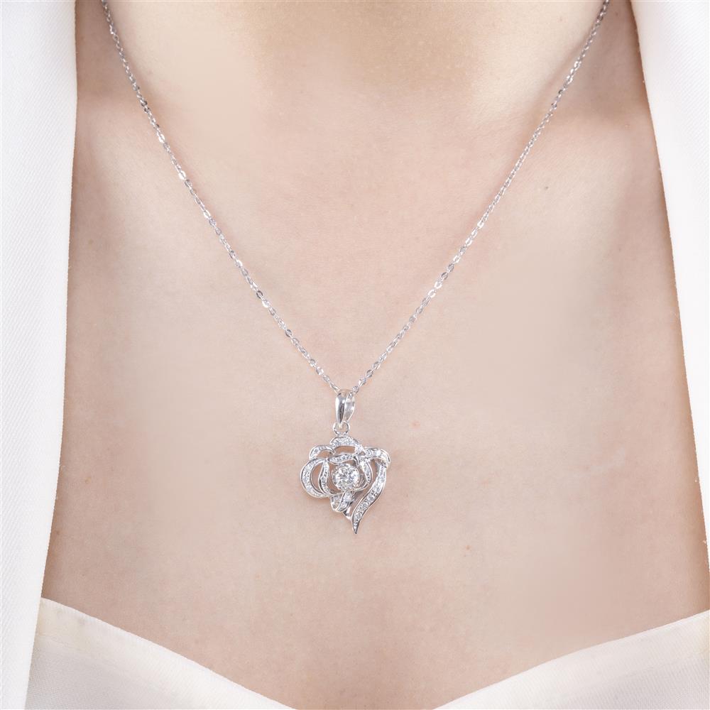 Lấy cảm hứng từ đóa hồng đang hé nở, mặt dây chuyền mang đường nét uốn lượn mềm mại, bao quanh viên kim cương trung tâm rực rỡ – biểu tượng của tình yêu vĩnh cửu và vẻ đẹp thuần khiết.