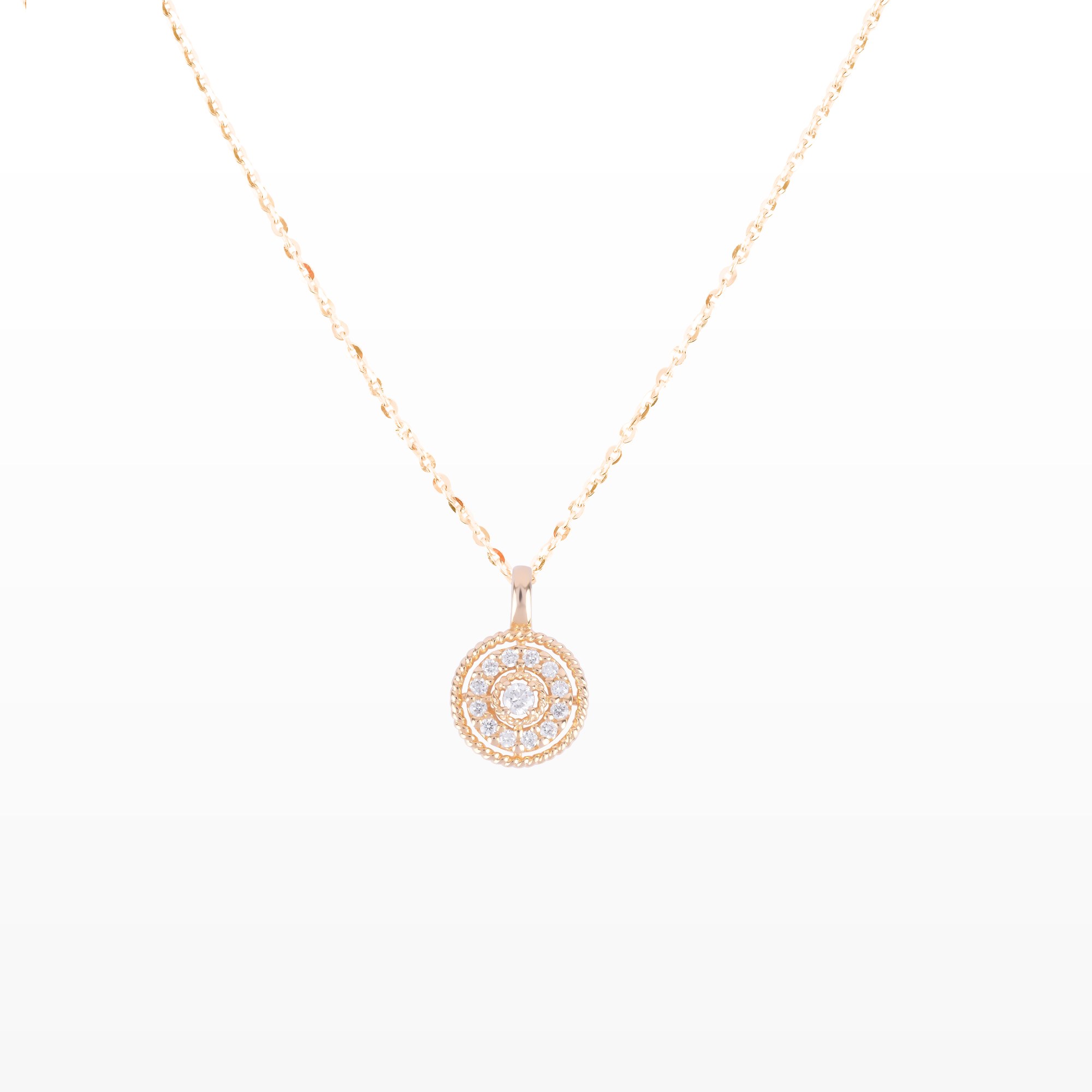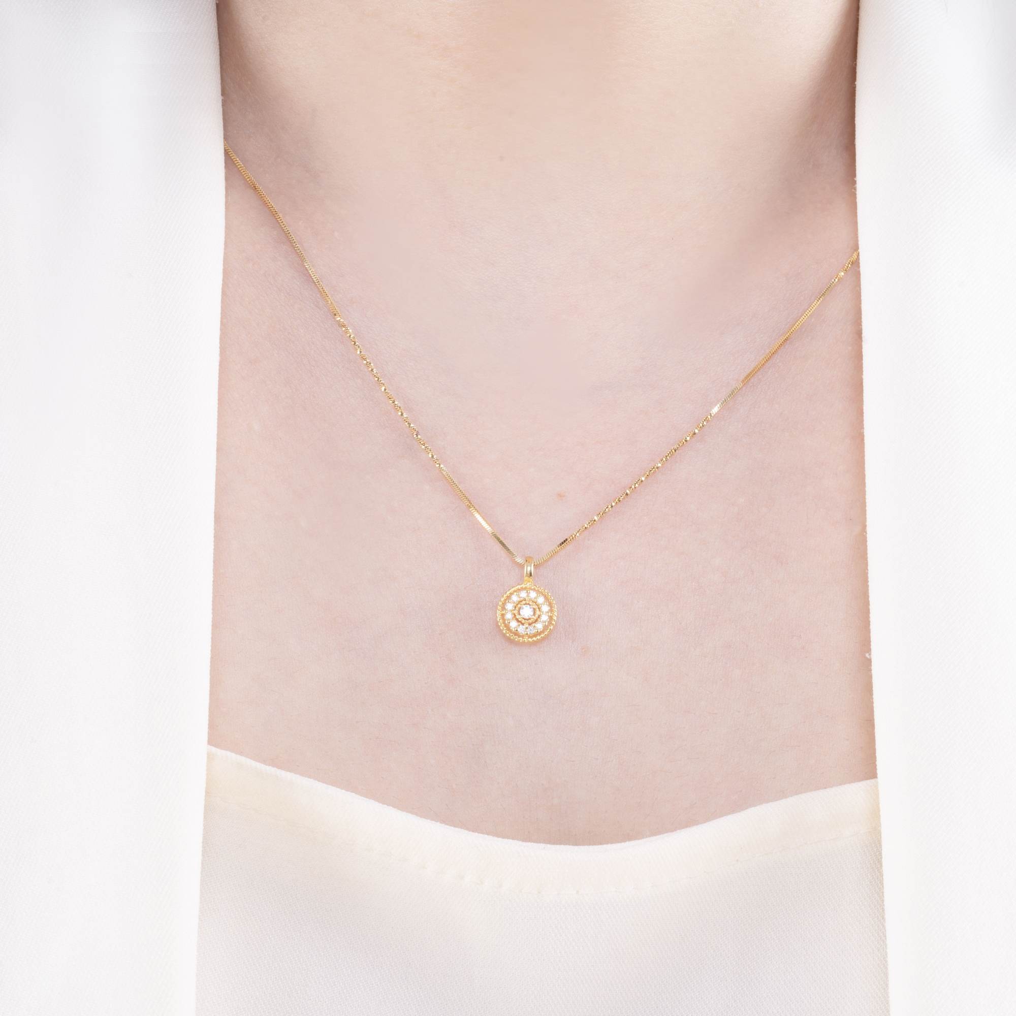 Tinh tế và rạng rỡ, mặt dây chuyền được thiết kế theo hình tròn biểu trưng cho sự trọn vẹn và vĩnh cửu. Từng viên kim cương thiên nhiên được sắp đặt khéo léo, tỏa sáng như những tia nắng len lỏi qua buổi sớm mai, mang đến vẻ đẹp nữ tính, thanh lịch và đầy cuốn hút.