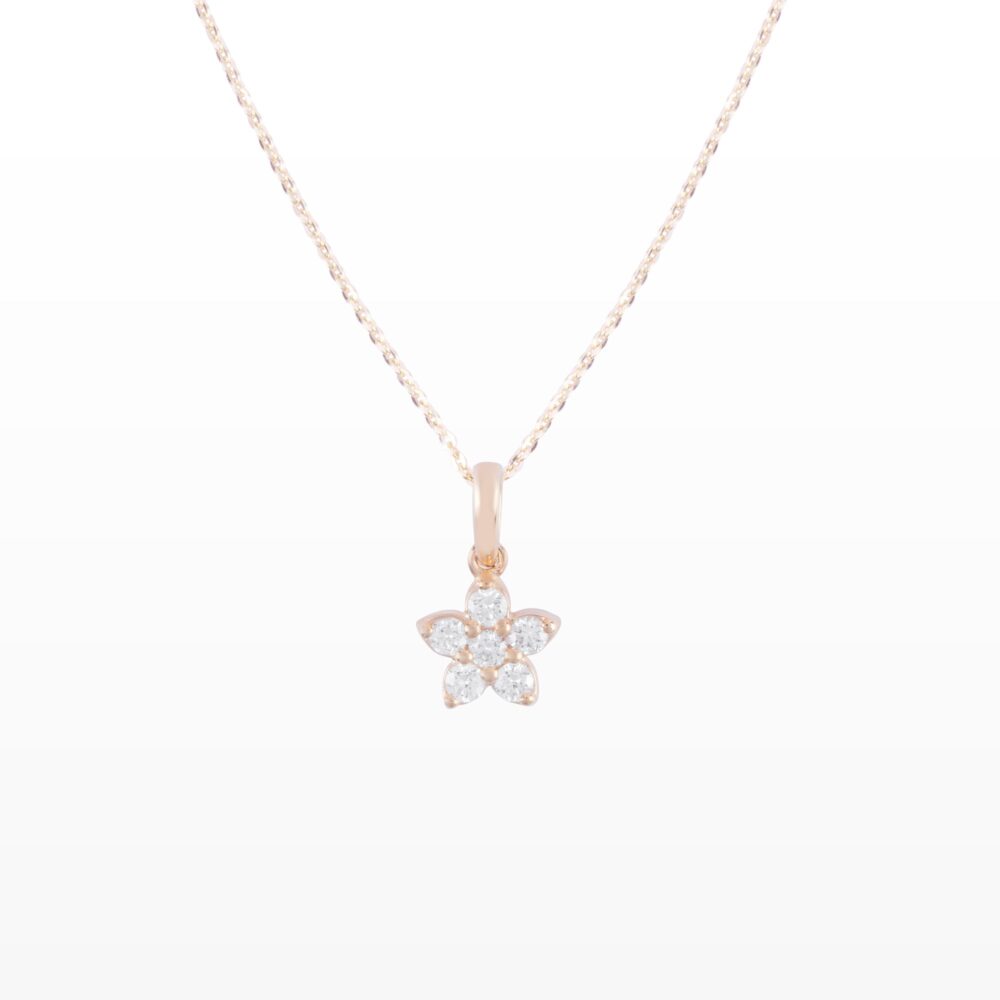 Lấy cảm hứng từ đóa hoa nhỏ đang khẽ nở, mặt dây chuyền kim cương hoa 5 cánh mang vẻ đẹp mềm mại, tinh khôi và đầy nữ tính. Năm viên kim cương được sắp xếp hài hòa, tỏa sáng nhẹ nhàng như những cánh hoa đón ánh nắng, tạo cảm giác trong trẻo nhưng không kém phần sang trọng.