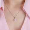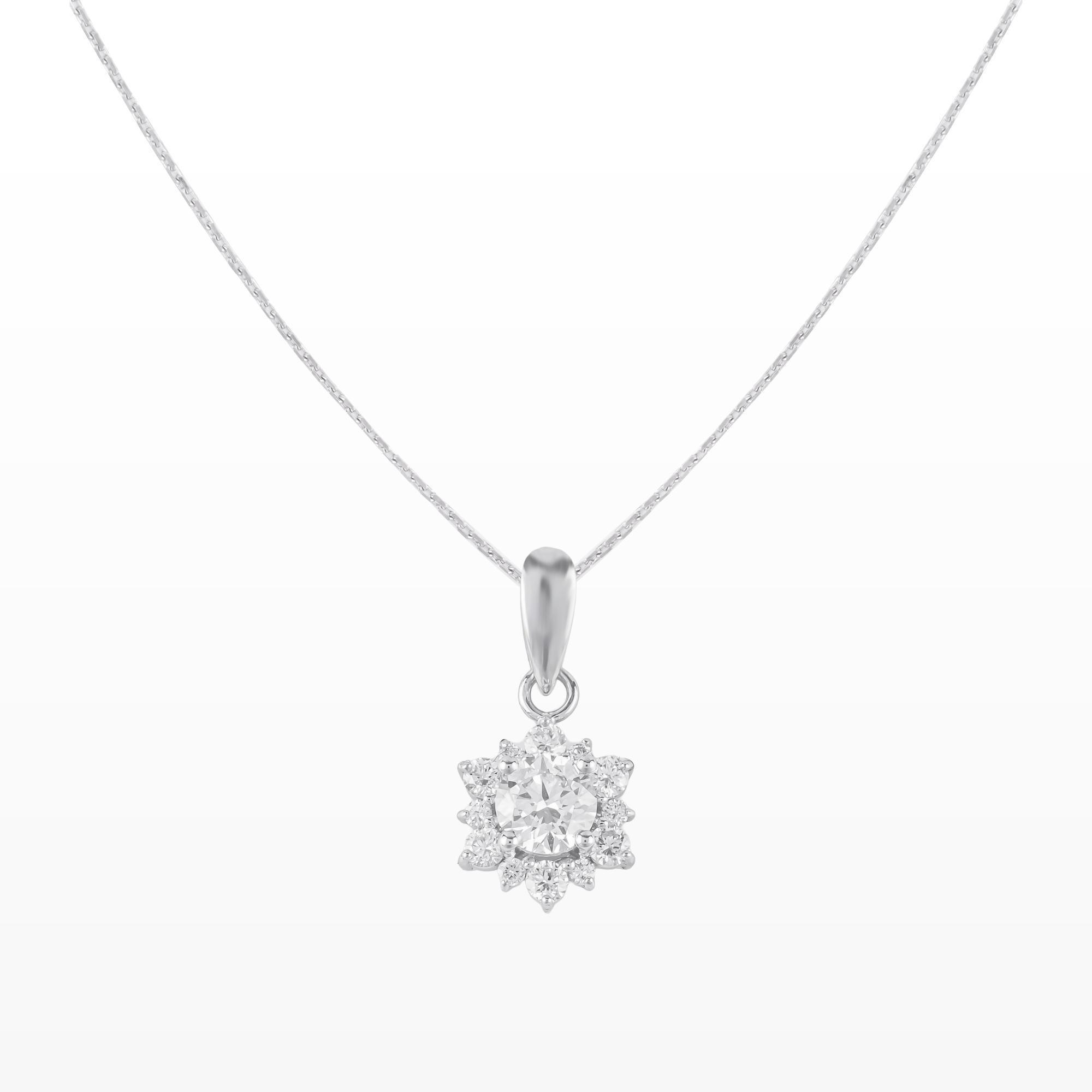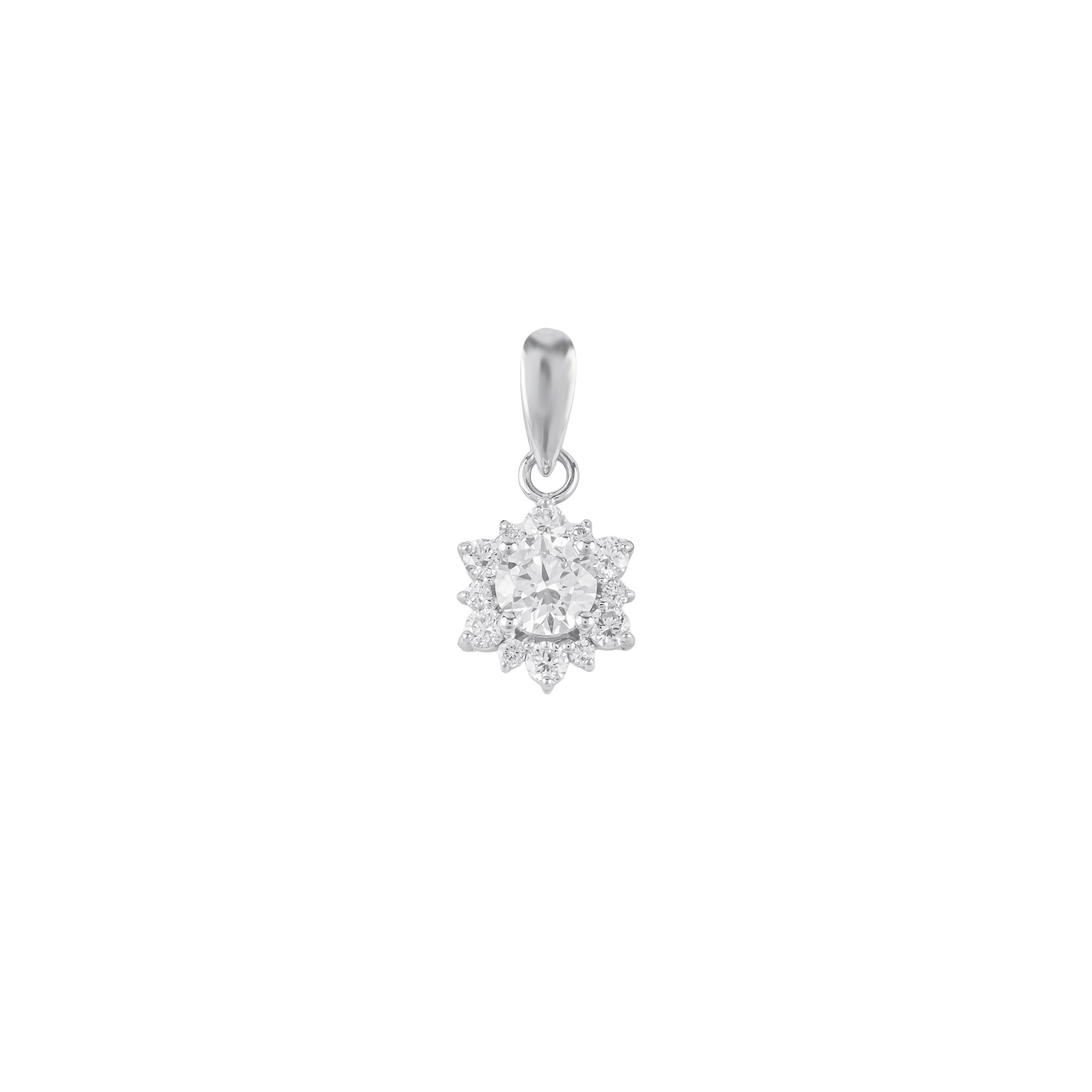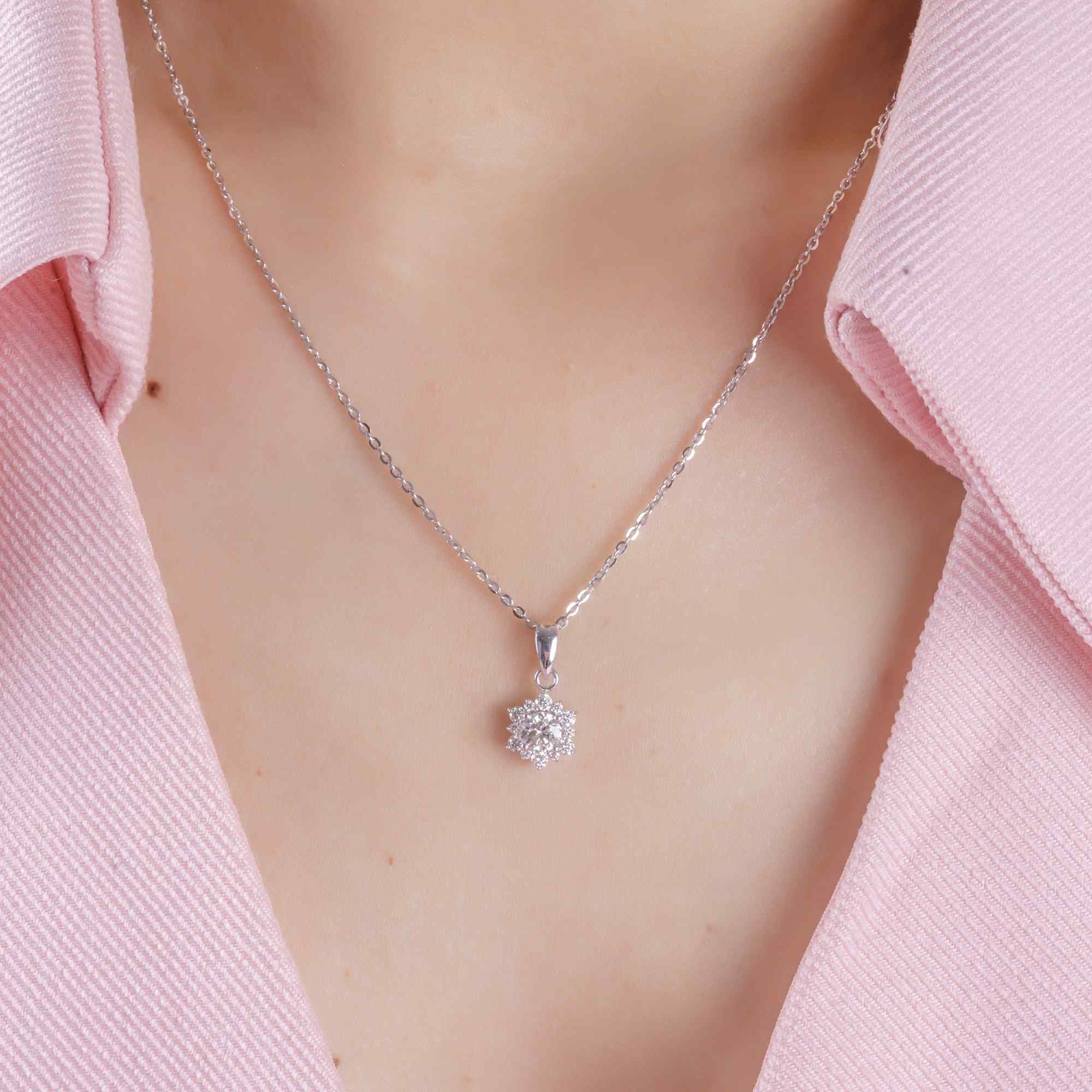Mặt dây chuyền kim cương thiết kế hoa sao tinh khiết mang đến vẻ đẹp rạng rỡ nhưng đầy thanh lịch, dành cho người phụ nữ yêu sự tinh tế vượt thời gian. Viên kim cương chủ tròn được đặt ở trung tâm, tỏa sáng mạnh mẽ và trong trẻo. Bao quanh là những viên kim cương nhỏ được sắp xếp khéo léo như cánh hoa nở rộ hay ngôi sao đang lan tỏa ánh sáng, tạo hiệu ứng lấp lánh đa chiều ở mọi góc nhìn. Tổng thể mang lại cảm giác mềm mại, nữ tính nhưng vẫn rất sang trọng.