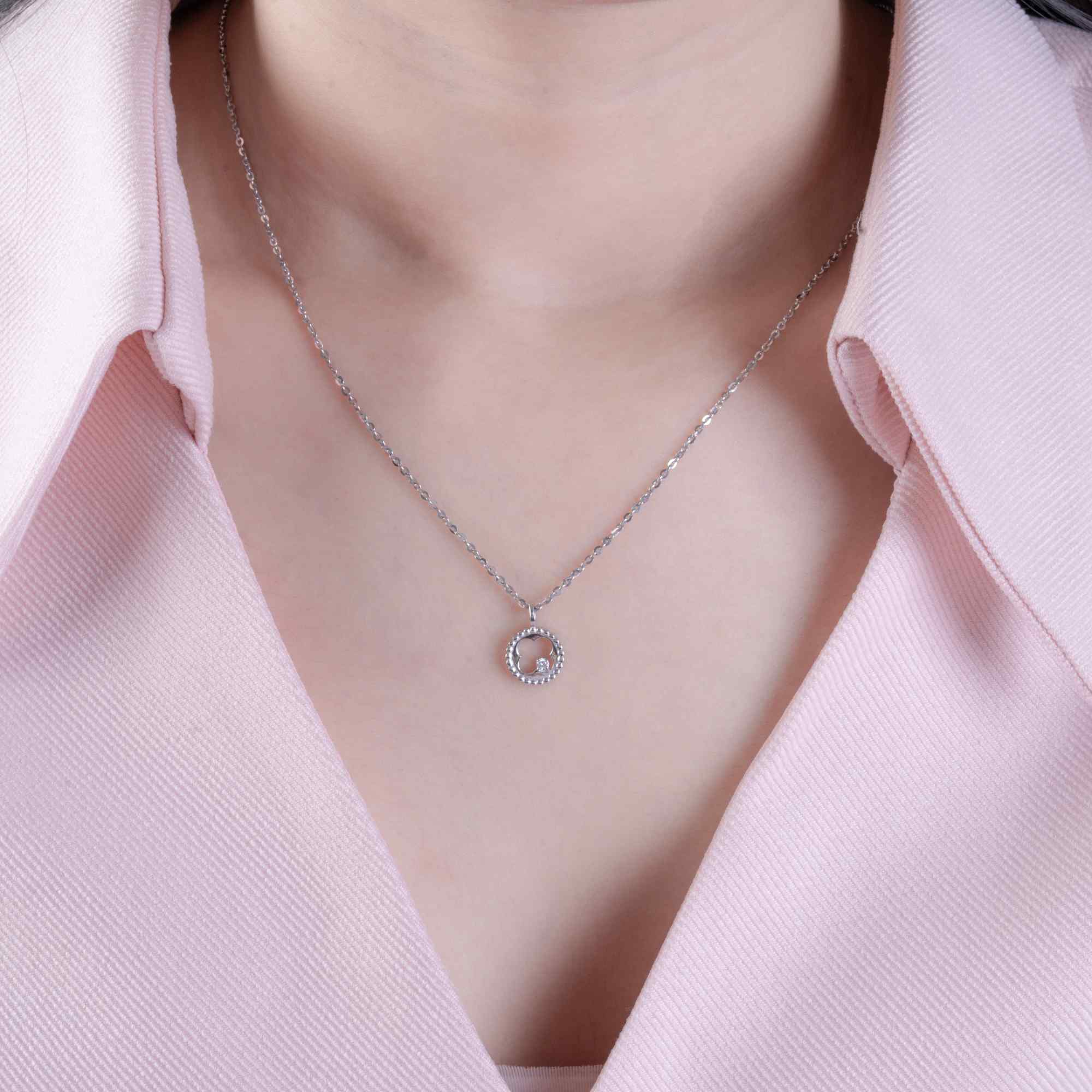 Nhẹ nhàng nhưng đầy ý nghĩa, thiết kế mặt dây hình trái tim bốn cánh được bao bọc trong vòng tròn mềm mại như lời nhắn gửi về một tình yêu trọn vẹn và được chở che. Viên kim cương nhỏ lấp lánh ở trung tâm tựa như khoảnh khắc rung động đầu tiên – tinh tế, thuần khiết và khó quên.