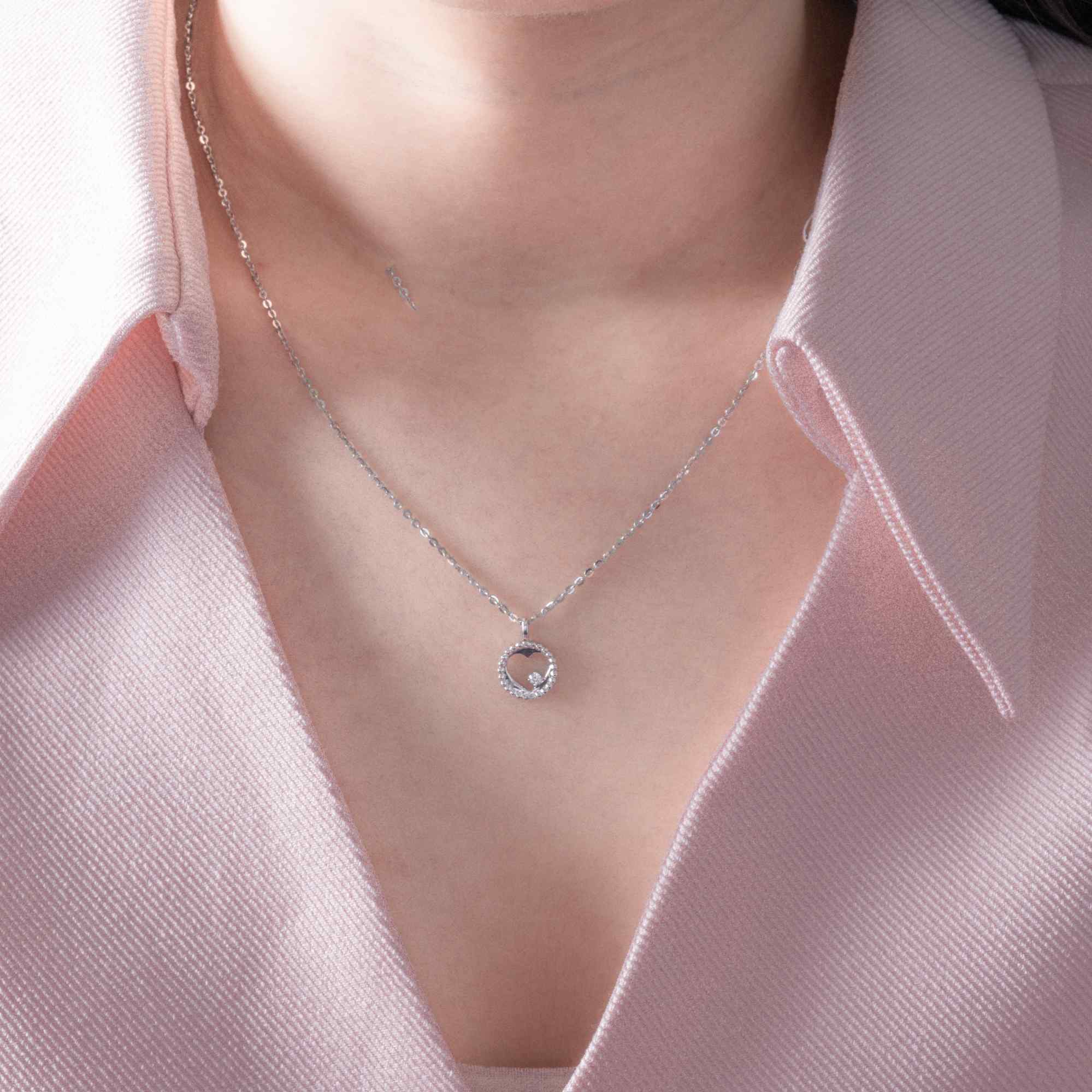 hiết kế trái tim mềm mại được bao bọc bởi viền hạt tinh xảo, điểm nhấn là viên kim cương lấp lánh nằm khẽ bên trong – như một nhịp yêu được gìn giữ cẩn thận giữa vòng tay chở che. Chiếc dây chuyền không phô trương, nhưng đủ để nói thay những cảm xúc chân thành: yêu thương, trân trọng và gắn bó dài lâu.