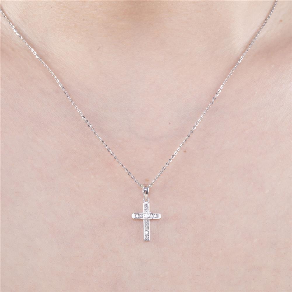 Thanh lịch và đầy biểu tượng, mặt dây chuyền thánh giá kim cương mang thiết kế cổ điển được chế tác tinh xảo từ vàng trắng cao cấp, điểm xuyết những viên kim cương tấm sáng đều, tạo nên vẻ đẹp vừa sang trọng vừa trang nhã.