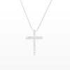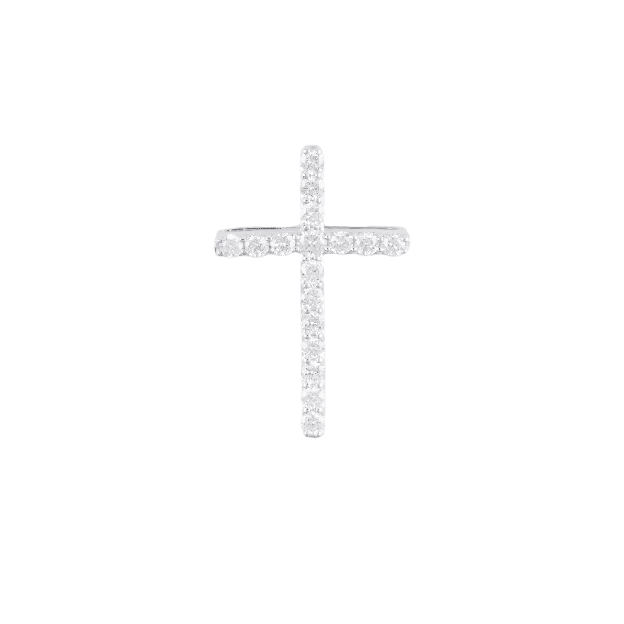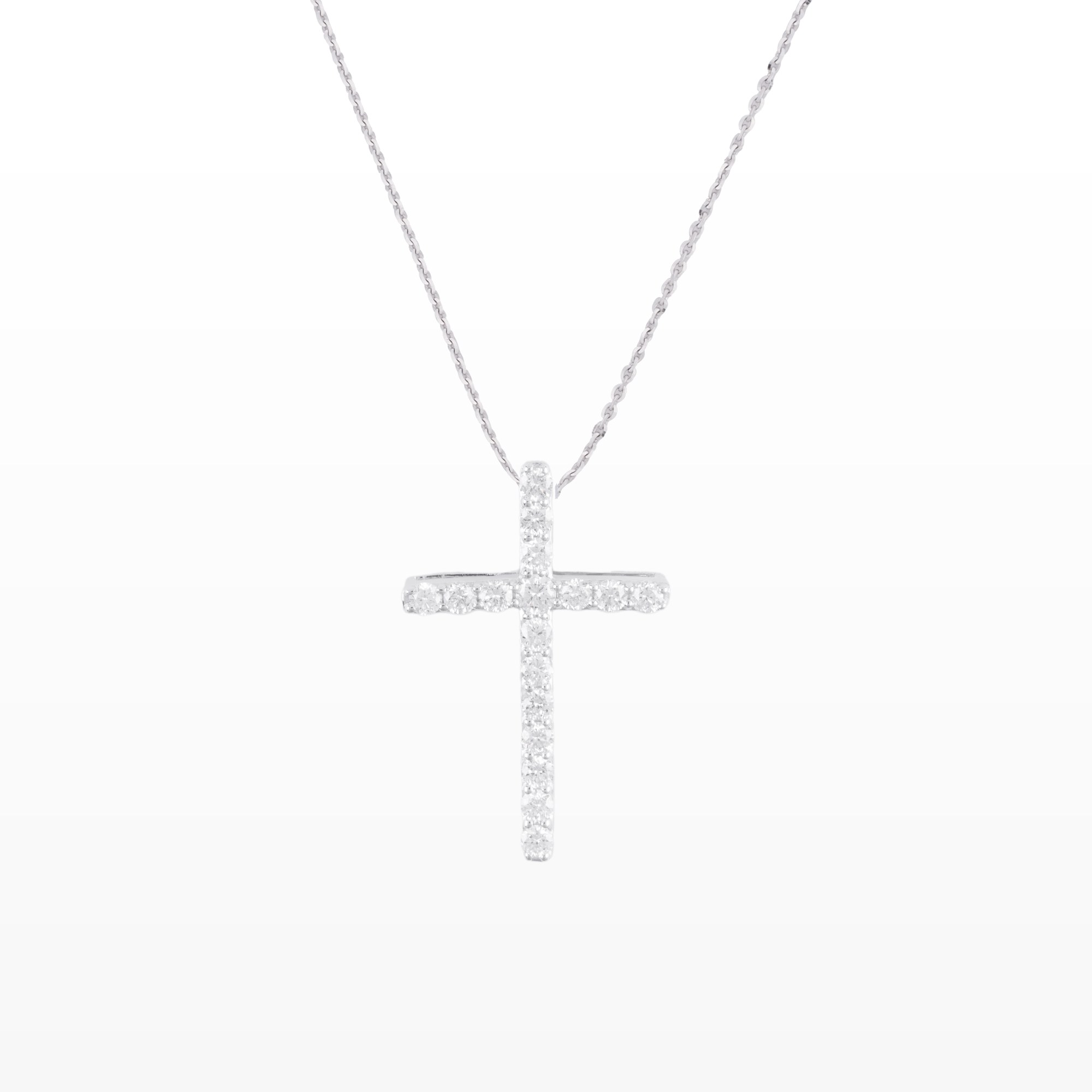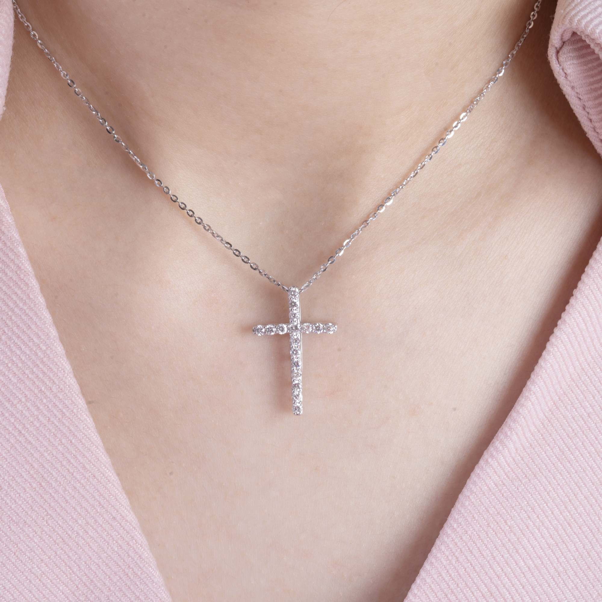 Chiếc dây chuyền mang thiết kế thánh giá thanh lịch, biểu tượng của niềm tin, sự bảo hộ và những giá trị bền vững theo thời gian. Toàn bộ mặt dây được đính kim cương tấm tinh xảo, tạo nên hiệu ứng lấp lánh nhẹ nhàng nhưng đầy cuốn hút trong từng chuyển động.