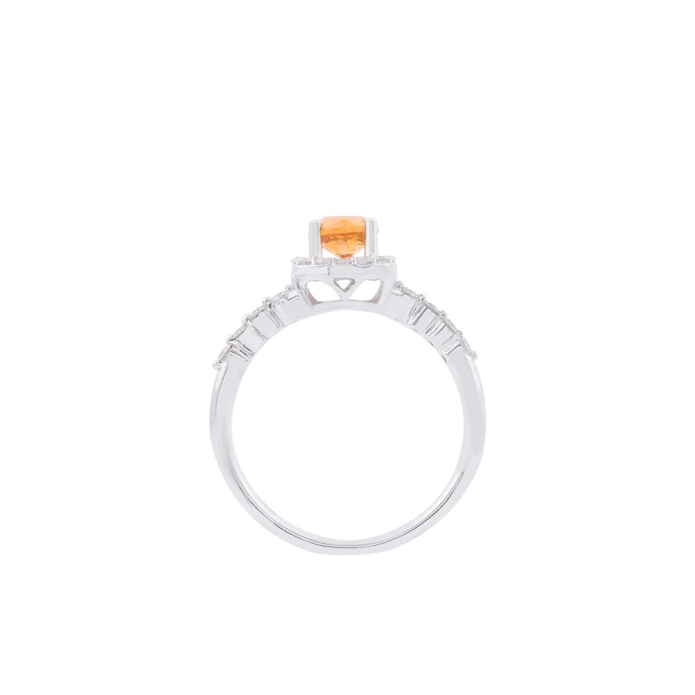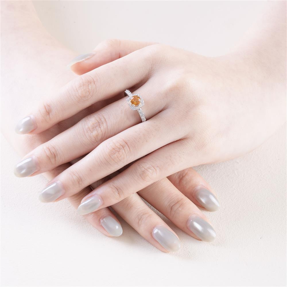 Sắc cam vàng rực rỡ giúp mang lại năng lượng tích cực, thu hút tài lộc. Thiết kế halo kim cương tôn màu đá, sang trọng mà vẫn trẻ trung tuyệt đối.