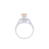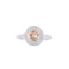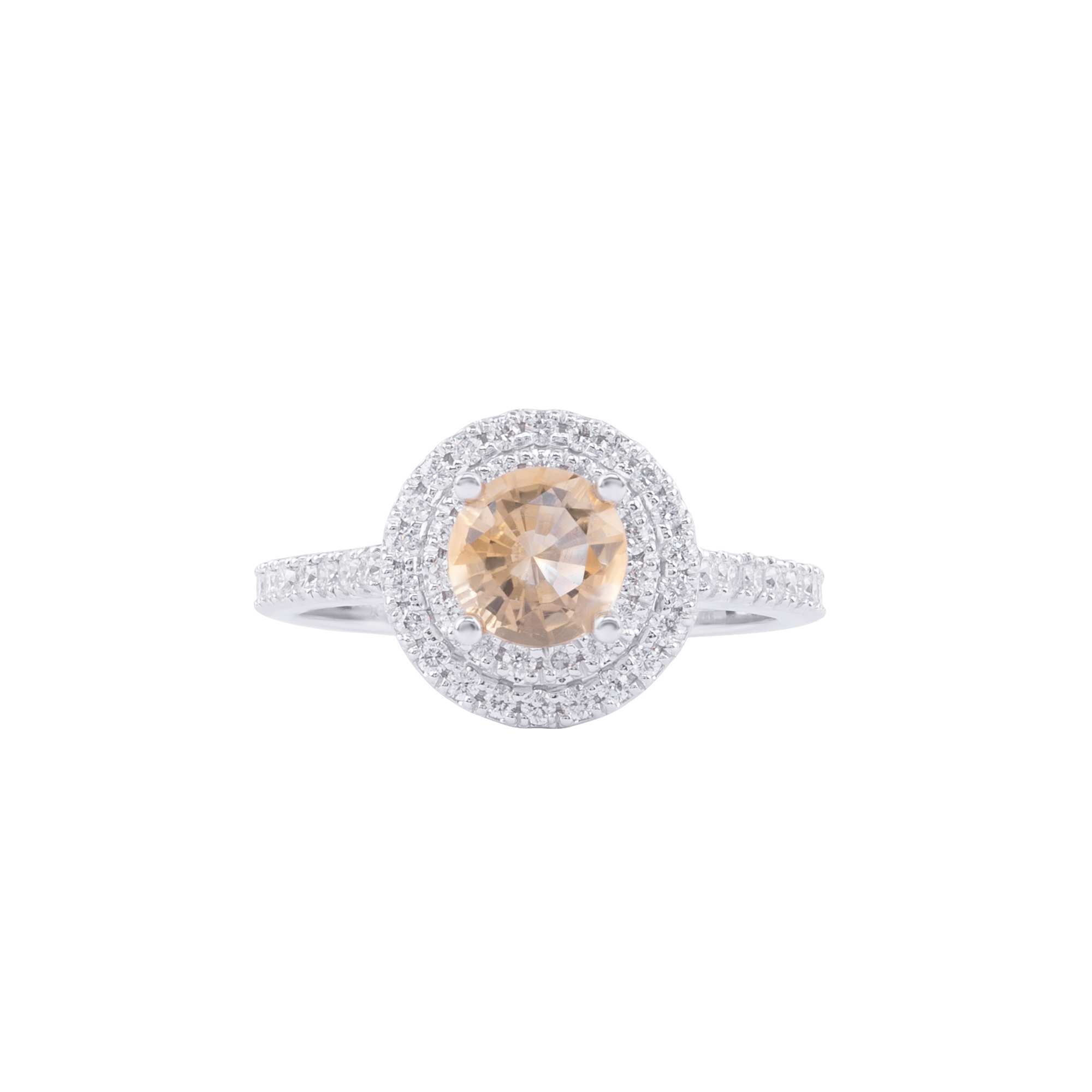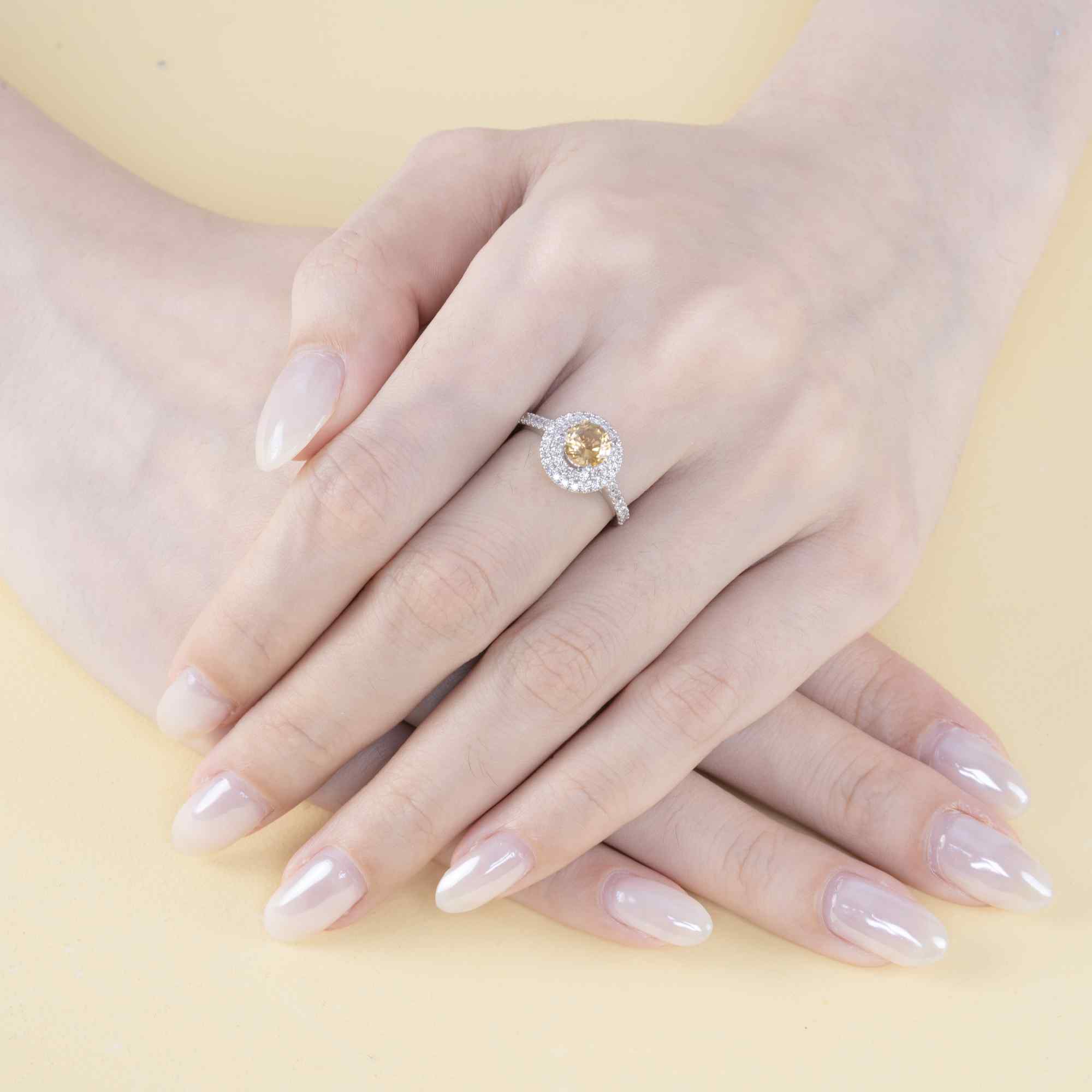 Mẫu nhẫn nổi bật với viên đá Citrine nhạt cắt tròn ở trung tâm – sắc vàng dịu nhẹ như ánh nắng ban mai, biểu tượng của may mắn, tươi mới và sự bình yên nội tại. Bao quanh là hai vòng halo đính đá trắng tinh xảo, tạo hiệu ứng ánh sáng lan tỏa, giúp viên đá chủ thêm phần nổi bật và lấp lánh.