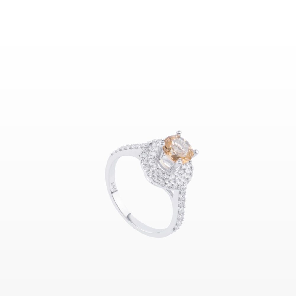 Mẫu nhẫn nổi bật với viên đá Citrine nhạt cắt tròn ở trung tâm – sắc vàng dịu nhẹ như ánh nắng ban mai, biểu tượng của may mắn, tươi mới và sự bình yên nội tại. Bao quanh là hai vòng halo đính đá trắng tinh xảo, tạo hiệu ứng ánh sáng lan tỏa, giúp viên đá chủ thêm phần nổi bật và lấp lánh.