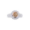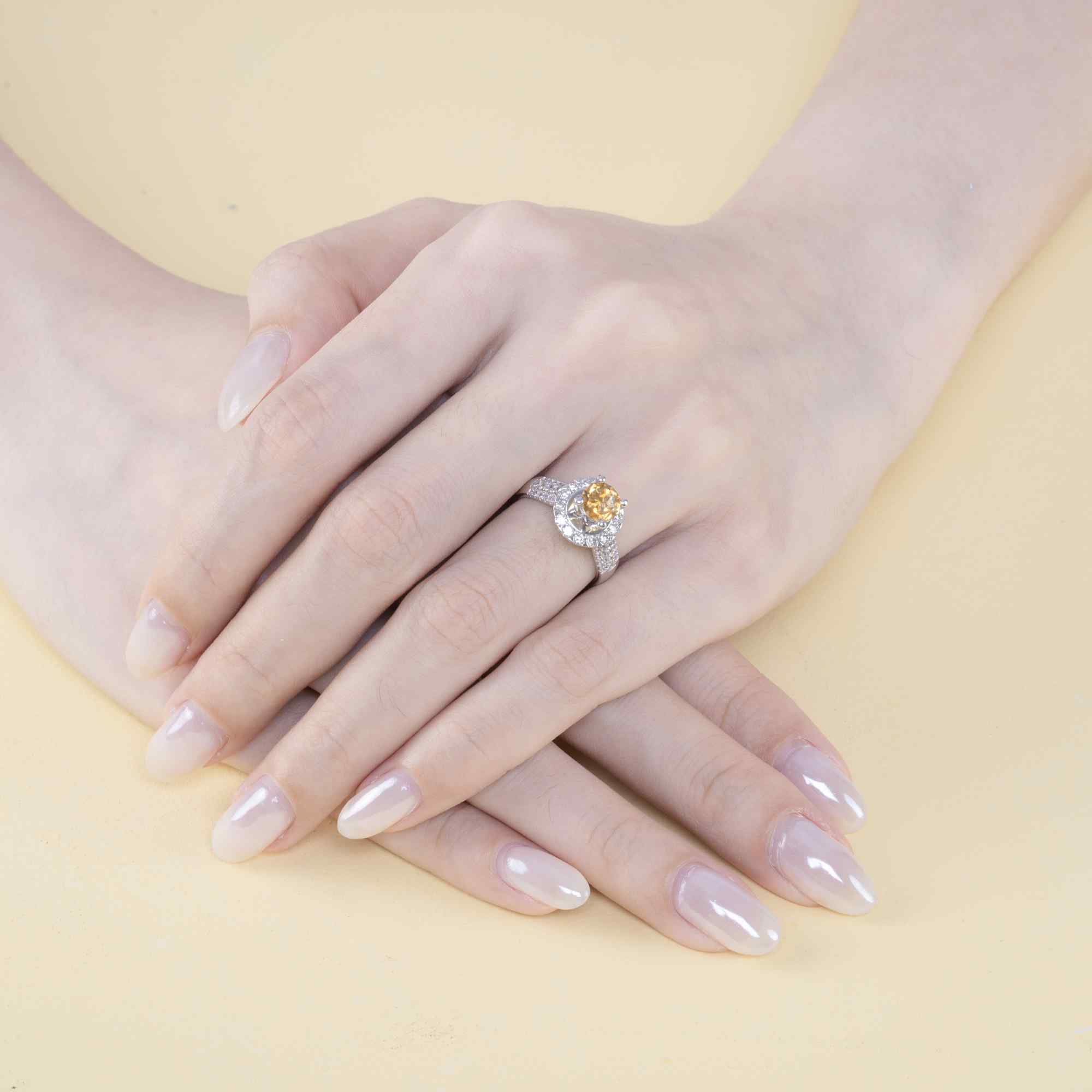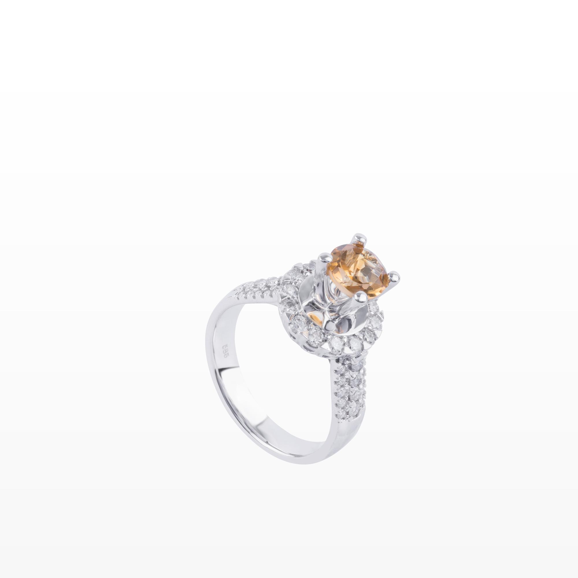 Chiếc nhẫn thu hút mọi ánh nhìn với viên đá Citrine màu vàng mật ong ở trung tâm – biểu tượng của tài lộc, sự sáng suốt và năng lượng tích cực. Viên đá được giữ chắc chắn bằng thiết kế chấu 4 nâng cao, bao quanh là vòng halo đính kim cương tấm rực rỡ, tạo hiệu ứng ánh sáng lan tỏa mạnh mẽ.