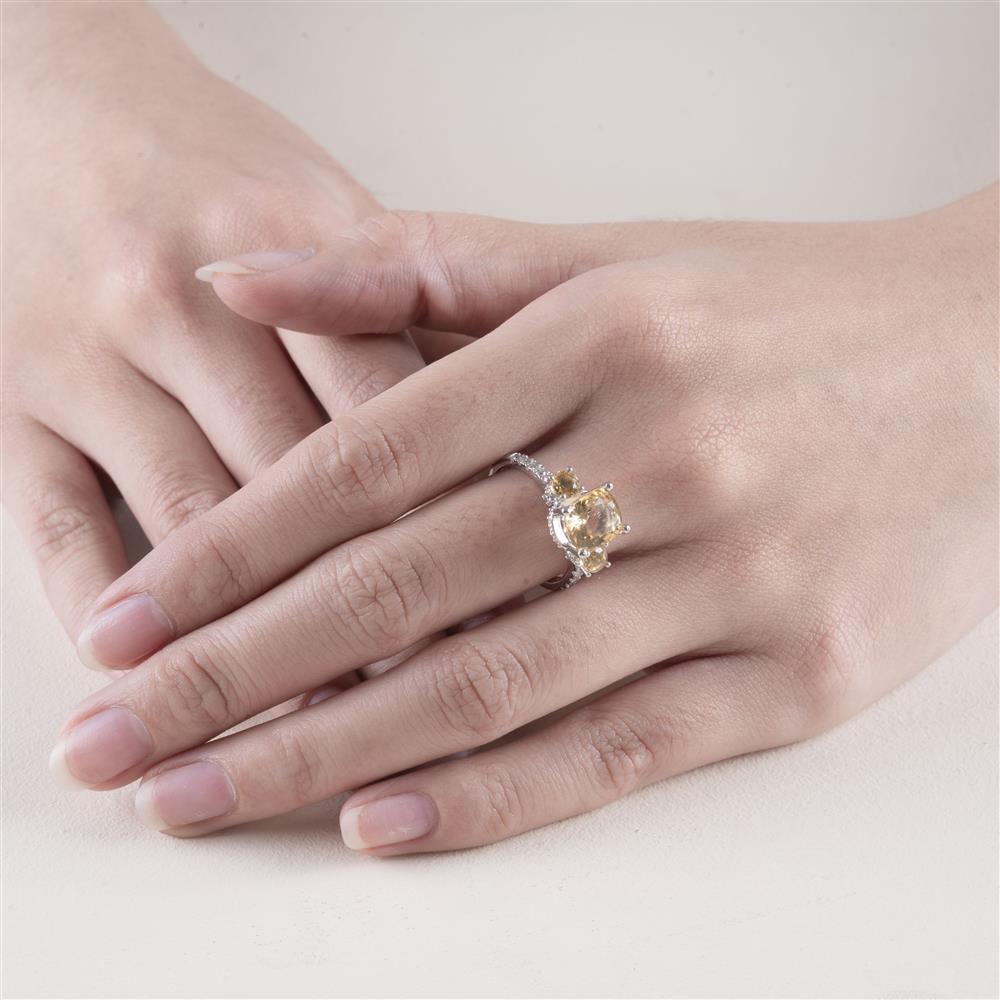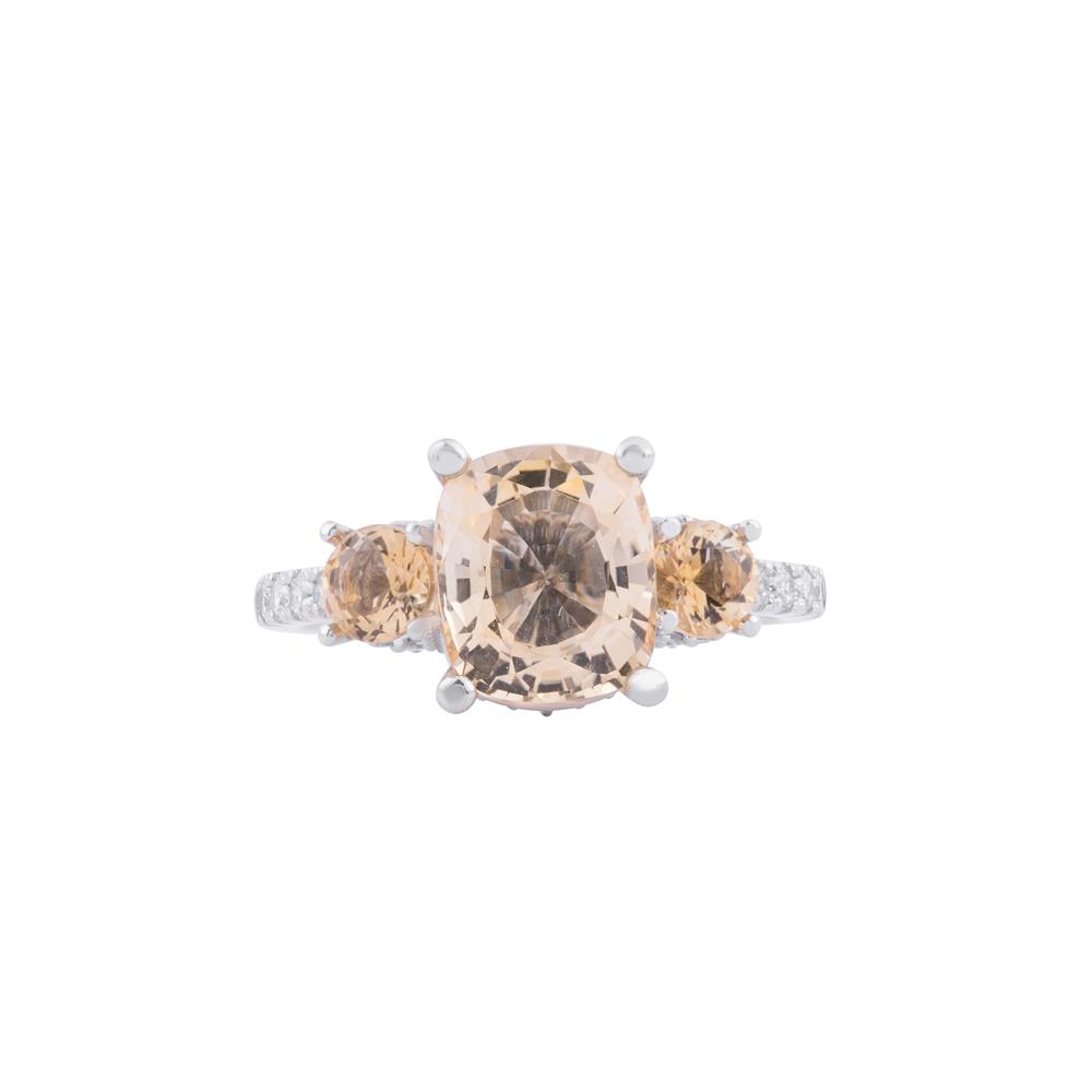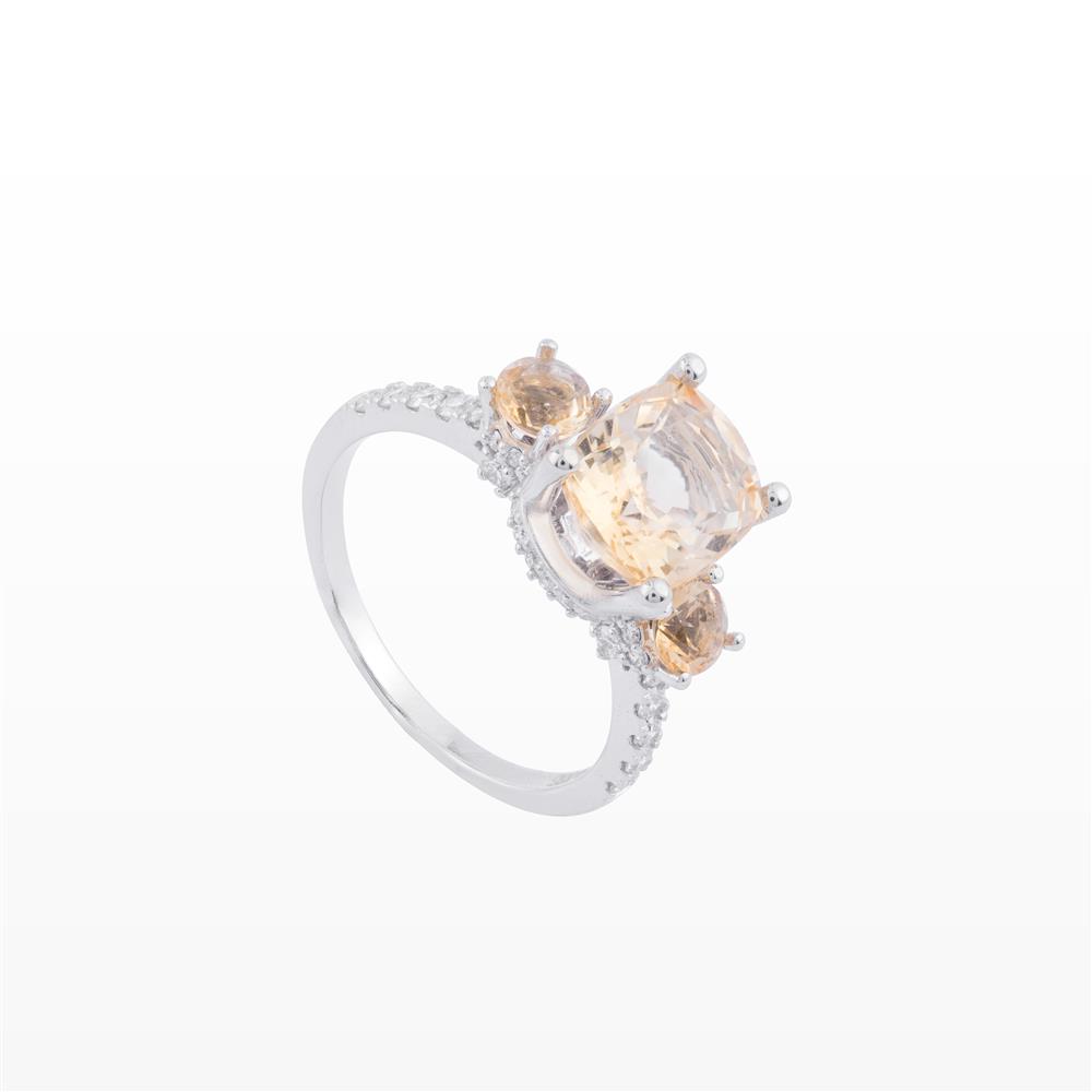 Chiếc nhẫn gây ấn tượng với viên đá màu trung tâm dáng oval bo góc mềm mại, sắc vàng champagne ấm áp, mang vẻ đẹp thanh lịch và cuốn hút. Viên đá được đính chấu chắc chắn, tôn cao độ trong và hiệu ứng ánh sáng, tạo cảm giác rực rỡ nhưng vẫn tinh tế.