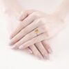 Thân nhẫn mảnh mai được viền kim cương tinh tế, làm nổi bật vẻ rực rỡ của viên đá chủ màu vàng mật ong ngọt ngào, tạo nên một tổng thể hài hòa và sang trọng.