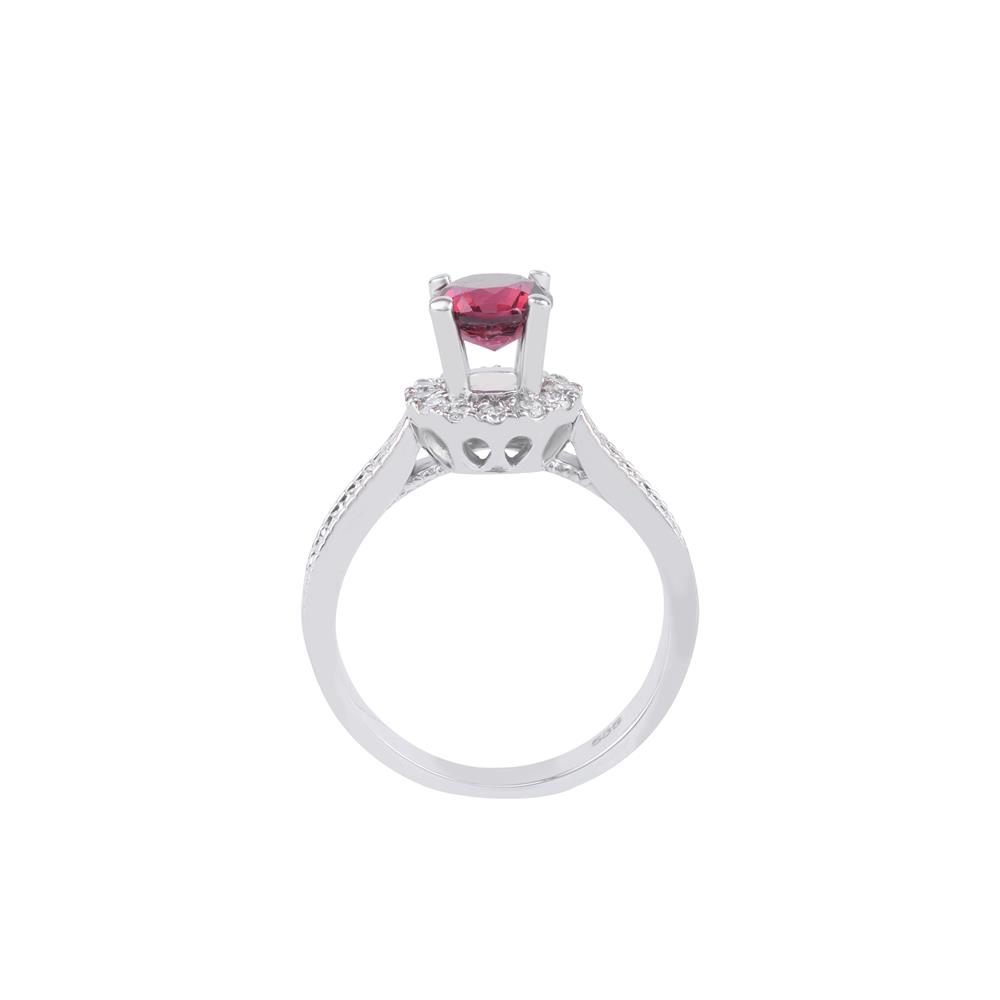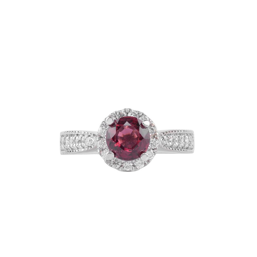 Viền quanh là những viên kim cương tươi sáng, phản chiếu ánh sáng lung linh, làm nổi bật sắc đỏ huyền bí – biểu tượng của trái tim rực lửa và nghị lực bền bỉ.