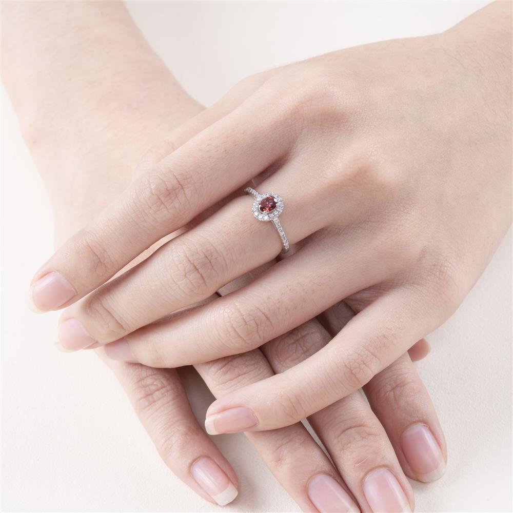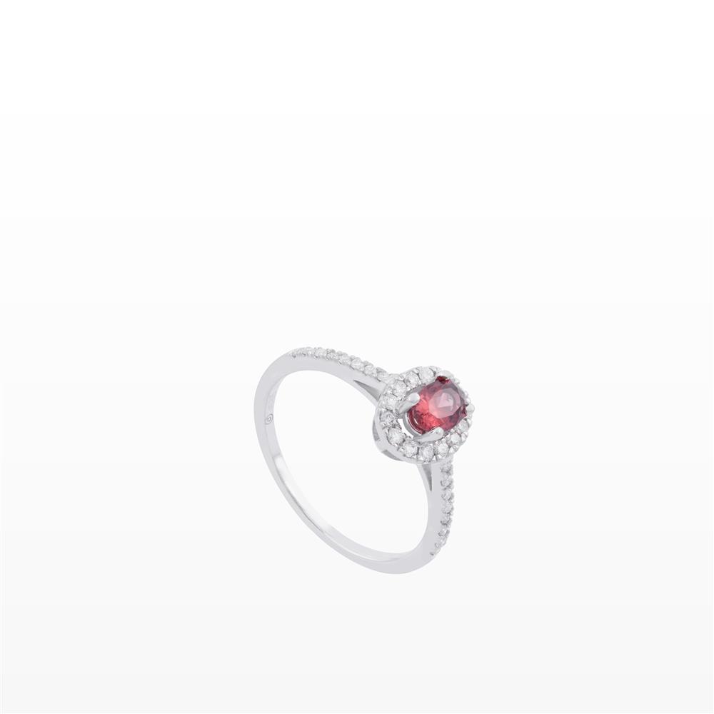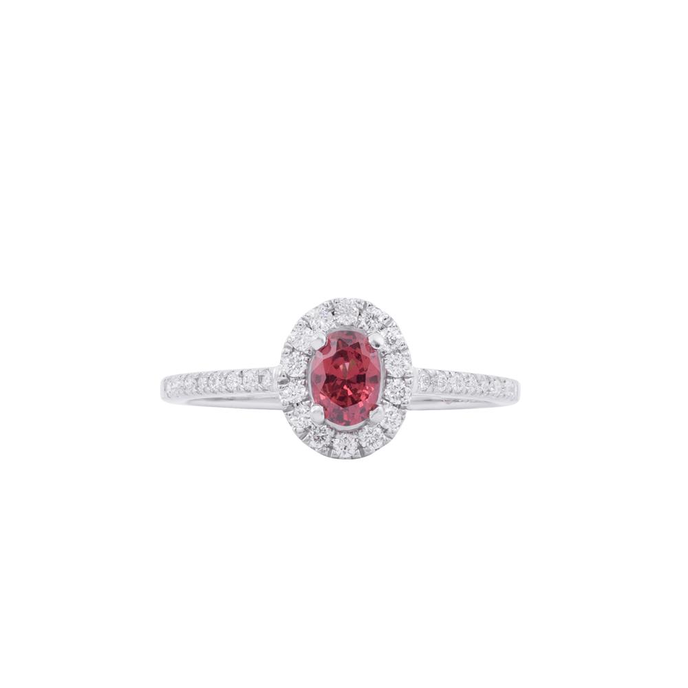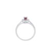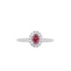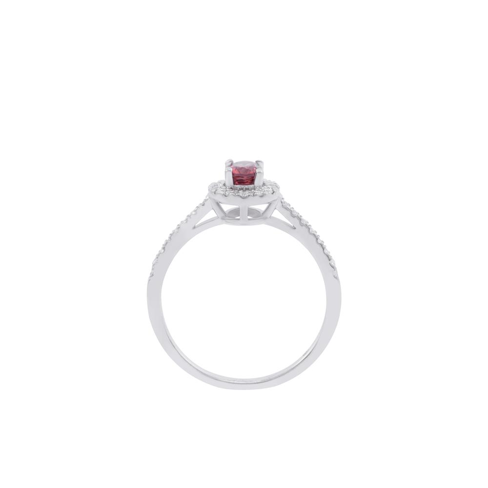 Vòng halo kim cương trắng bao quanh viên chủ giúp tăng độ rực rỡ, tạo hiệu ứng ánh sáng lan tỏa như một quầng sáng ôm trọn sắc đỏ quý phái. Thân nhẫn thanh mảnh đính kim cương tấm chạy dọc hai bên, mang đến sự cân bằng hoàn hảo giữa sự tinh tế và sự nổi bật.
