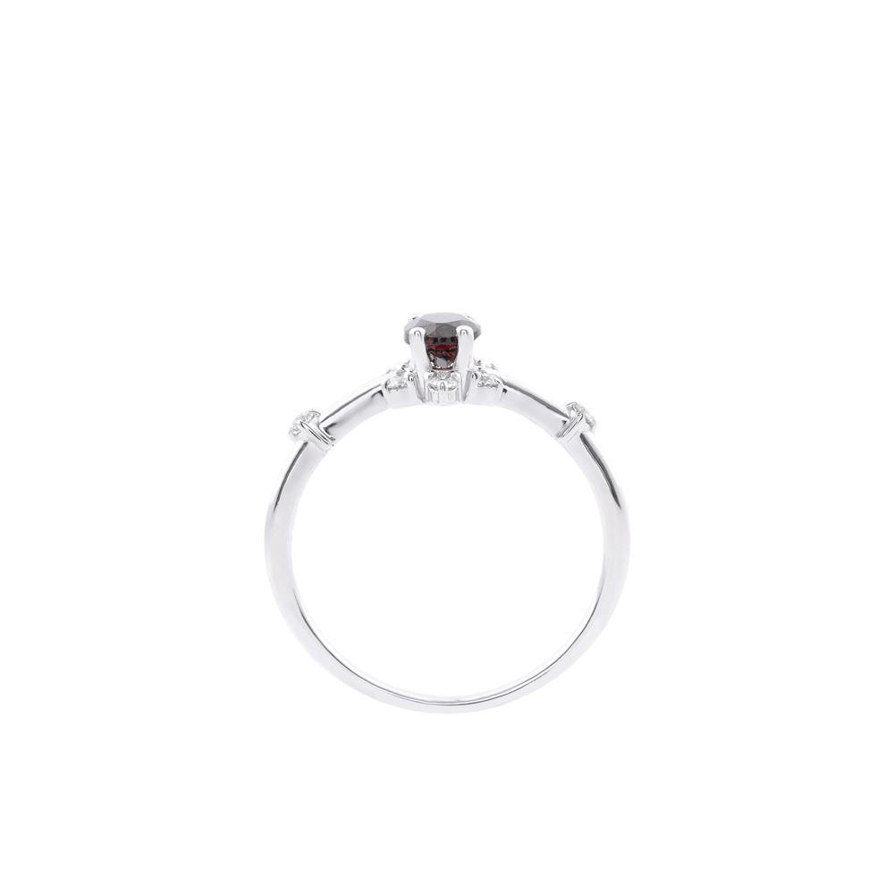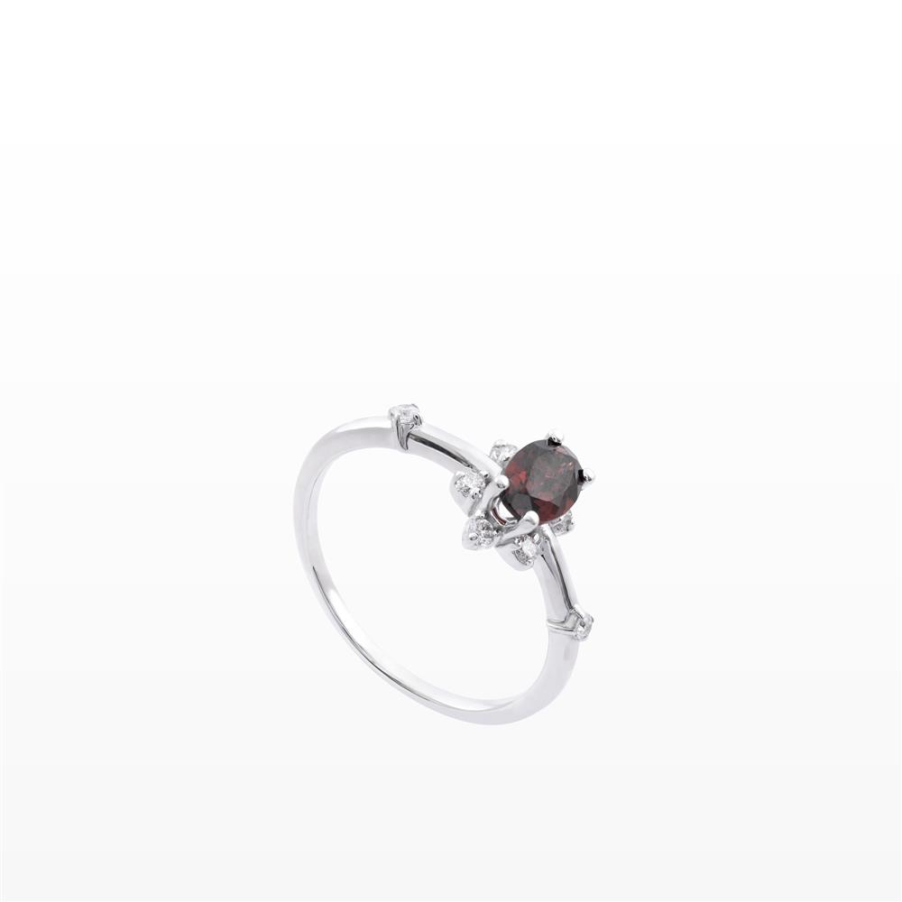 Thiết kế nhẫn nổi bật với viên đá màu đỏ dáng oval đặt ở trung tâm, sắc đỏ trầm sâu cuốn hút, tôn lên vẻ đẹp quyến rũ và khí chất riêng. Bao quanh viên đá chủ là các viên kim cương tấm được đính cân xứng như những điểm sáng tinh tế, giúp tăng độ lấp lánh và làm nổi bật chiều sâu màu sắc của đá.