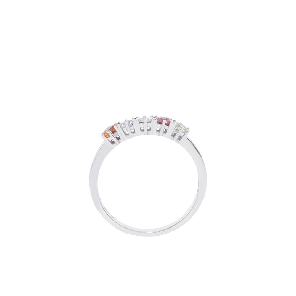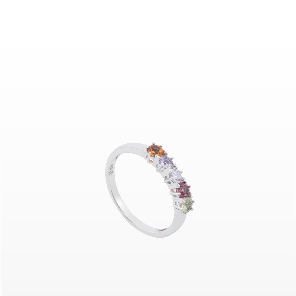 Mẫu nhẫn mang đến năng lượng tươi vui với sự kết hợp hài hòa của những viên đá màu đa sắc: vàng cam rực rỡ, tím dịu dàng, hồng ngọt ngào và xanh olive thanh mát. Mỗi sắc màu là một cảm xúc — khi đặt cạnh nhau tạo nên một dải ánh sáng rực rỡ đầy sinh khí.