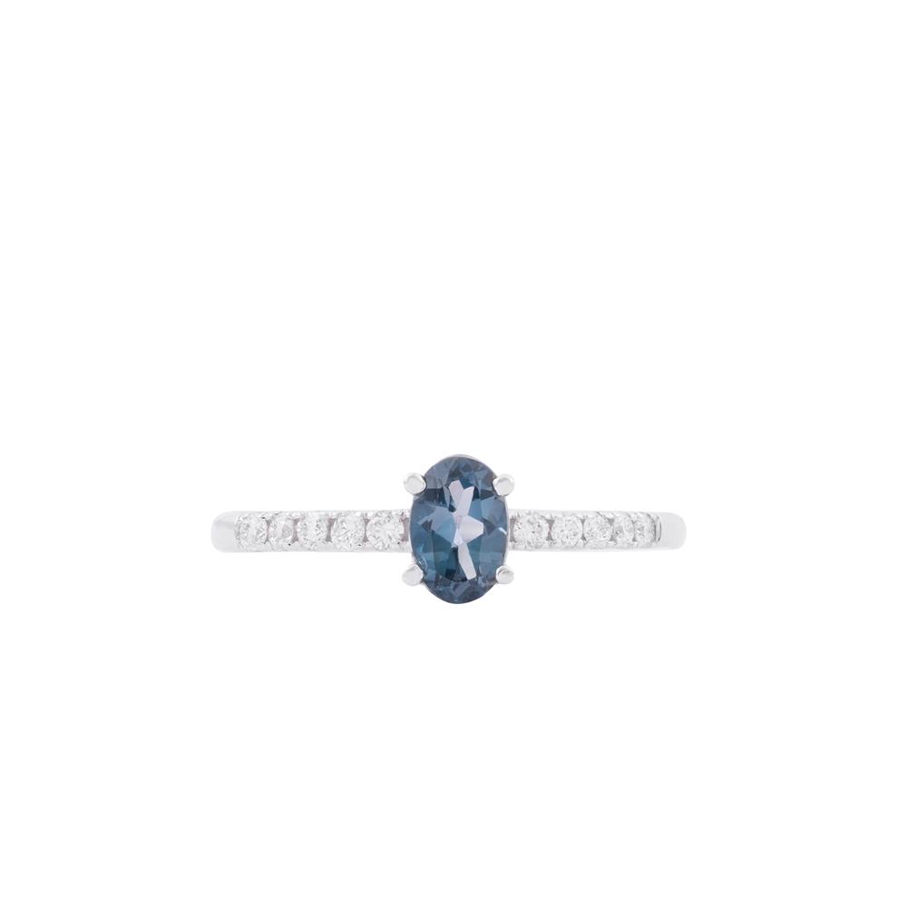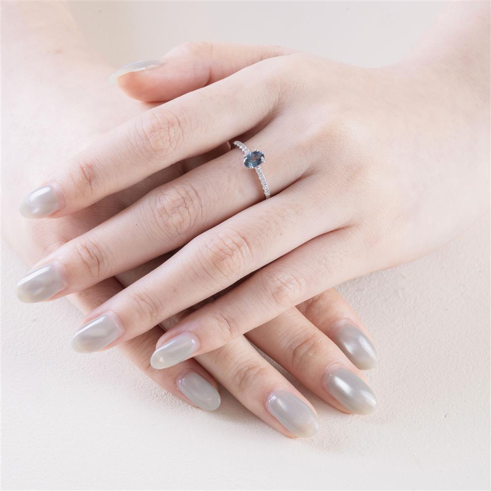 Chiếc nhẫn sở hữu viên sapphire xanh than dáng oval – sắc xanh trầm lắng, sâu như bầu trời đêm, mang đến cảm giác bí ẩn và cuốn hút. Ánh xanh chuyển màu nhẹ theo từng góc nhìn, tạo chiều sâu sang trọng đặc trưng chỉ sapphire tự nhiên mới có.