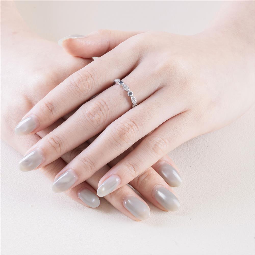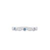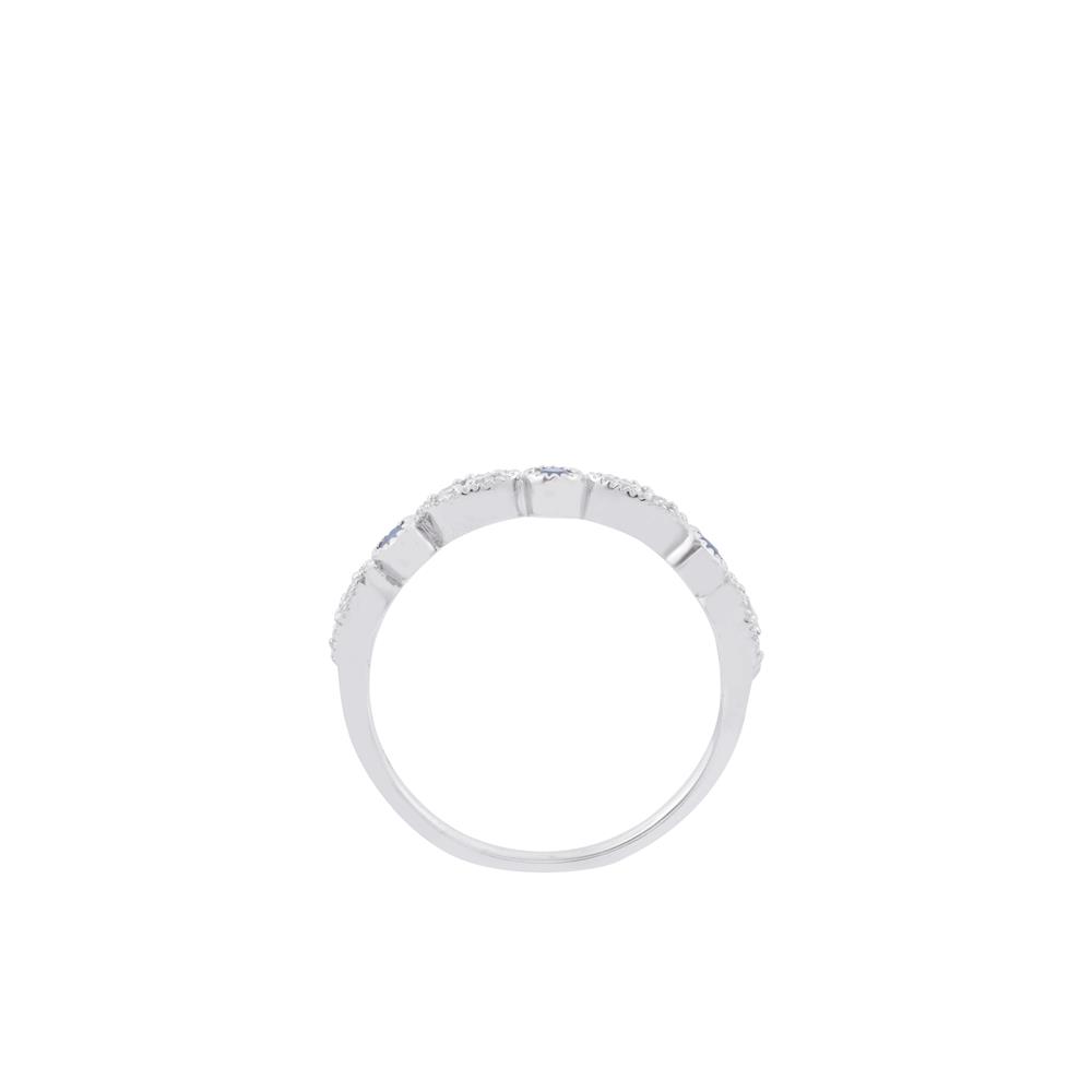 Chiếc nhẫn được chế tác theo phong cách vintage tinh xảo, nổi bật với các mắt đá hình giọt lệ và oval liên kết liền mạch như một dải hoa văn cổ điển. Ở mỗi điểm nhấn là viên blue topaz xanh dịu, sắc xanh mang đến cảm giác trong trẻo, nhẹ nhàng như ánh nắng phản chiếu trên mặt biển.