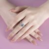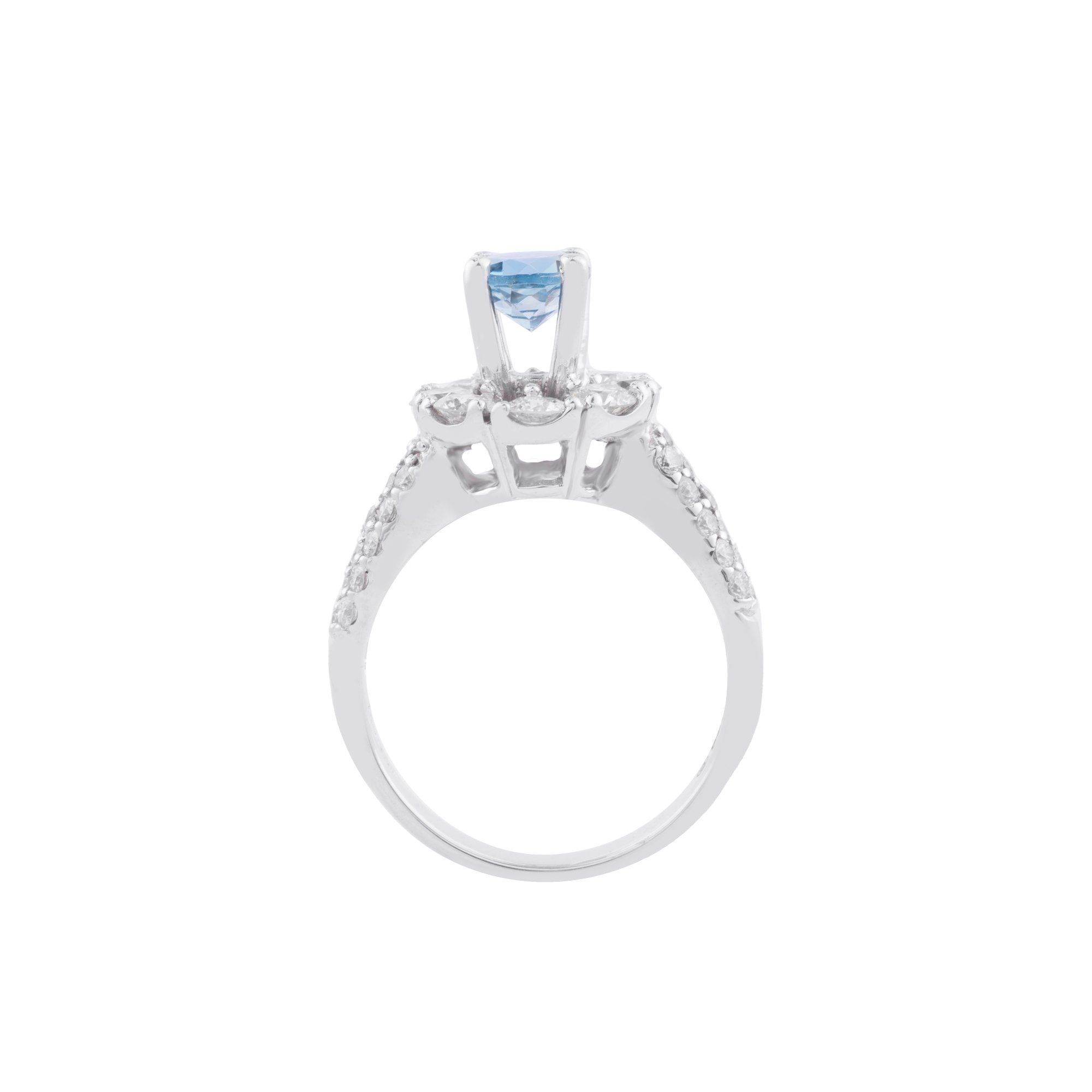 Tựa như một giọt yêu thương đọng lại nơi đầu ngón tay, chiếc nhẫn nổi bật với viên đá xanh ở trung tâm – trong trẻo, sâu lắng và đầy cuốn hút. Bao quanh là vòng kim cương halo lấp lánh, nâng đỡ sắc xanh dịu dàng như những cánh hoa ôm trọn một trái tim đang khẽ rung.