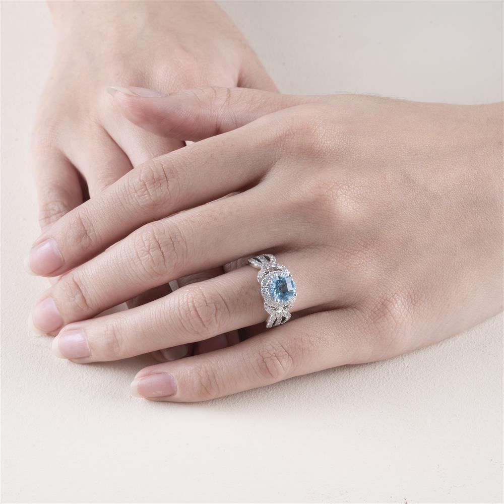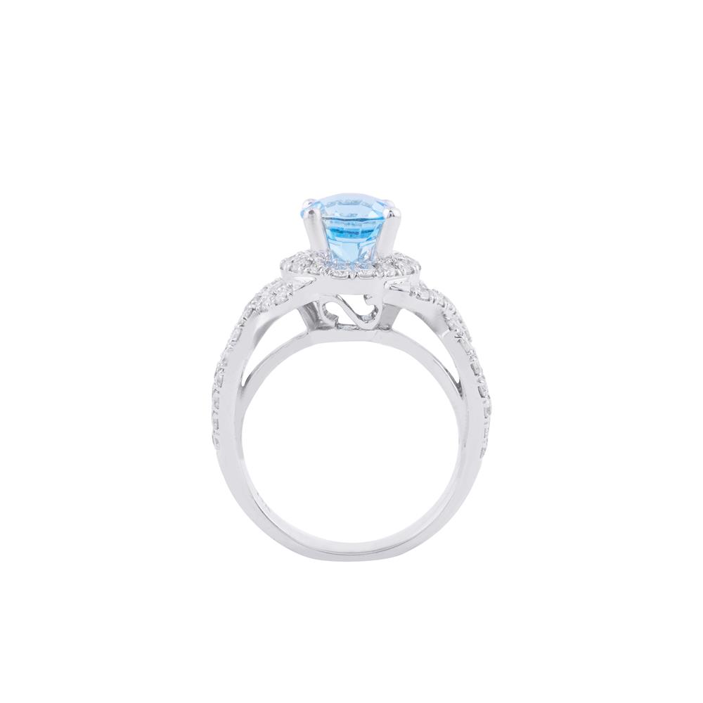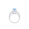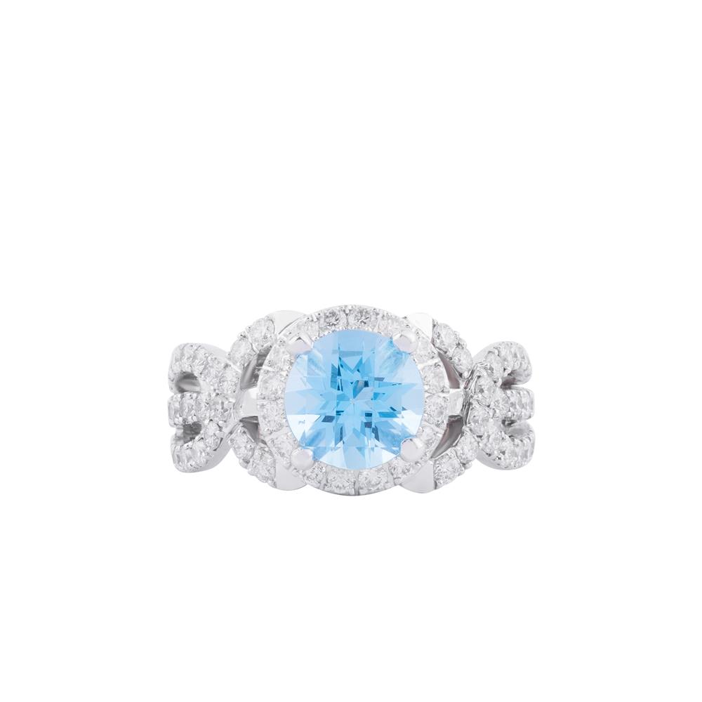 Chiếc nhẫn gây ấn tượng mạnh với viên đá xanh trung tâm cắt tròn rực rỡ, mang sắc xanh trong trẻo và cuốn hút, tượng trưng cho sự bình an, trí tuệ và năng lượng tích cực. Viên đá được bao quanh bởi vòng kim cương halo lấp lánh, giúp tăng hiệu ứng ánh sáng và làm nổi bật vẻ đẹp sâu thẳm của đá chủ.