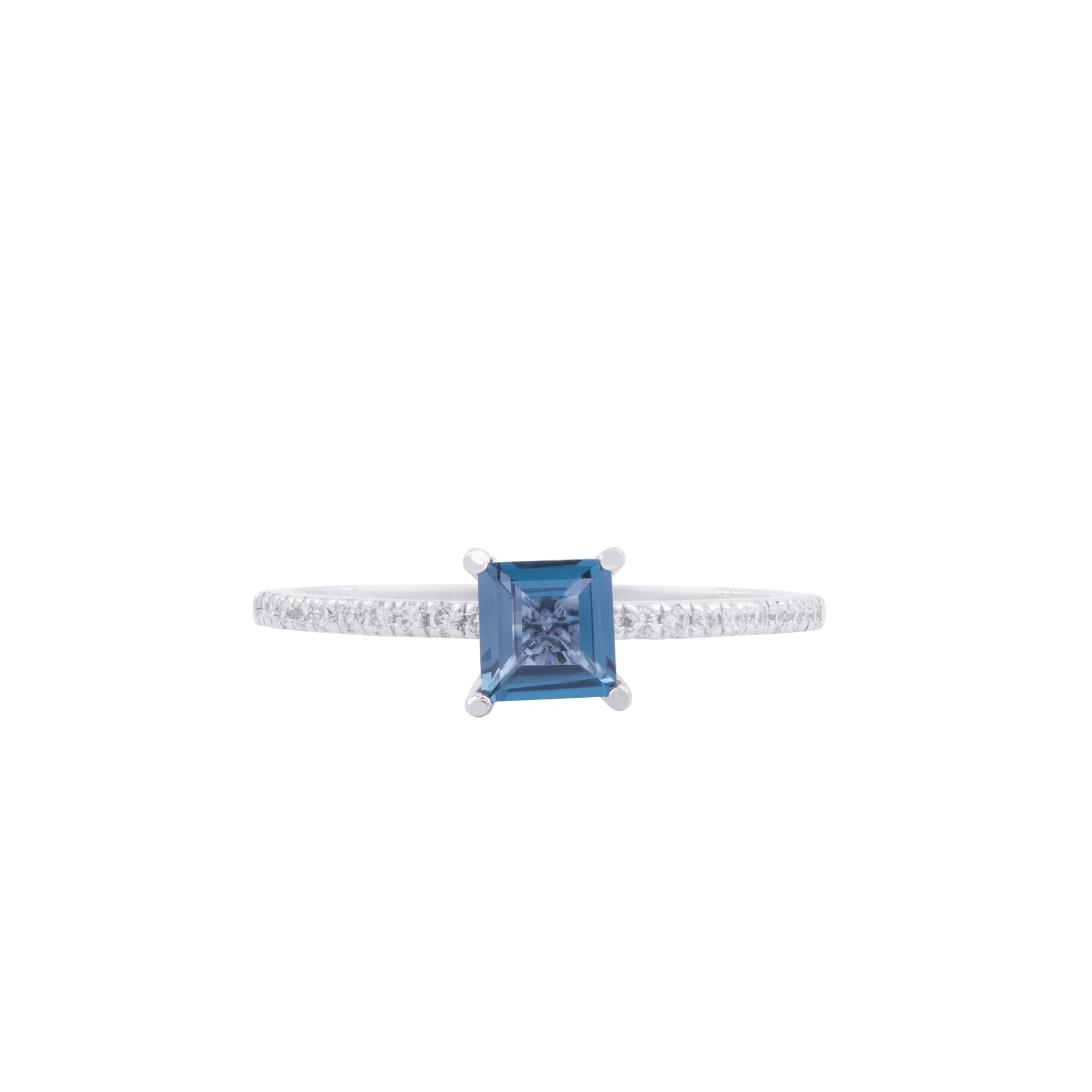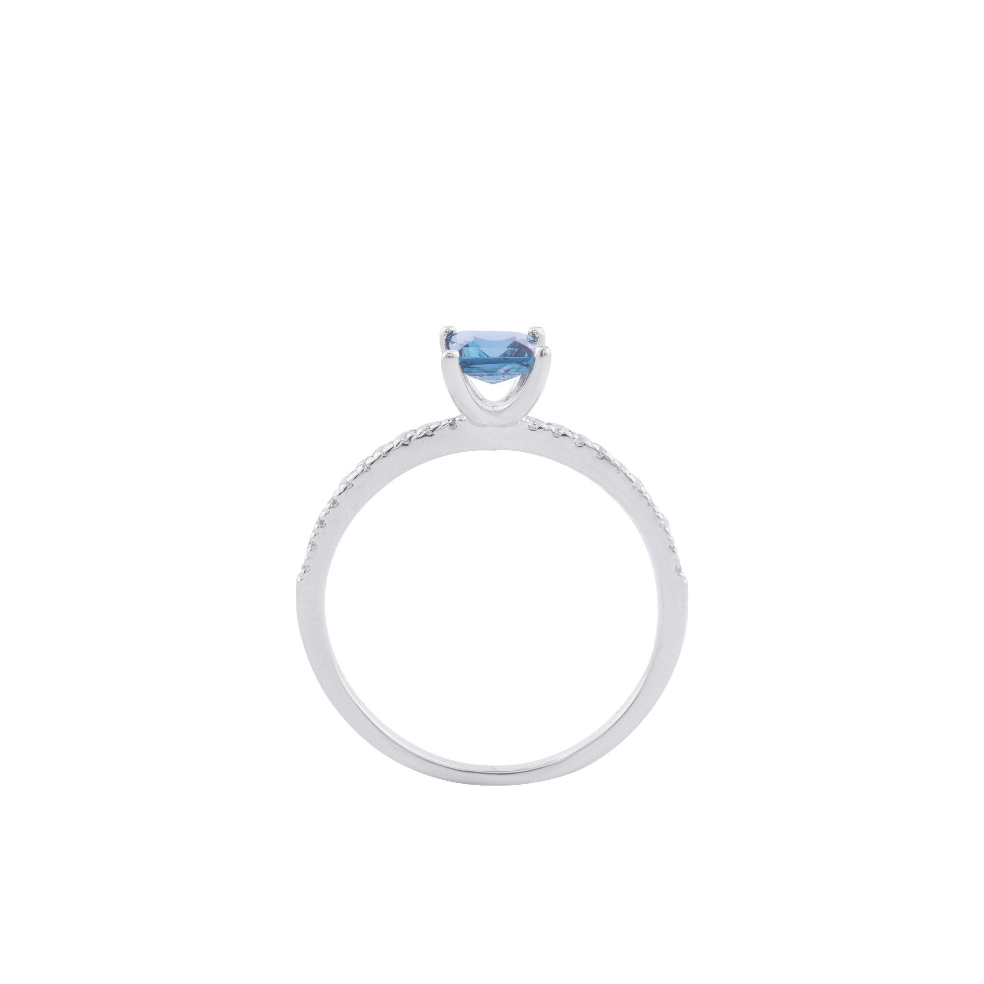 Viên đá xanh nổi bật ở trung tâm như đại dương lắng sâu, phản chiếu cảm xúc chân thành và bình yên. Dải kim cương nhỏ lấp lánh dọc thân nhẫn nhẹ nhàng nâng đỡ, tôn vinh khoảnh khắc khi yêu thương được đặt trọn vào một lời hứa.