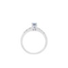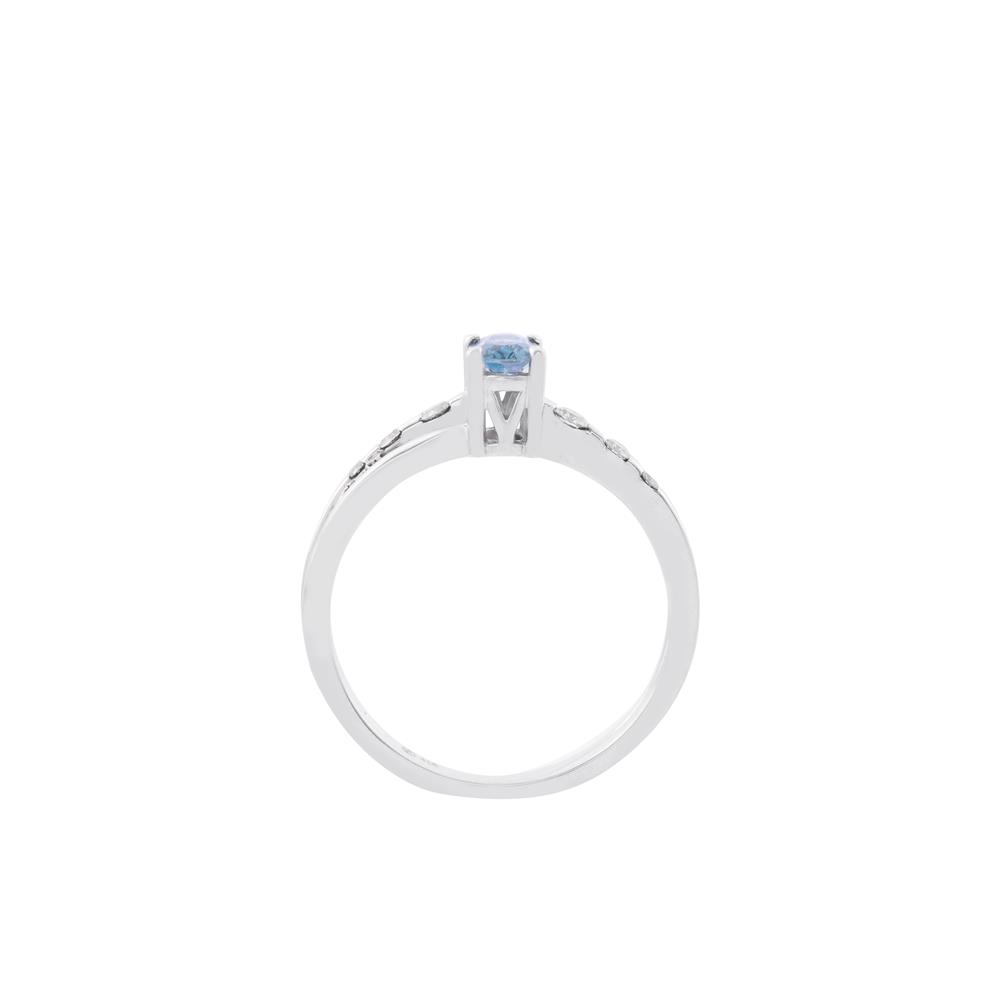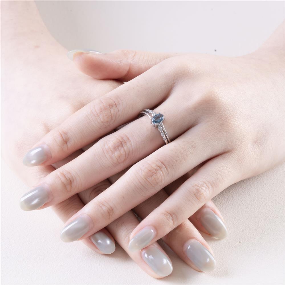 Chiếc nhẫn mang thiết kế thanh mảnh nhưng vô cùng tinh xảo, nổi bật với viên đá xanh hình oval ở trung tâm. Sắc xanh trong veo, nhẹ nhàng như mặt nước buổi sớm, tạo cảm giác bình yên, thư thái nhưng vẫn đầy cuốn hút.