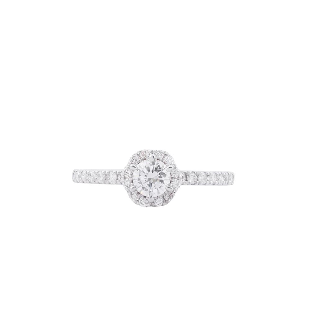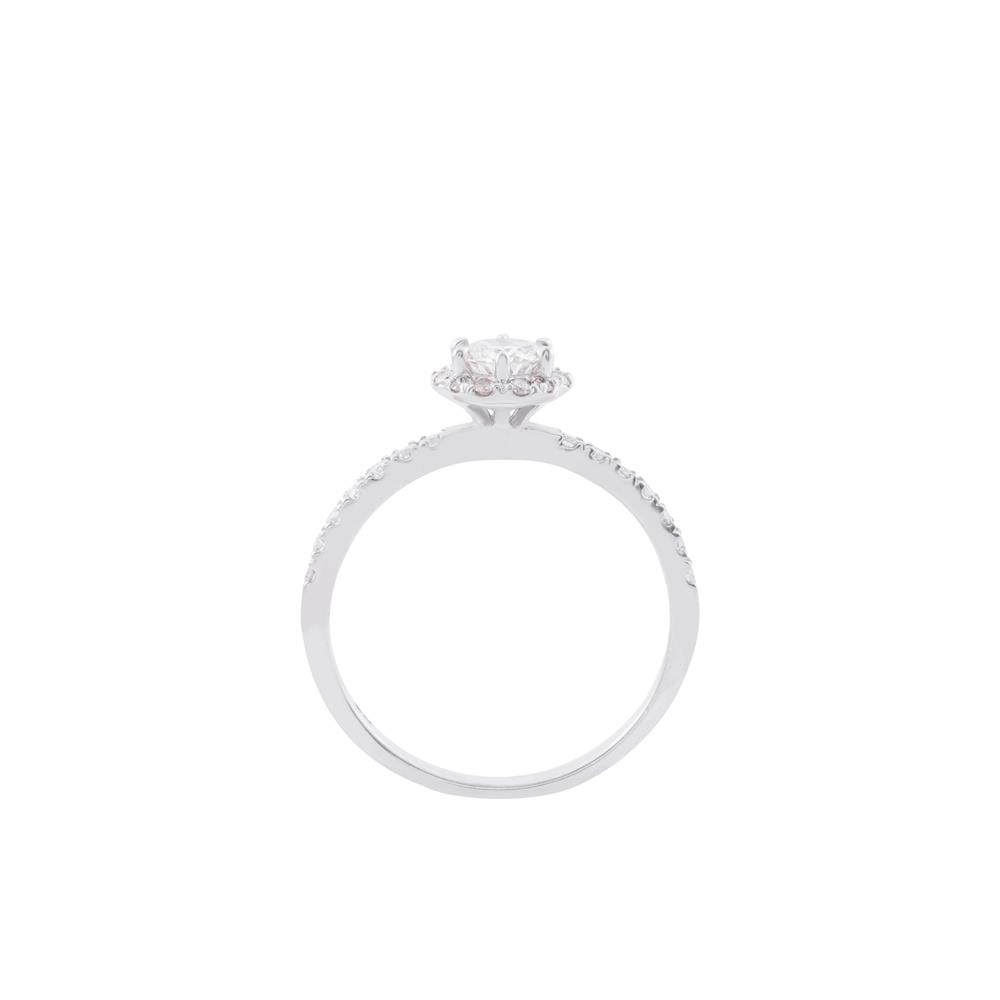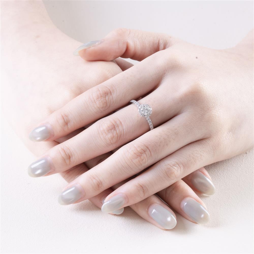 Thiết kế halo kinh điển được nâng tầm với viên kim cương chủ lấp lánh ở vị trí trung tâm, tỏa sáng mạnh mẽ như một điểm hội tụ của yêu thương. Vòng halo kim cương bao quanh giúp hiệu ứng ánh sáng lan rộng hơn, tạo cảm giác viên chủ to và rực rỡ hơn hẳn – mỗi chuyển động bàn tay đều bừng lên một quầng sáng mềm mại, sang trọng tuyệt đối.