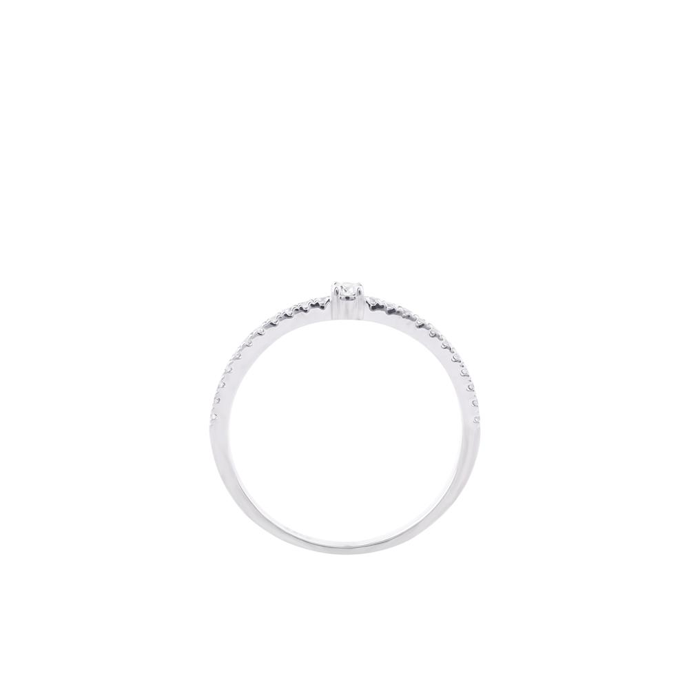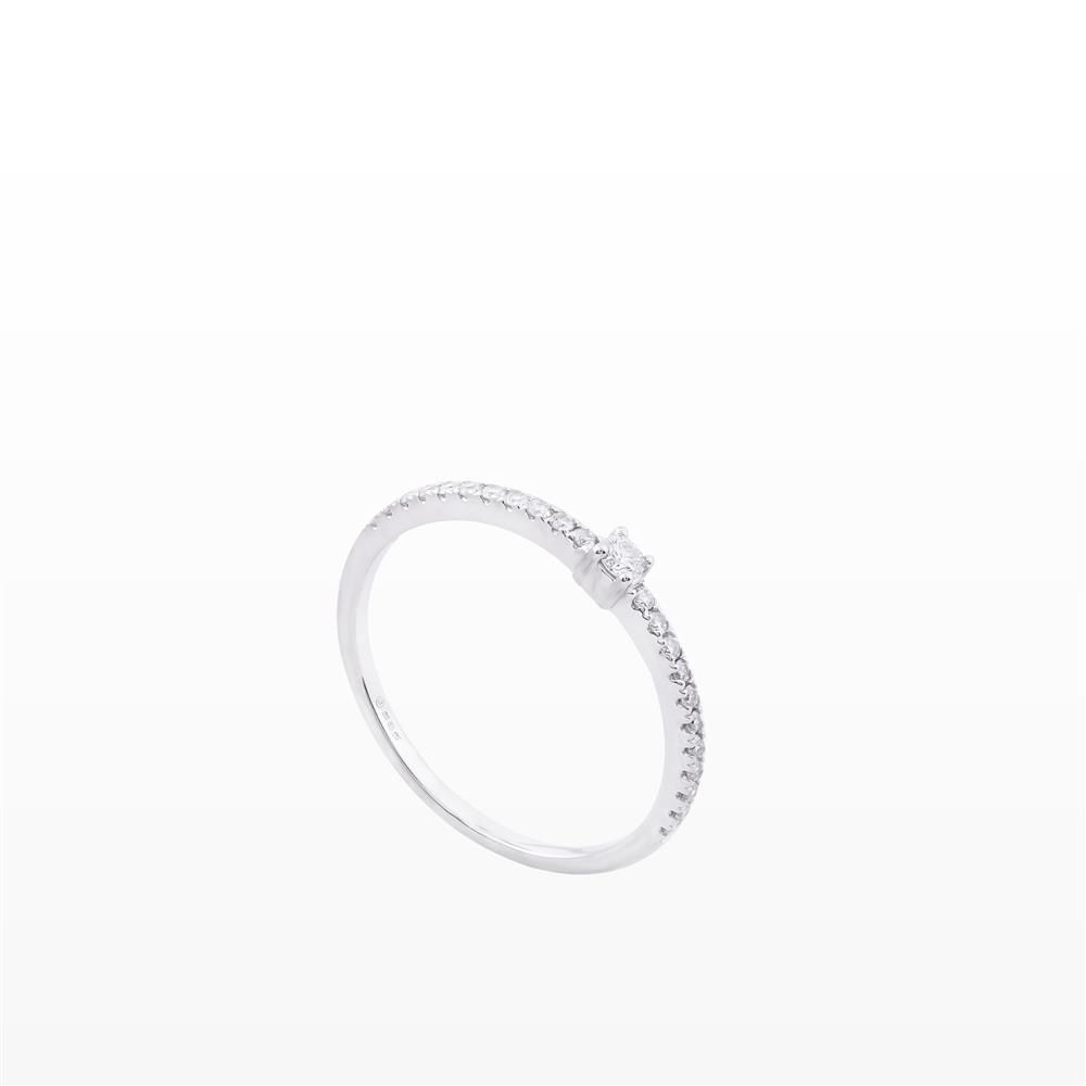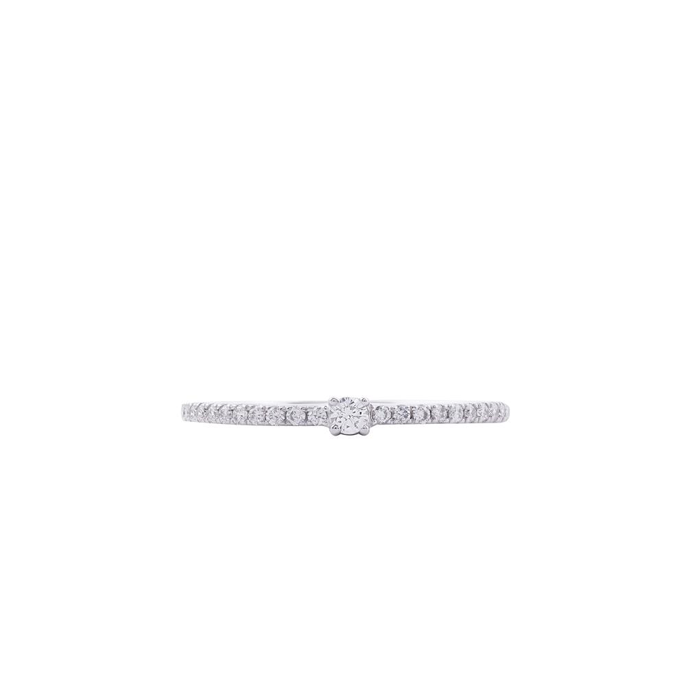 Chiếc nhẫn kim cương mang thiết kế thanh mảnh, hiện đại với dải kim cương nhỏ được nạm đều dọc theo thân nhẫn, tạo hiệu ứng lấp lánh nhẹ nhàng và liên tục. Điểm nhấn là viên kim cương chủ được đính tinh gọn ở vị trí trung tâm, vừa đủ nổi bật nhưng vẫn giữ trọn sự thanh lịch.