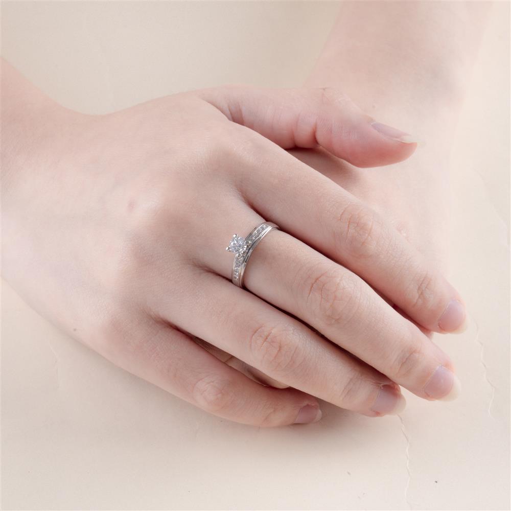 Mẫu nhẫn solitaire nổi bật với viên kim cương chủ tỏa sáng ở trung tâm, được nâng đỡ bằng 4 chấu vững chắc. Đặc biệt, thân nhẫn được đính thêm các viên tấm nhỏ tỉ mỉ, tạo nên hiệu ứng ánh sáng rực rỡ, giúp đôi tay nàng thêm phần kiêu hãnh và lấp lánh.