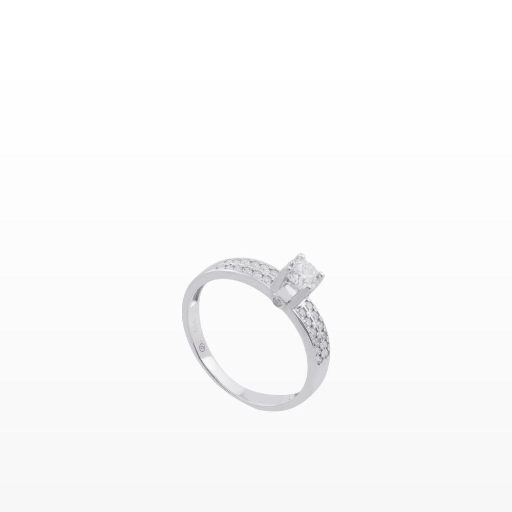 Thiết kế nổi bật với viên kim cương tròn trung tâm được nâng đỡ bởi hệ chấu chắc chắn, đón trọn ánh sáng để tỏa ra vẻ rực rỡ thuần khiết. Bao quanh là hai hàng kim cương tấm song song trên thân nhẫn, tạo hiệu ứng double pavé lấp lánh đầy cuốn hút.