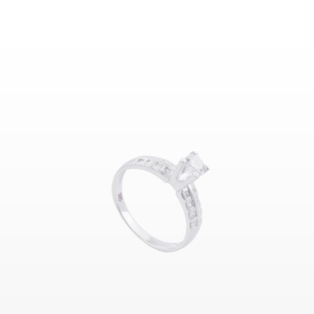 Thiết kế nổi bật với viên kim cương tròn trung tâm tỏa sáng rực rỡ, được đặt giữa hai hàng kim cương dáng princess vuông vức nạm theo kiểu channel gọn gàng. Sự kết hợp giữa đường cắt tròn mềm mại và các giác cắt vuông sắc nét tạo nên hiệu ứng ánh sáng mạnh mẽ, rõ khối và đầy chiều sâu.