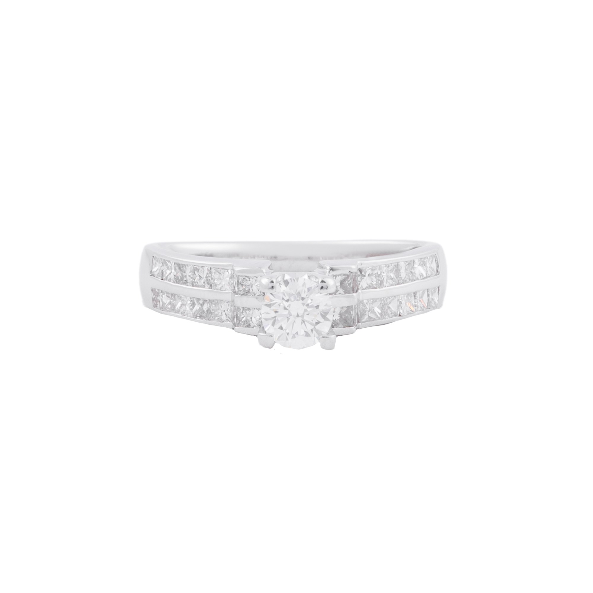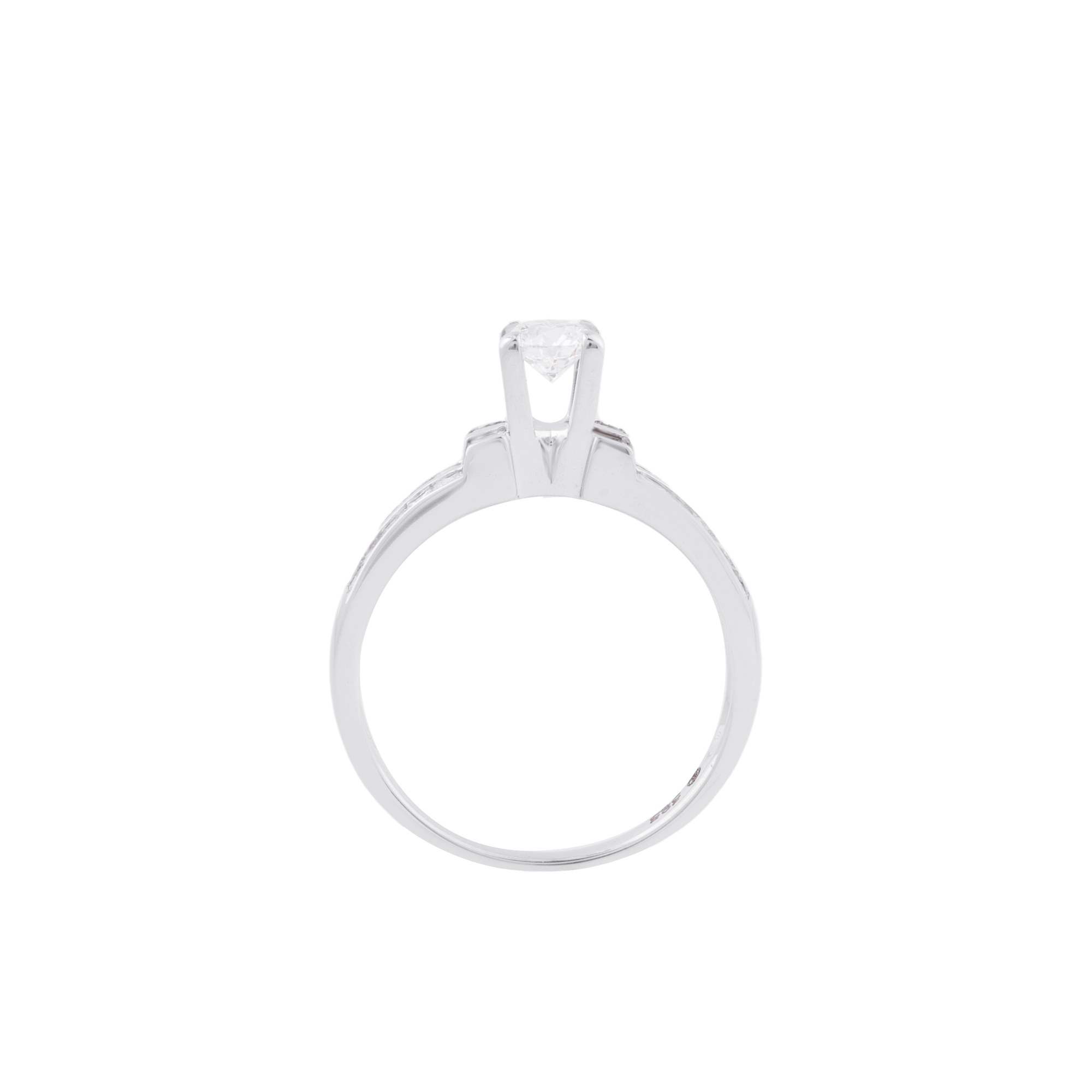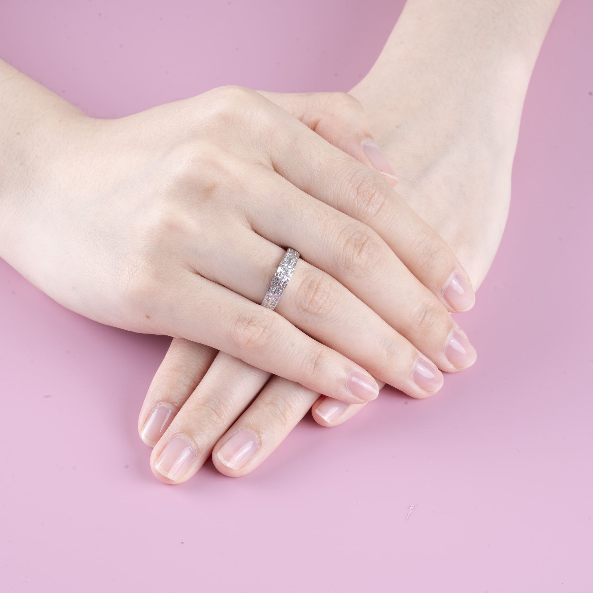 Chiếc nhẫn kim cương dáng solitaire cách điệu mang vẻ đẹp thanh lịch và đầy cuốn hút. Viên kim cương chủ được nâng cao tinh tế, tối ưu khả năng bắt sáng, tạo nên hiệu ứng lấp lánh rực rỡ. Điểm đặc biệt nằm ở phần đai nhẫn đính kim cương hai bên với thiết kế giao nhau mềm mại, vừa tăng chiều sâu thị giác vừa tôn lên vẻ hiện đại, khác biệt.