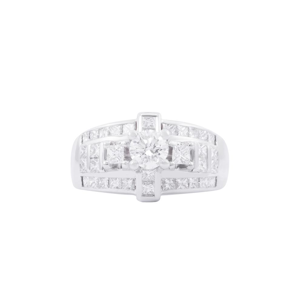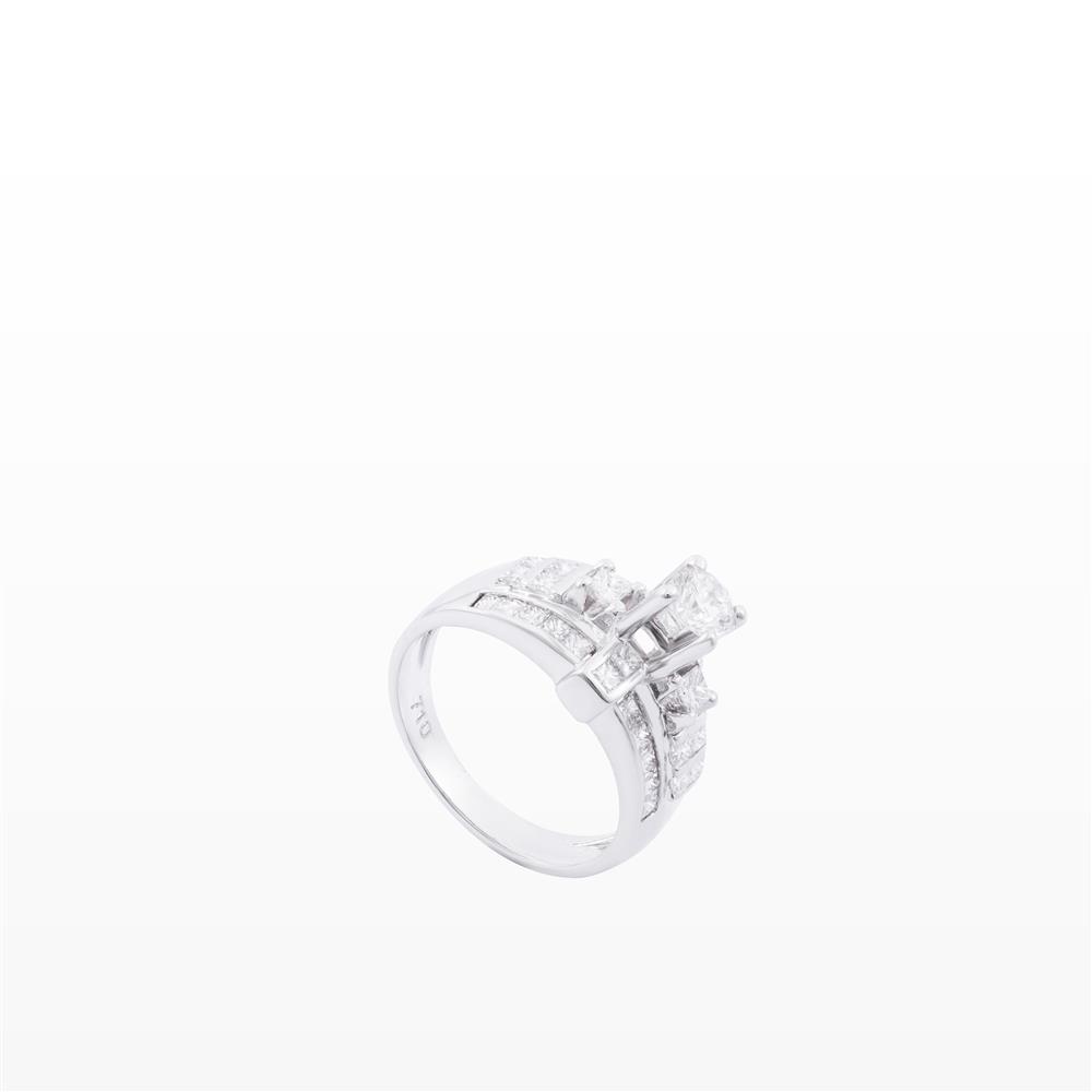Mẫu nhẫn nổi bật với thiết kế bản lớn đầy uy lực, kết hợp nghệ thuật giữa các viên kim cương Princess Cut và Round Cut. Trung tâm là viên kim cương tròn sáng rực, được bao bọc bởi những viên kim cương vuông được xếp tầng tinh xảo, tạo nên hiệu ứng lập thể mạnh mẽ và cực kỳ cuốn hút.