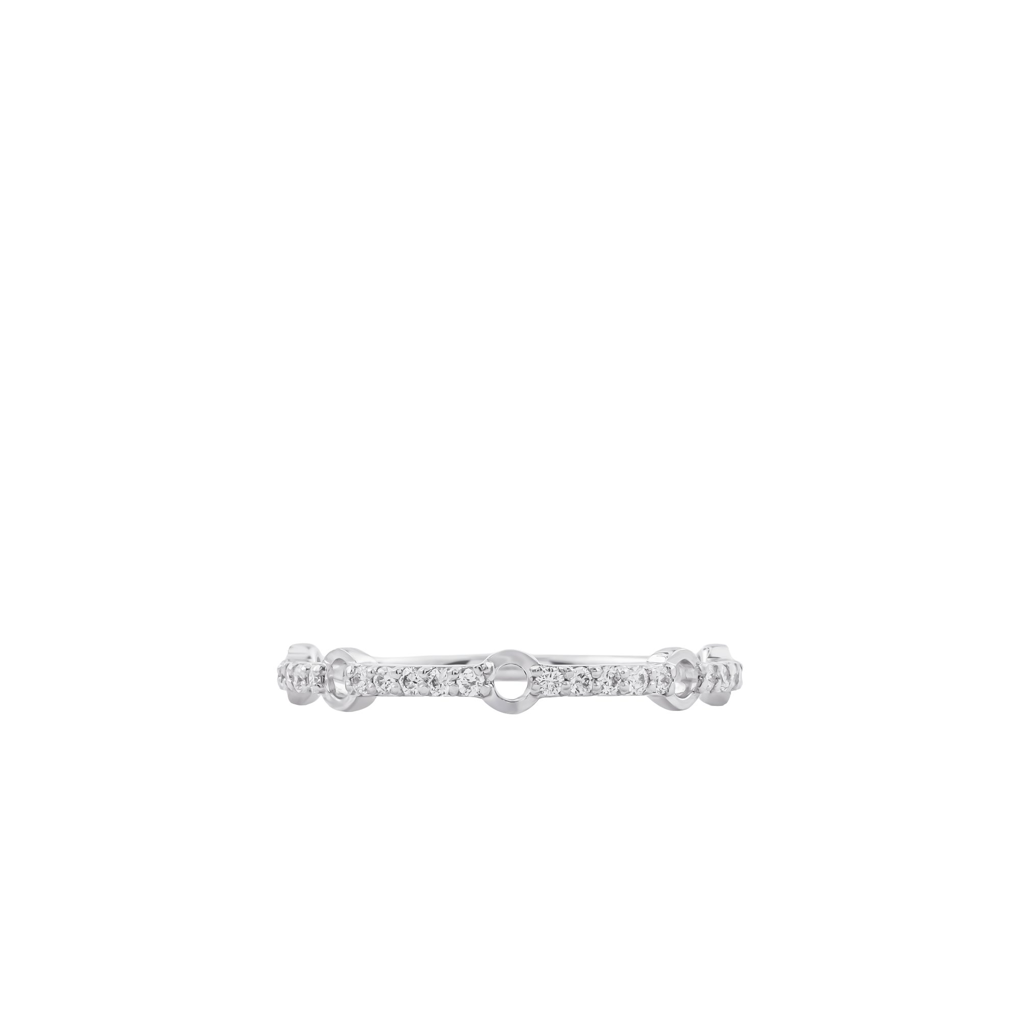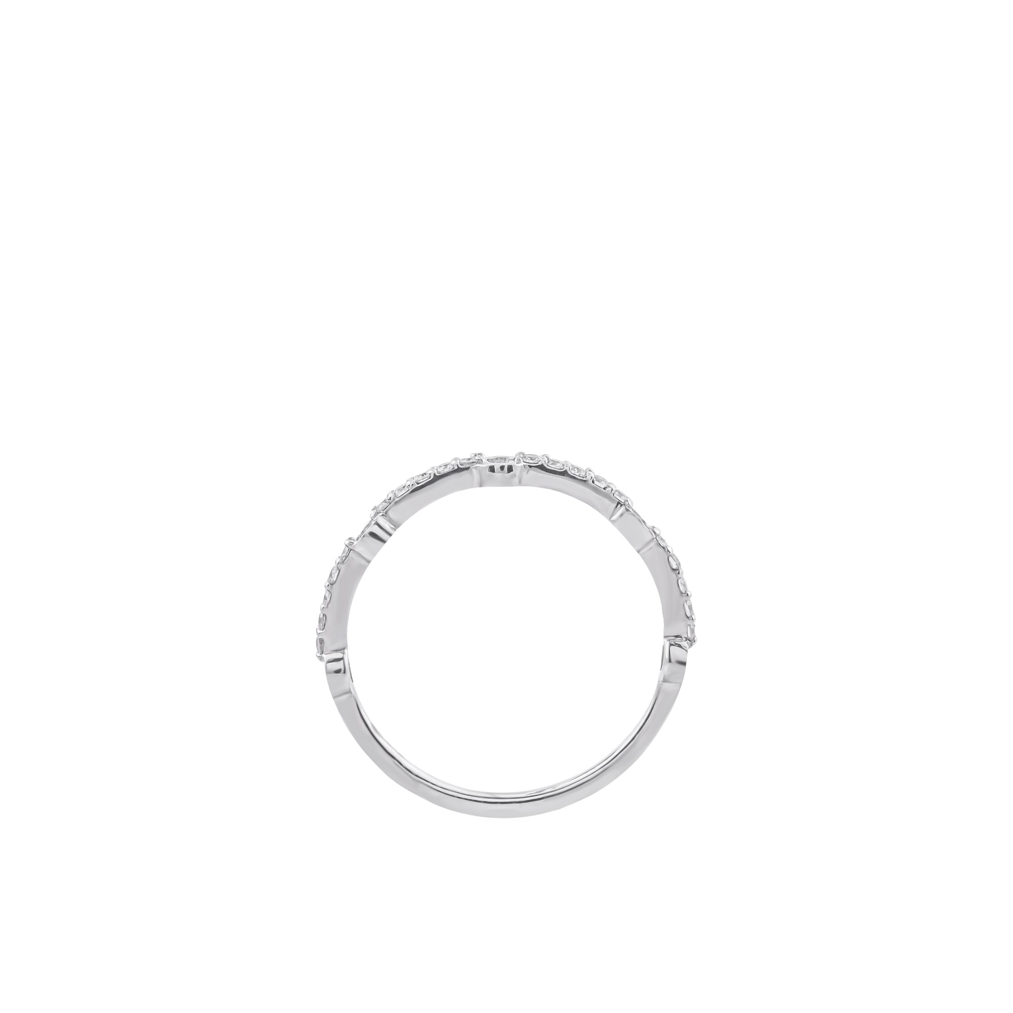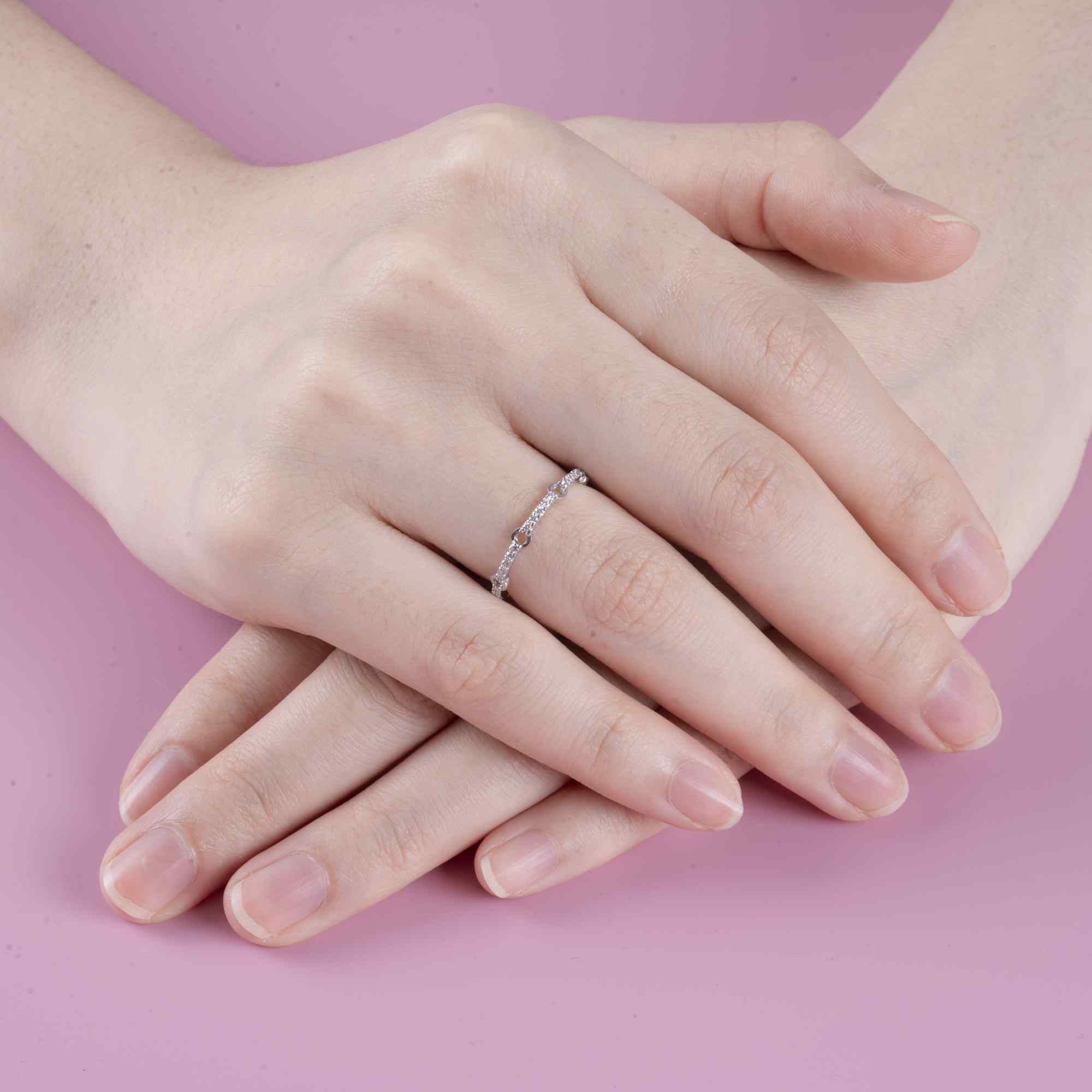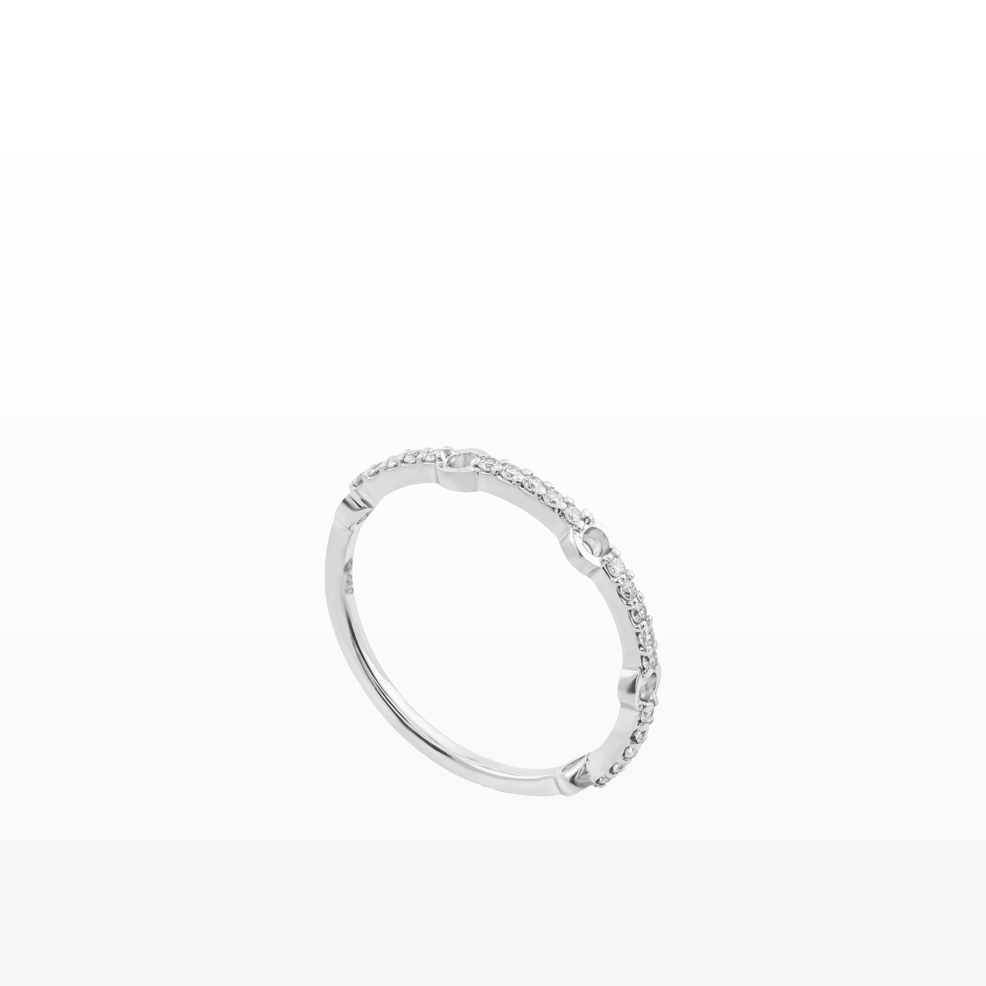Thân nhẫn thanh mảnh, được điểm xuyết bằng dải kim cương chạy đều, lấp lánh nhẹ nhàng như những khoảnh khắc hạnh phúc được xâu chuỗi theo thời gian. Ánh sáng phản chiếu dịu êm, không phô trương, đủ để tôn lên nét thanh lịch và gu thẩm mỹ tinh tế của người đeo.