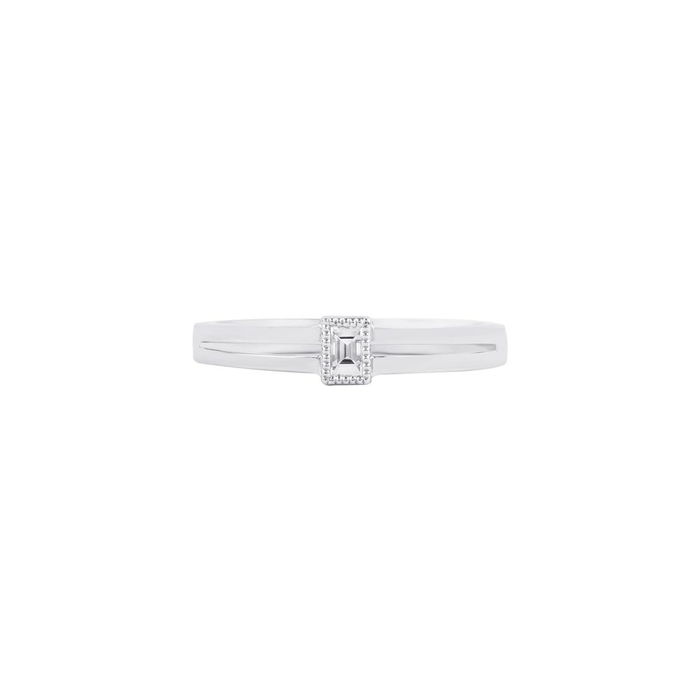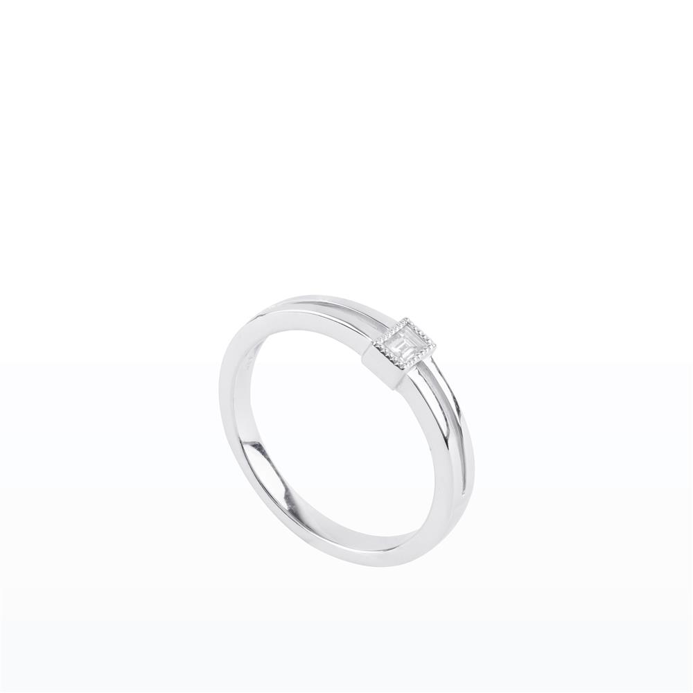Chiếc nhẫn mang phong cách minimalist (tối giản), được chế tác từ vàng trắng sang trọng, điểm nhấn là viên kim cương cắt Baguette – kiểu cắt chữ nhật thanh lịch, tạo hiệu ứng ánh sáng sắc nét và hiện đại.