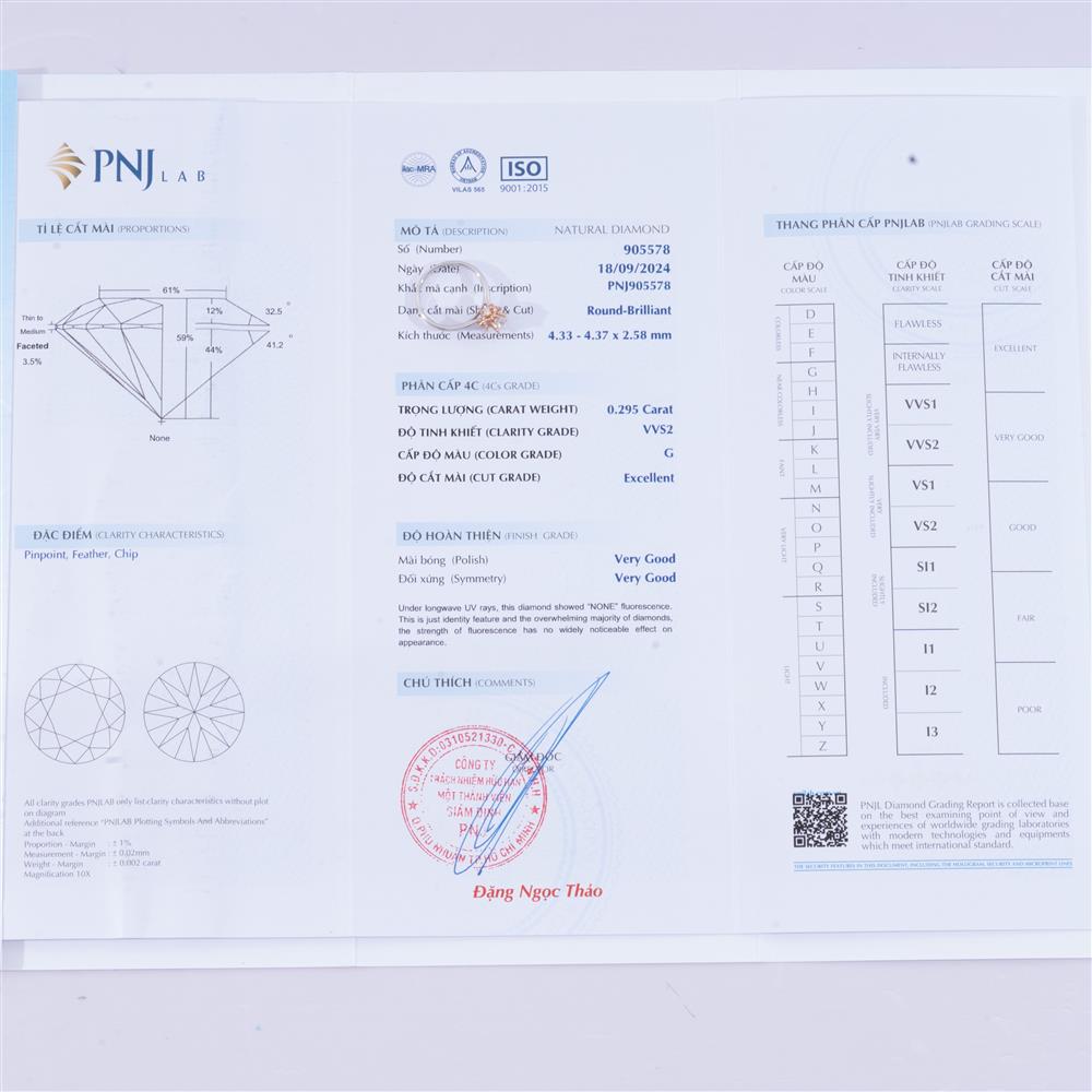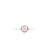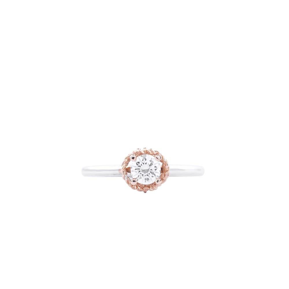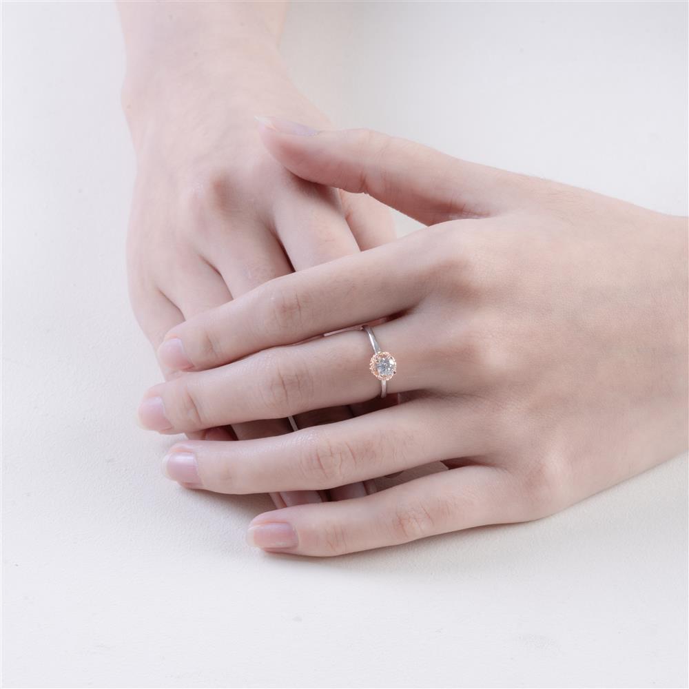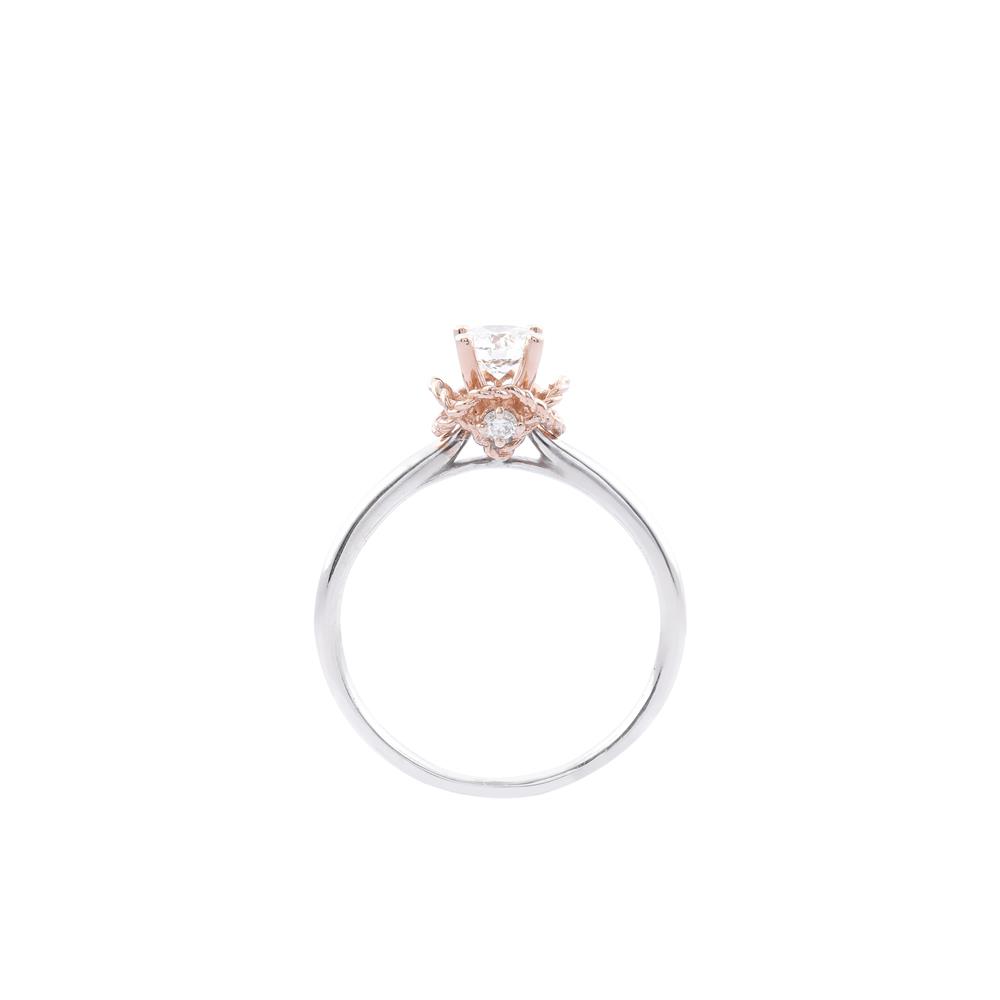 Thiết kế nhẫn gây ấn tượng với viên kim cương tròn chủ đặt cao ở trung tâm, được nâng đỡ bởi đế hoa tinh xảo tông vàng hồng. Những đường nét đan xen mềm mại quanh ổ đá tạo hiệu ứng ánh sáng đa chiều, giúp viên kim cương trông lớn hơn, sáng hơn và nổi bật từ mọi góc nhìn.
