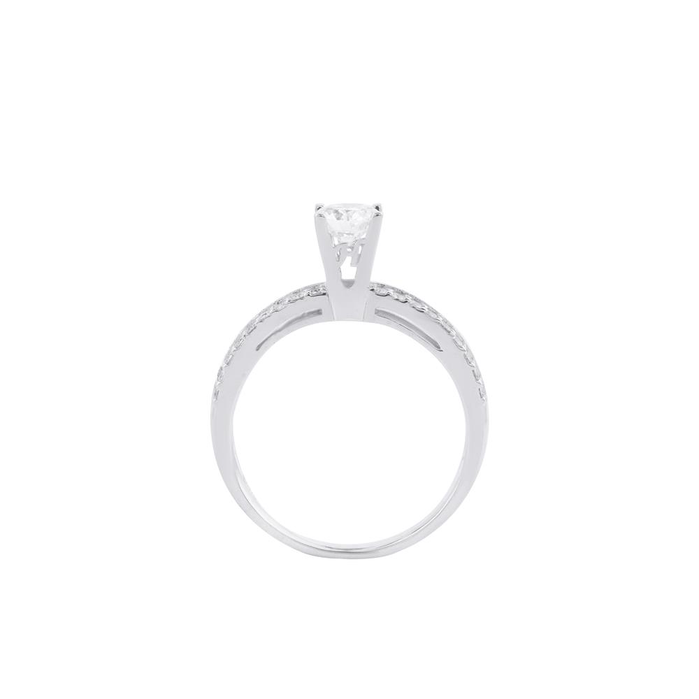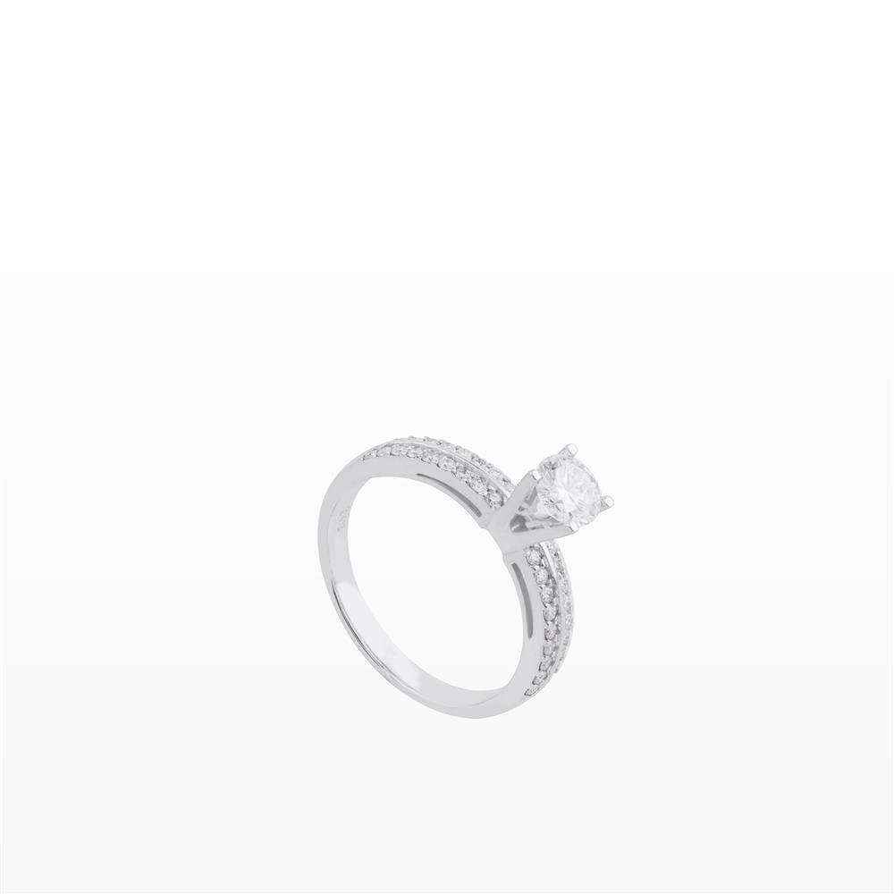 Nhẫn kim cương sở hữu thiết kế thanh lịch với viên kim cương chủ tròn nổi bật ở trung tâm, được nâng cao vừa vặn giúp tối ưu khả năng bắt sáng và tôn lên độ rực rỡ tự nhiên của viên đá.