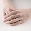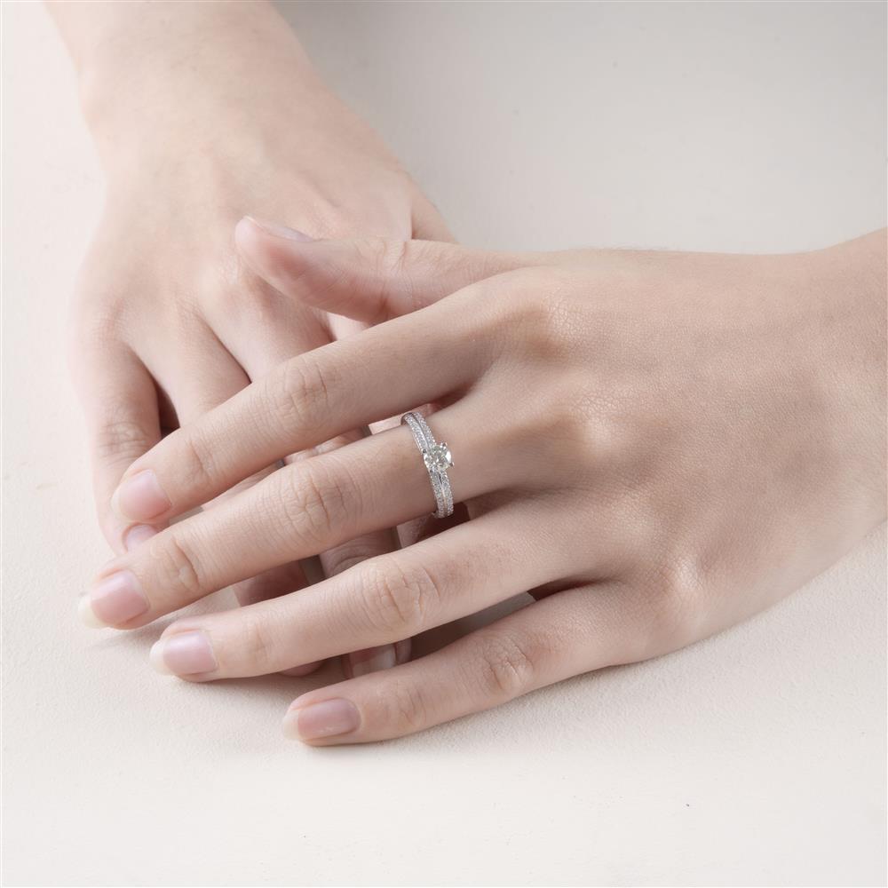 Thân nhẫn được đính hai hàng kim cương nhỏ chạy song song, tạo hiệu ứng lấp lánh tinh tế từ mọi góc nhìn nhưng vẫn giữ phom dáng gọn gàng, sang trọng. Tổng thể thiết kế cân đối, chắc chắn, mang lại cảm giác đeo thoải mái và phù hợp để sử dụng hằng ngày hoặc làm nhẫn cầu hôn, nhẫn kỷ niệm đầy ý nghĩa.