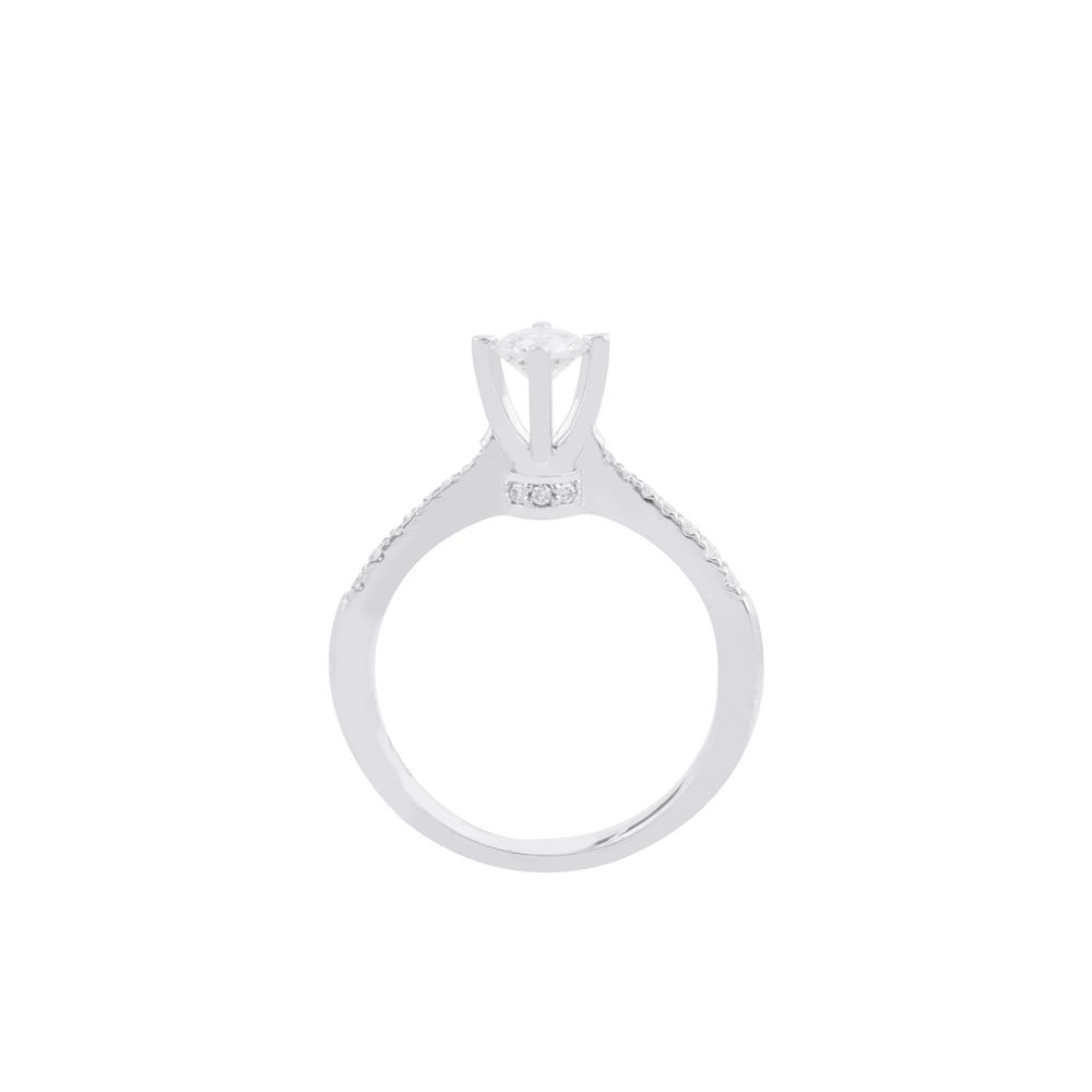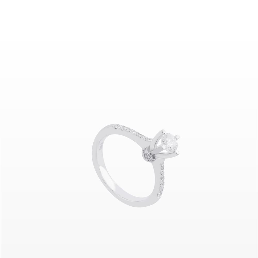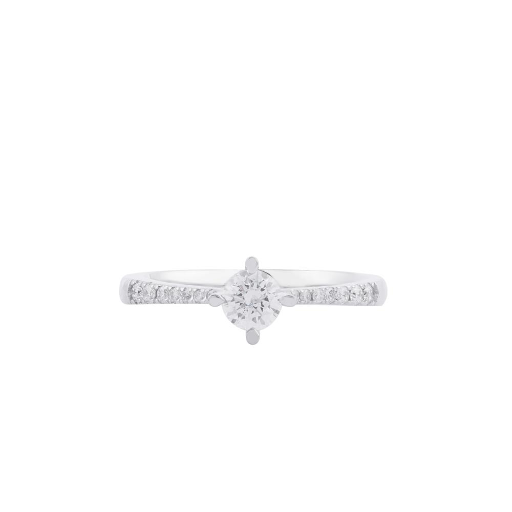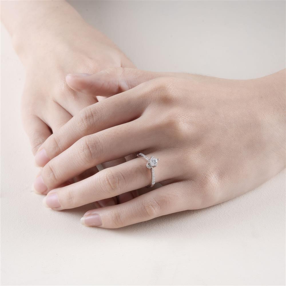 Chiếc nhẫn kim cương mang thiết kế thanh lịch với viên kim cương chủ tròn được nâng đỡ bởi chấu cao tinh xảo, giúp tối ưu khả năng bắt sáng và tôn trọn vẻ rực rỡ tự nhiên của viên đá. Thân nhẫn thon gọn, đính dải kim cương nhỏ chạy dọc hai bên, tạo hiệu ứng lấp lánh nhẹ nhàng nhưng sang trọng.