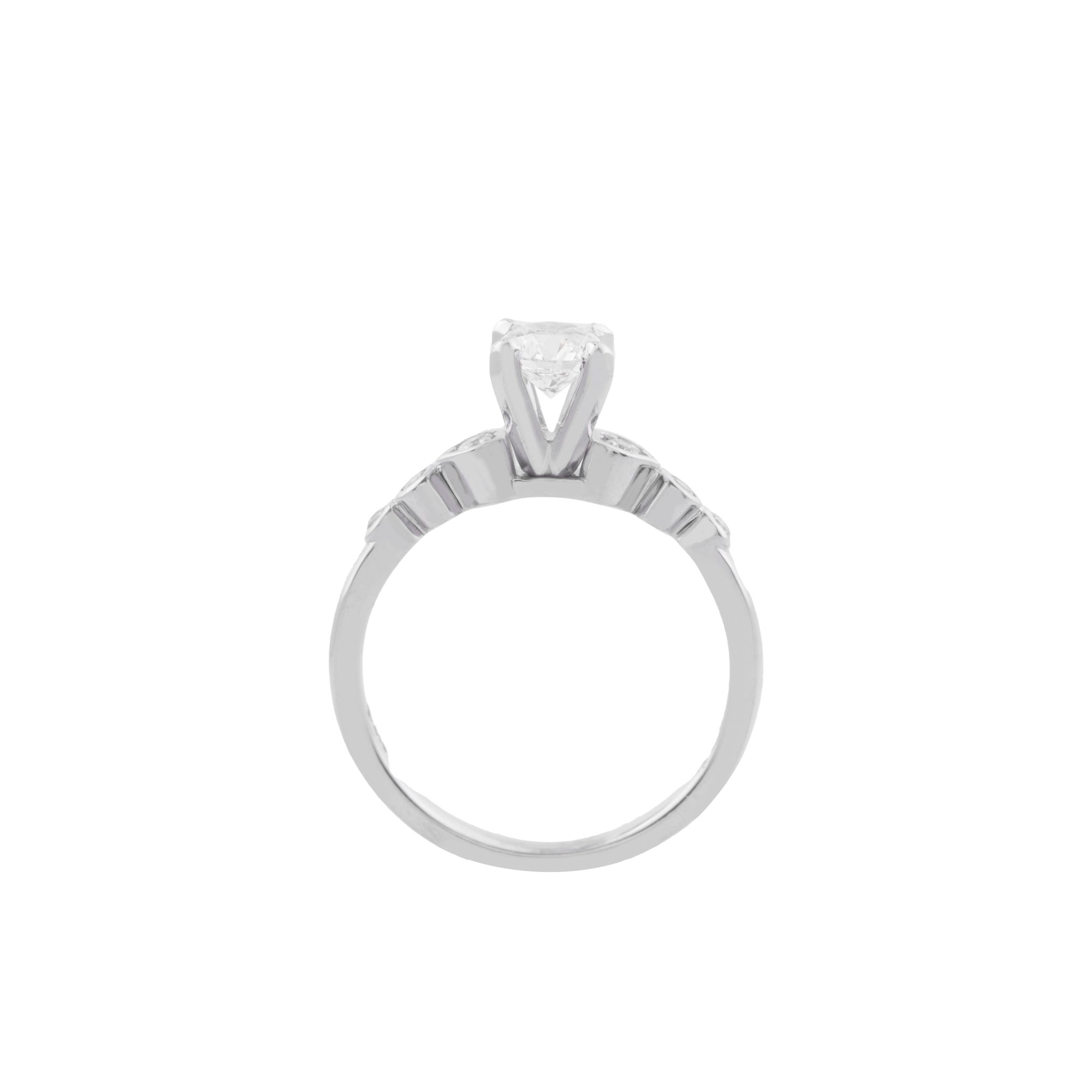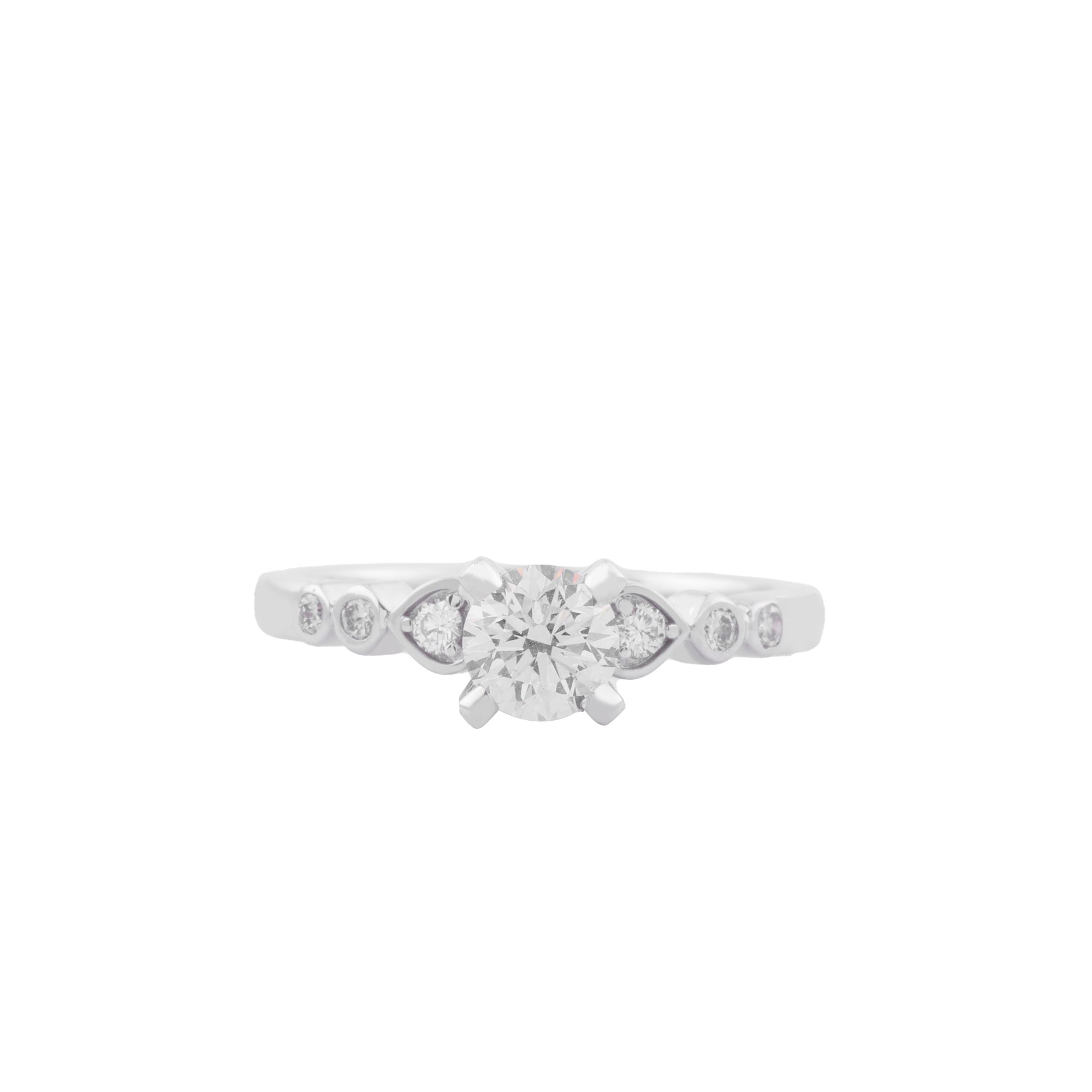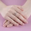 Viên kim cương chủ được nâng niu trong thiết kế ổ chấu mềm mại, nổi bật nhưng không phô trương, tựa như một khoảnh khắc quý giá được đặt ở vị trí trung tâm. Dọc theo thân nhẫn là những viên kim cương nhỏ được sắp xếp khéo léo, dẫn ánh sáng lan tỏa nhẹ nhàng, tạo nên sự liền mạch và hài hòa cho tổng thể.
