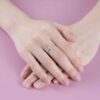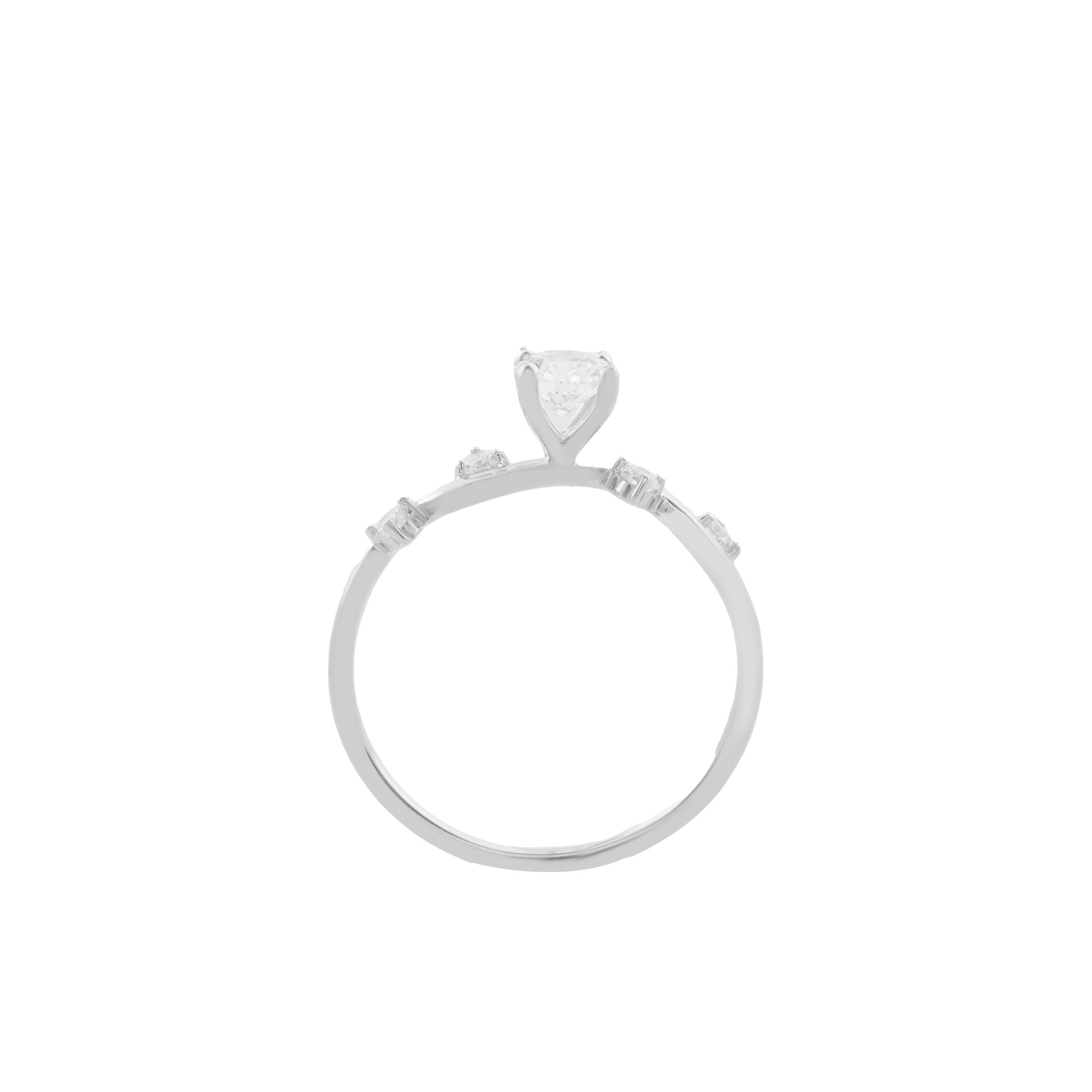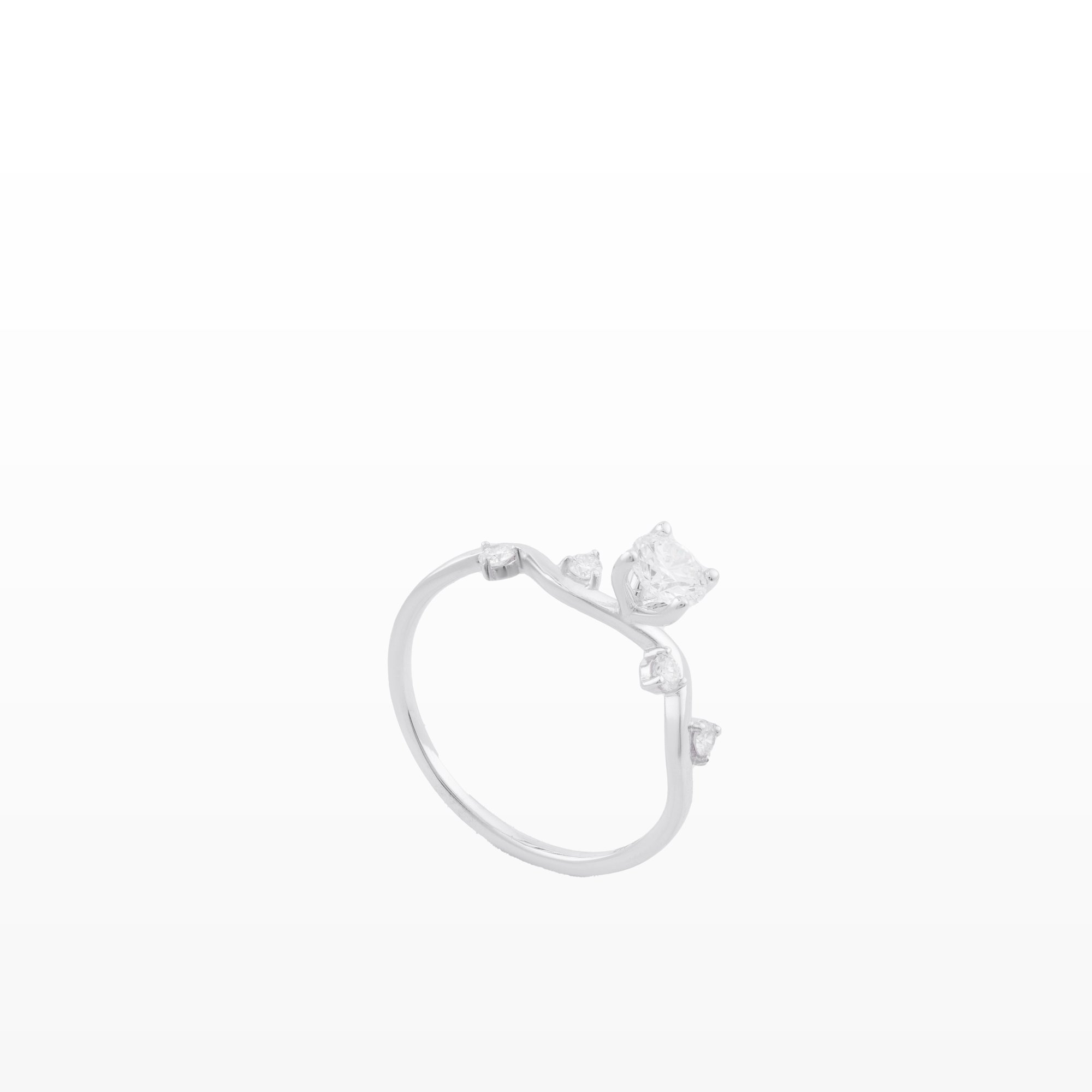 Thiết kế thân nhẫn uốn lượn uyển chuyển, tựa như dòng chảy dịu dàng của cảm xúc, dẫn lối ánh nhìn về viên kim cương chủ lấp lánh ở trung tâm. Viên được nâng niu trong ổ chấu thanh thoát, đón trọn ánh sáng và tỏa ra vẻ đẹp tinh khôi, sâu lắng. Dọc theo thân nhẫn, những viên kim cương nhỏ được đặt khéo léo, như những vì sao nhỏ đồng hành, làm nền để ánh sáng trung tâm thêm rực rỡ.