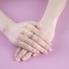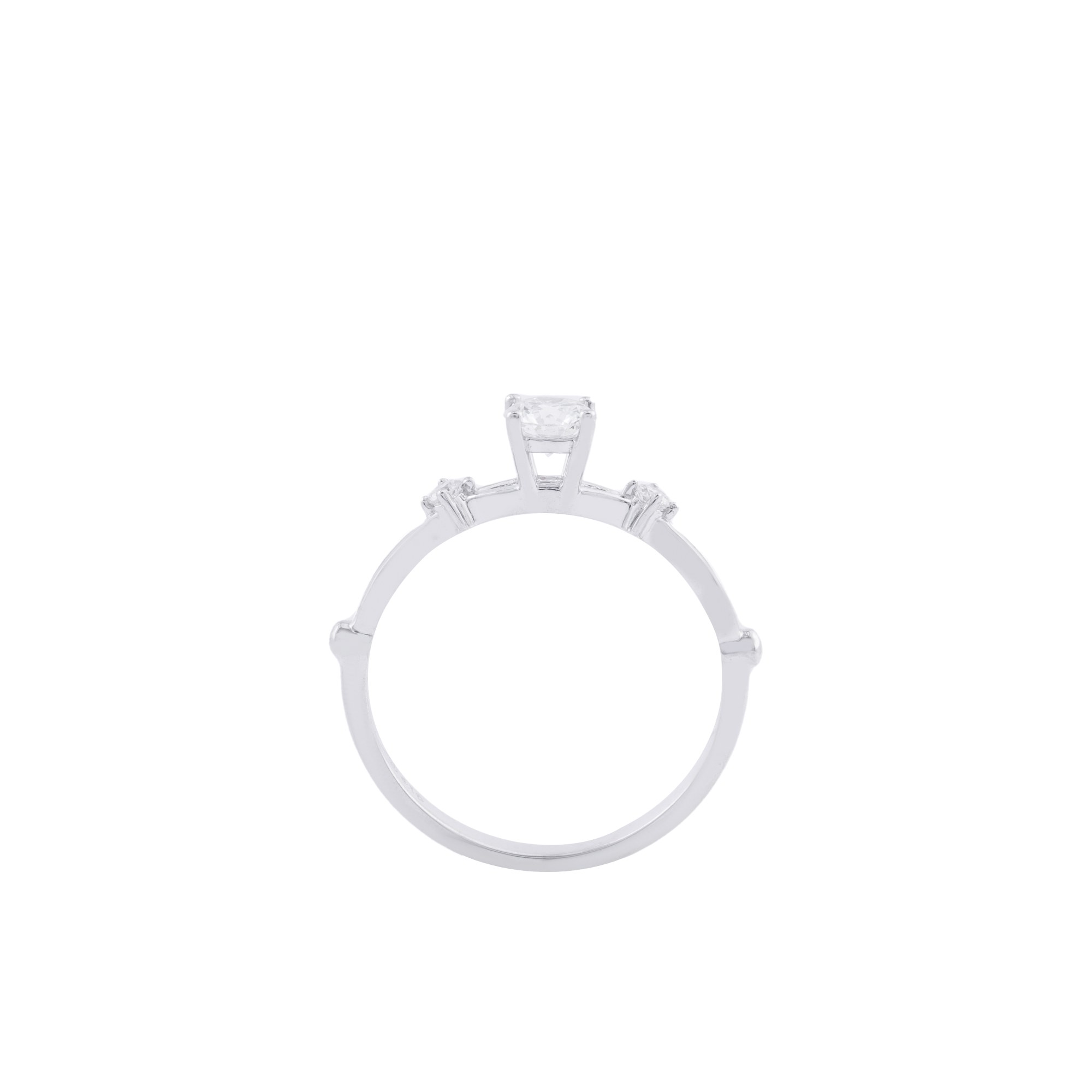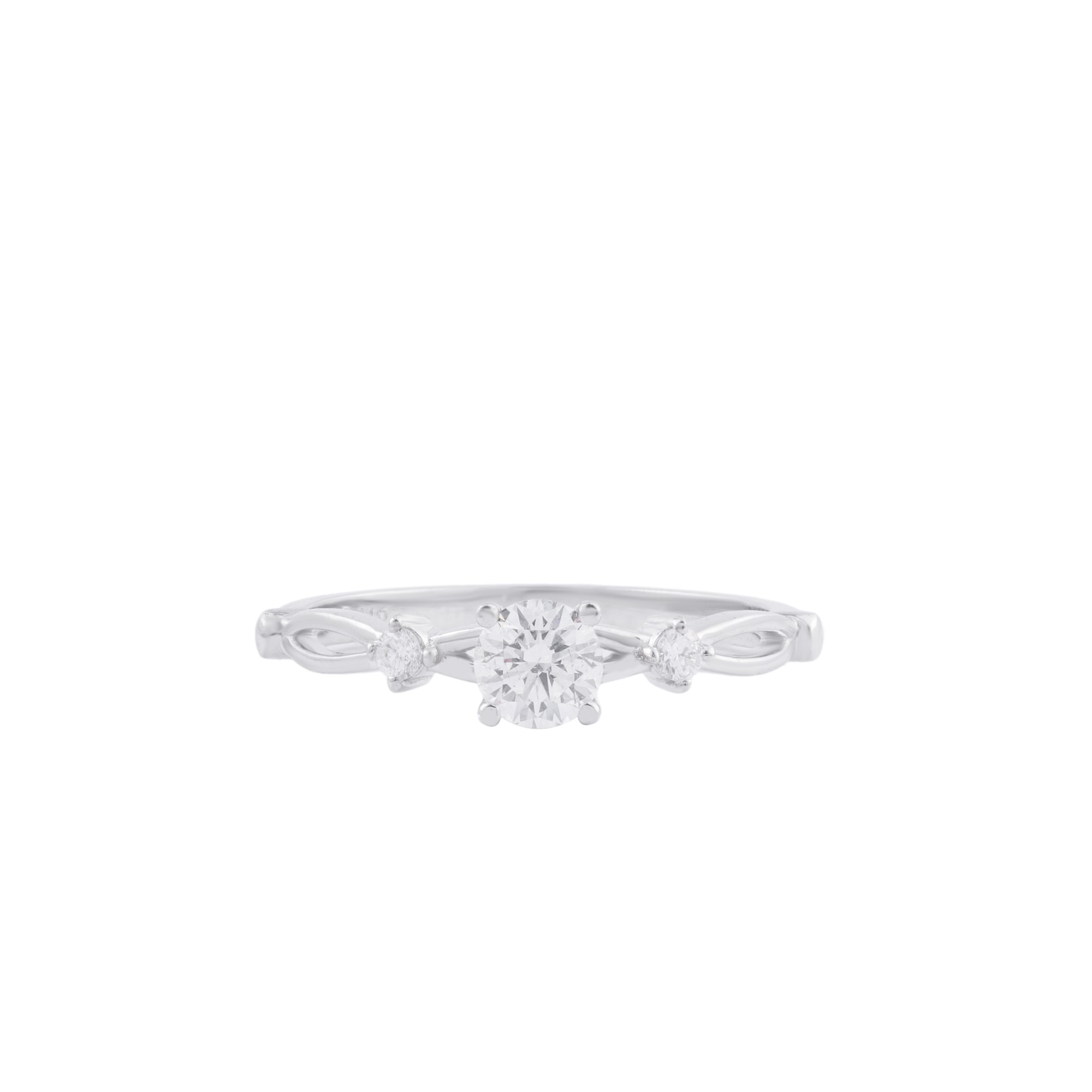 Tâm điểm là viên kim cương chủ nổi bật, được nâng cao trên chấu thanh thoát, giúp tối đa hóa độ bắt sáng và tỏa rực rỡ ở mọi góc nhìn. Hai viên kim cương nhỏ hai bên đóng vai trò điểm xuyết tinh tế, tạo nên tổng thể cân đối và hài hòa.