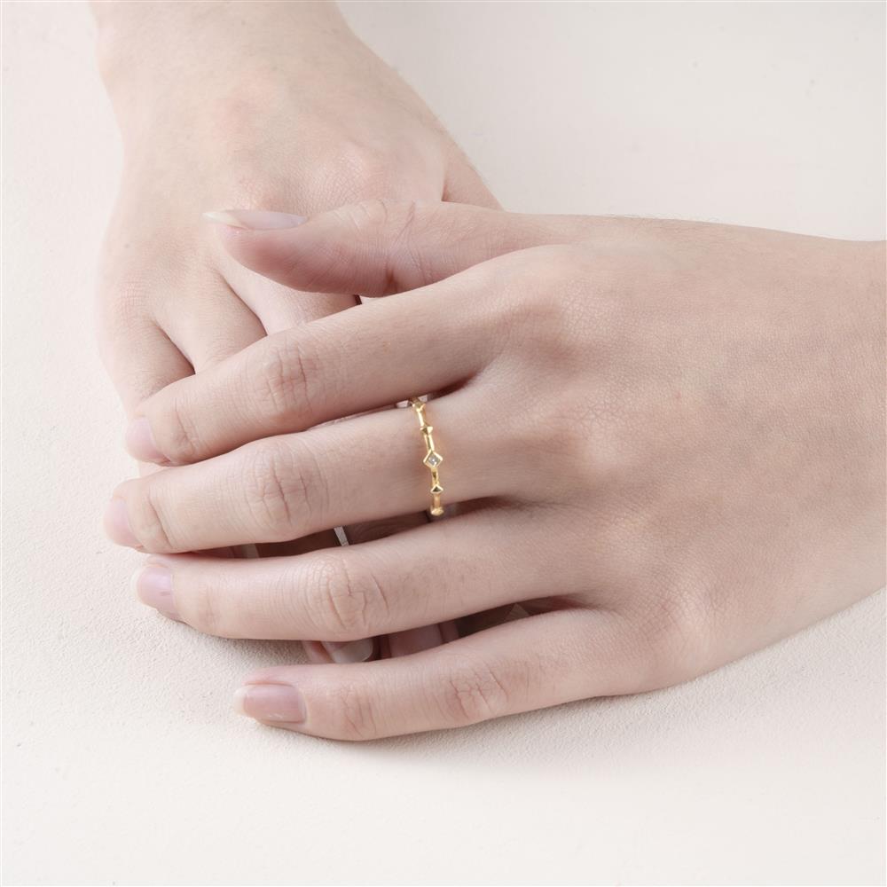 Thiết kế tối giản với điểm nhấn là viên kim cương dáng vuông tinh tế ở trung tâm, đai nhẫn cách điệu tạo nhịp điệu hiện đại. Mẫu nhẫn mang đến vẻ đẹp thanh thoát, độc đáo và dễ dàng kết hợp với nhiều phong cách trang phục