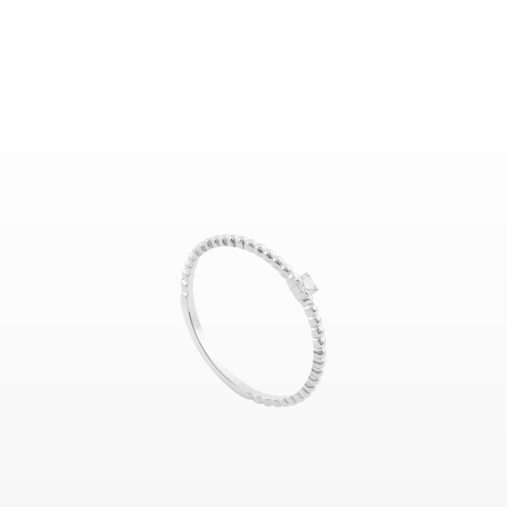 Chiếc nhẫn được thiết kế với phần đai nhẫn dạng hạt nhỏ liên tiếp, tạo nên hiệu ứng mềm mại và tinh xảo như những viên ngọc nhỏ ôm trọn ngón tay. Ở trung tâm là viên kim cương được đặt nổi bật, tỏa sáng nhẹ nhàng và mang lại điểm nhấn thanh lịch cho tổng thể thiết kế.