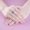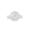 Chiếc nhẫn gây ấn tượng mạnh với thiết kế halo kép nổi bật, nơi viên kim cương trung tâm được bao quanh bởi hai tầng kim cương tấm lấp lánh, tạo hiệu ứng như một đóa hoa ánh sáng rực rỡ trên đầu ngón tay. Mỗi chuyển động đều phản chiếu ánh sáng đa chiều, mang lại vẻ đẹp sang trọng và cuốn hút tuyệt đối.