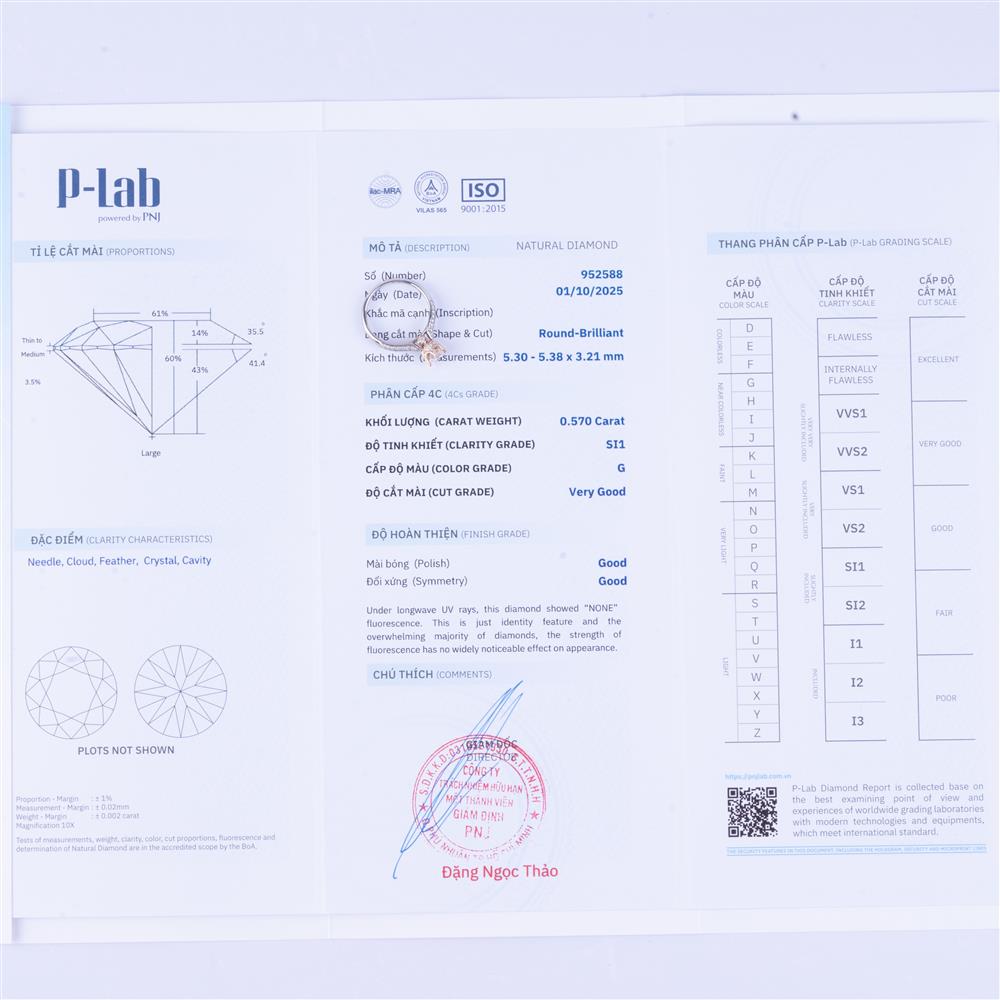 | Kim cương viên: | 5.30 - 5.38 LY G/SI1 |