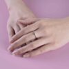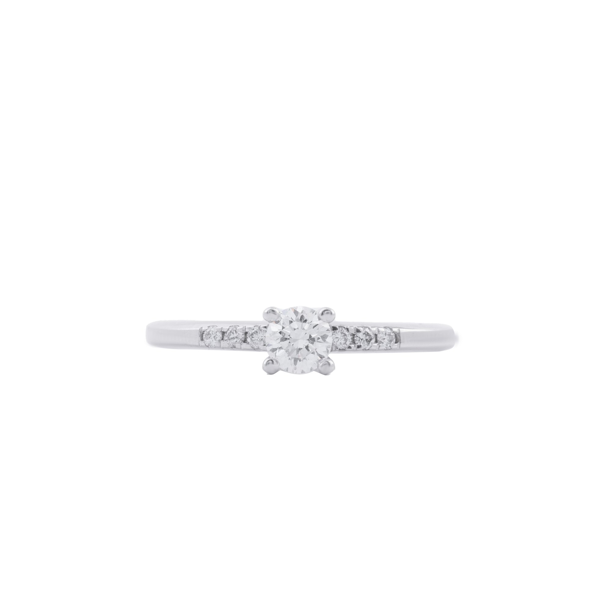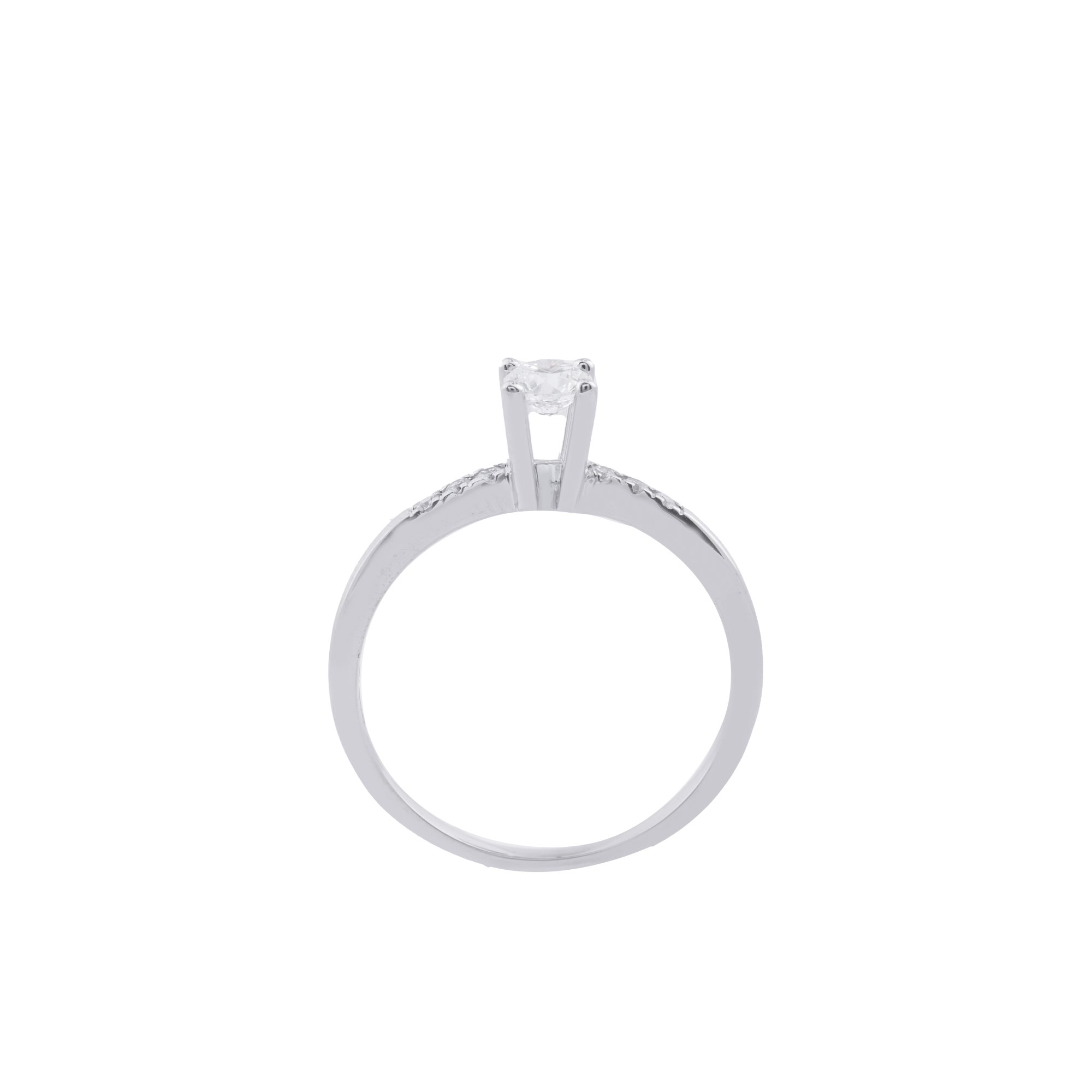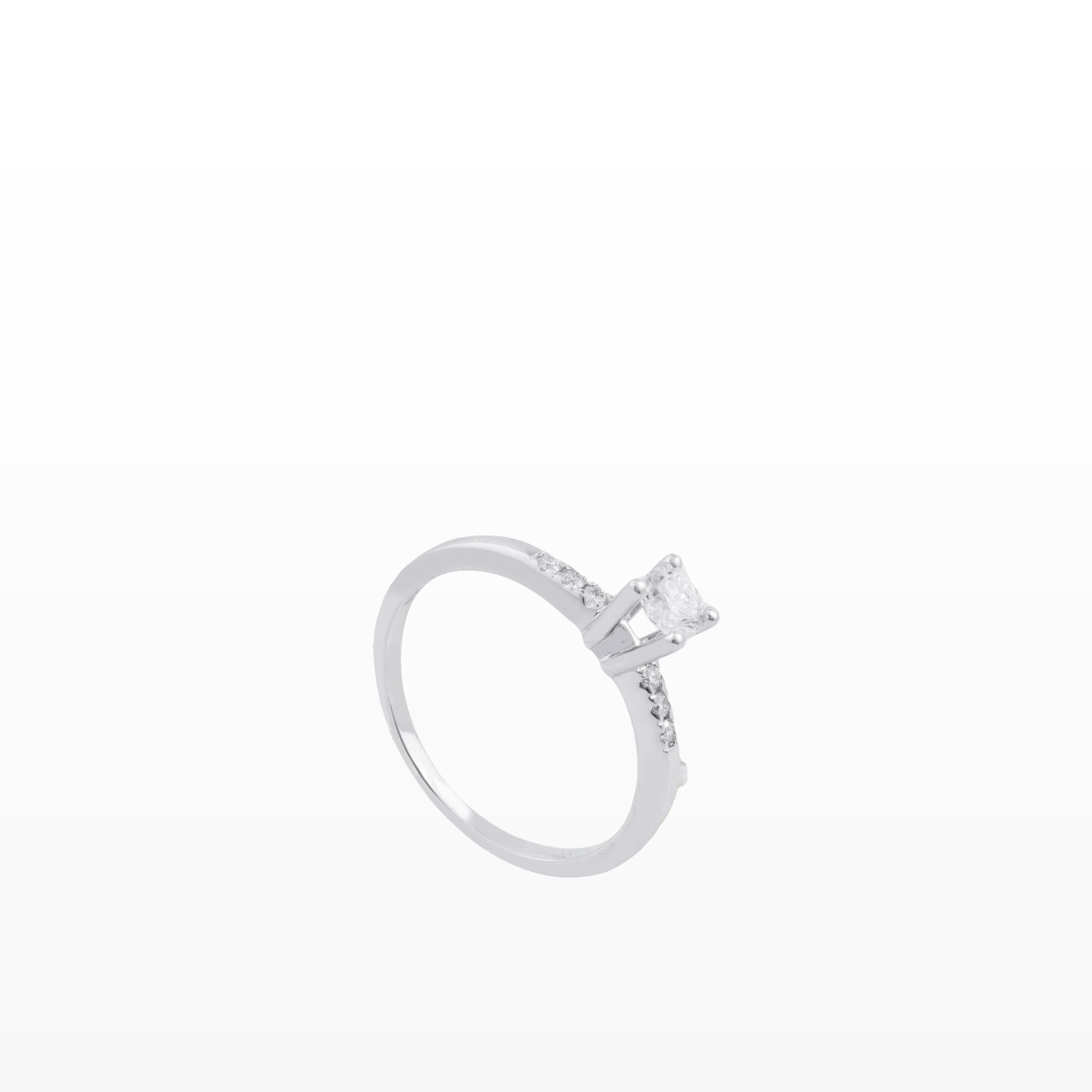 Chiếc nhẫn sở hữu thiết kế solitaire thanh lịch với viên kim cương tròn ở vị trí trung tâm, được tôn vinh bởi chấu tròn cân đối, giúp ánh sáng phản chiếu tối đa và tạo nên vẻ lấp lánh cuốn hút từ mọi góc nhìn. Hai bên thân nhẫn được điểm xuyết kim cương tấm nhỏ, mang lại chiều sâu tinh tế mà vẫn giữ trọn nét tối giản, trang nhã.