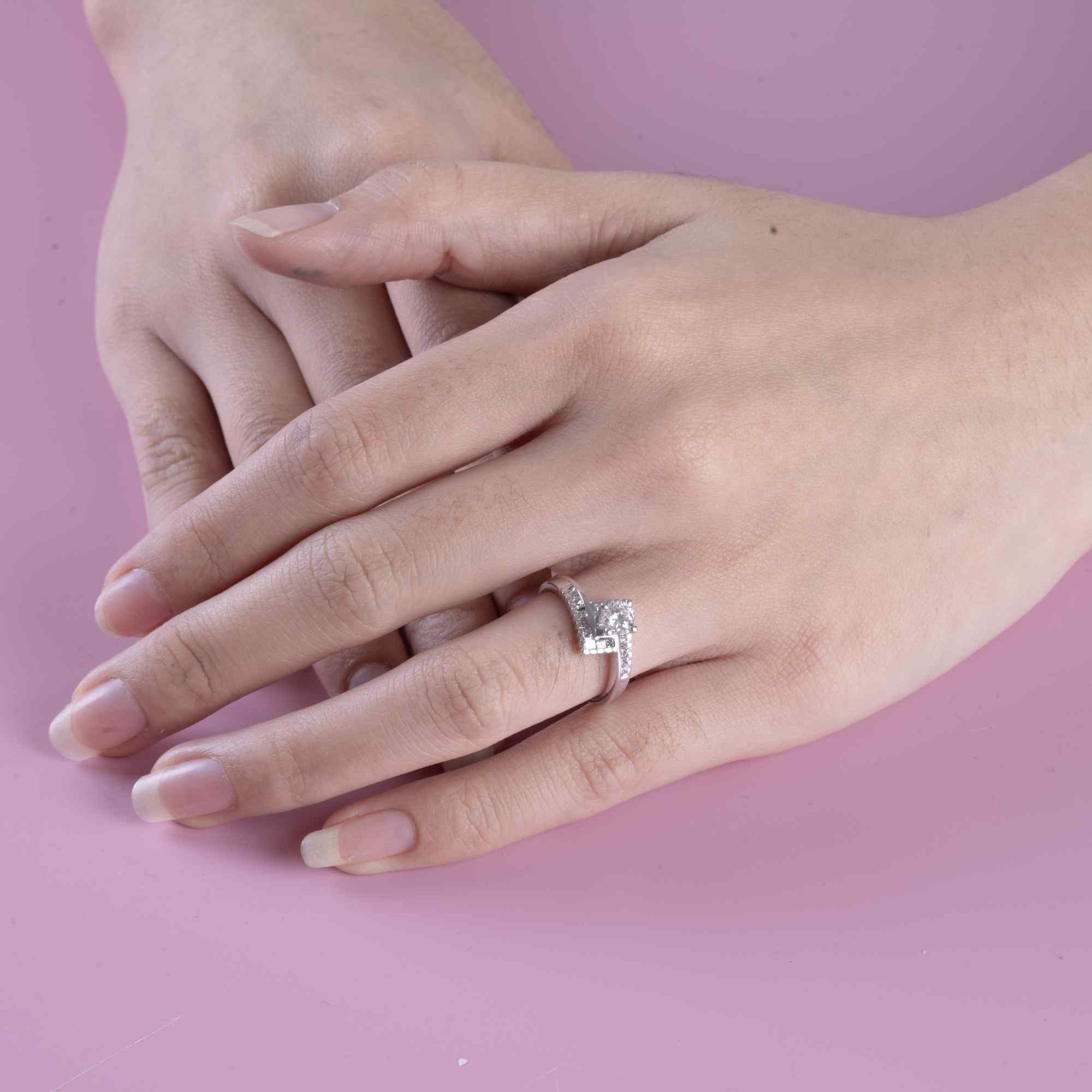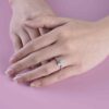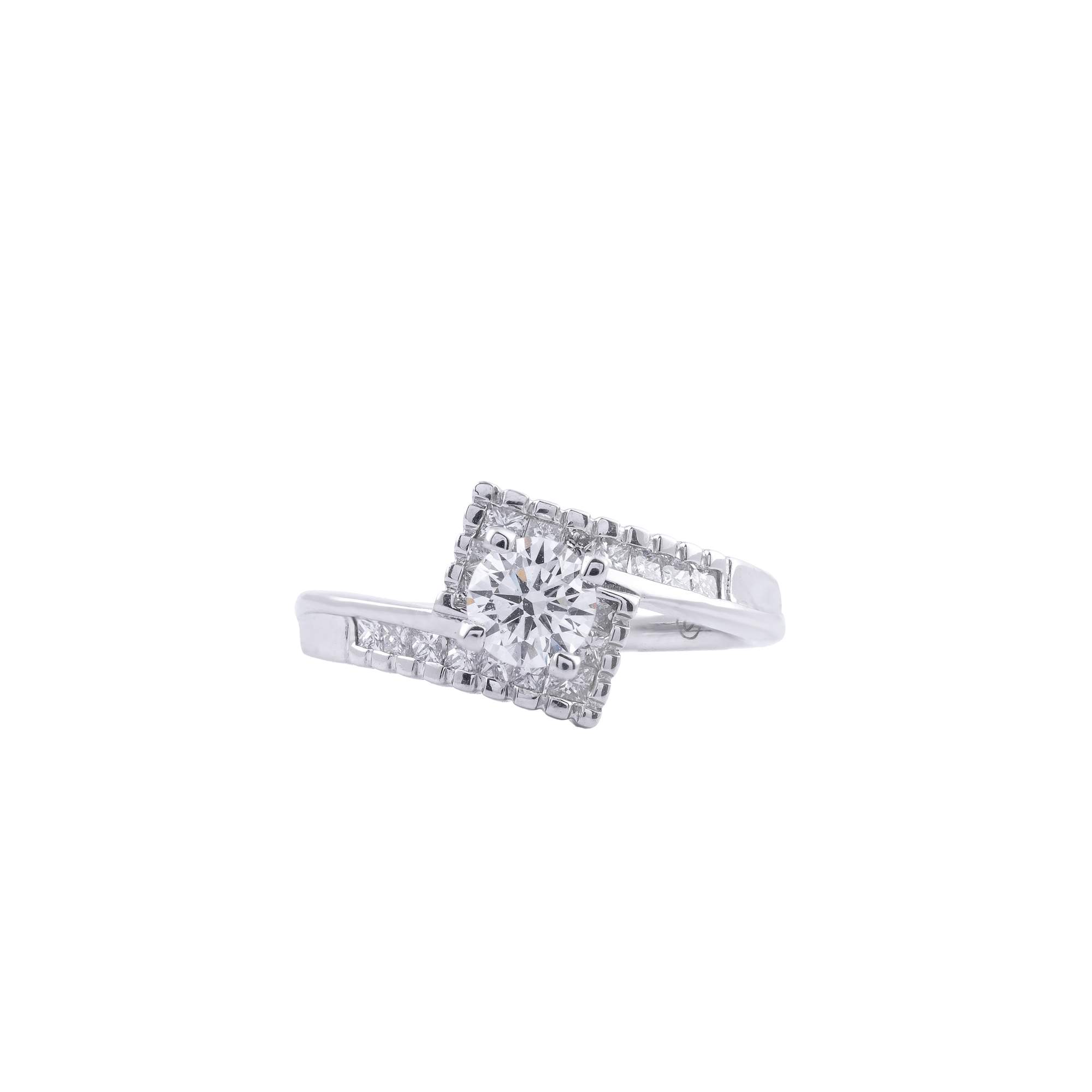 Chiếc nhẫn nổi bật với viên kim cương chủ tròn được nâng niu ở vị trí trung tâm, tỏa sáng rực rỡ nhờ thiết kế halo vuông tinh xảo bao quanh. Những viên kim cương nhỏ được sắp xếp tỉ mỉ không chỉ gia tăng độ lấp lánh mà còn tạo hiệu ứng thị giác hoàn hảo, khiến viên chủ trở nên nổi bật và cuốn hút trong mọi góc nhìn.