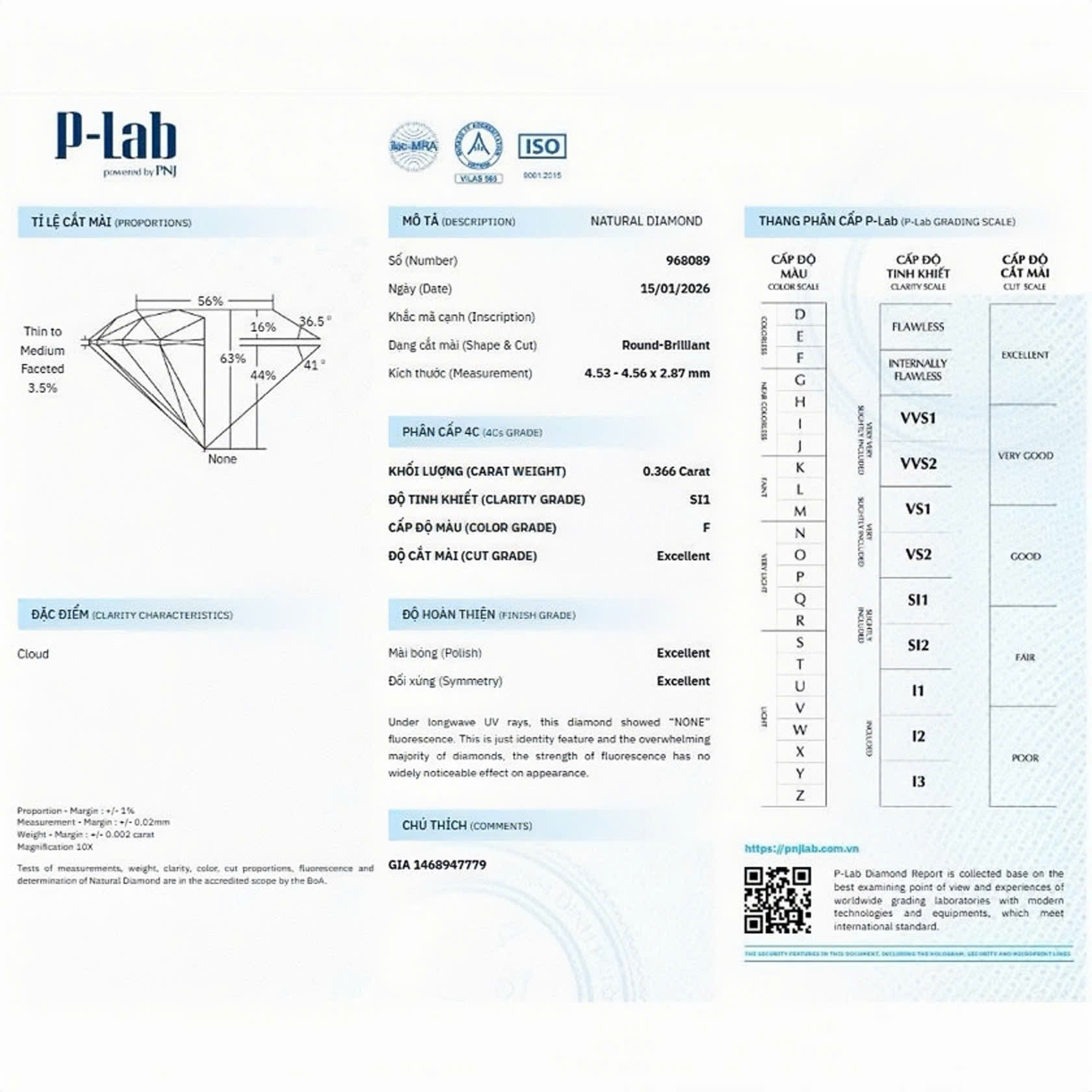 | Size viên chủ: | 4.53 - 4.56LY F/SI1 |