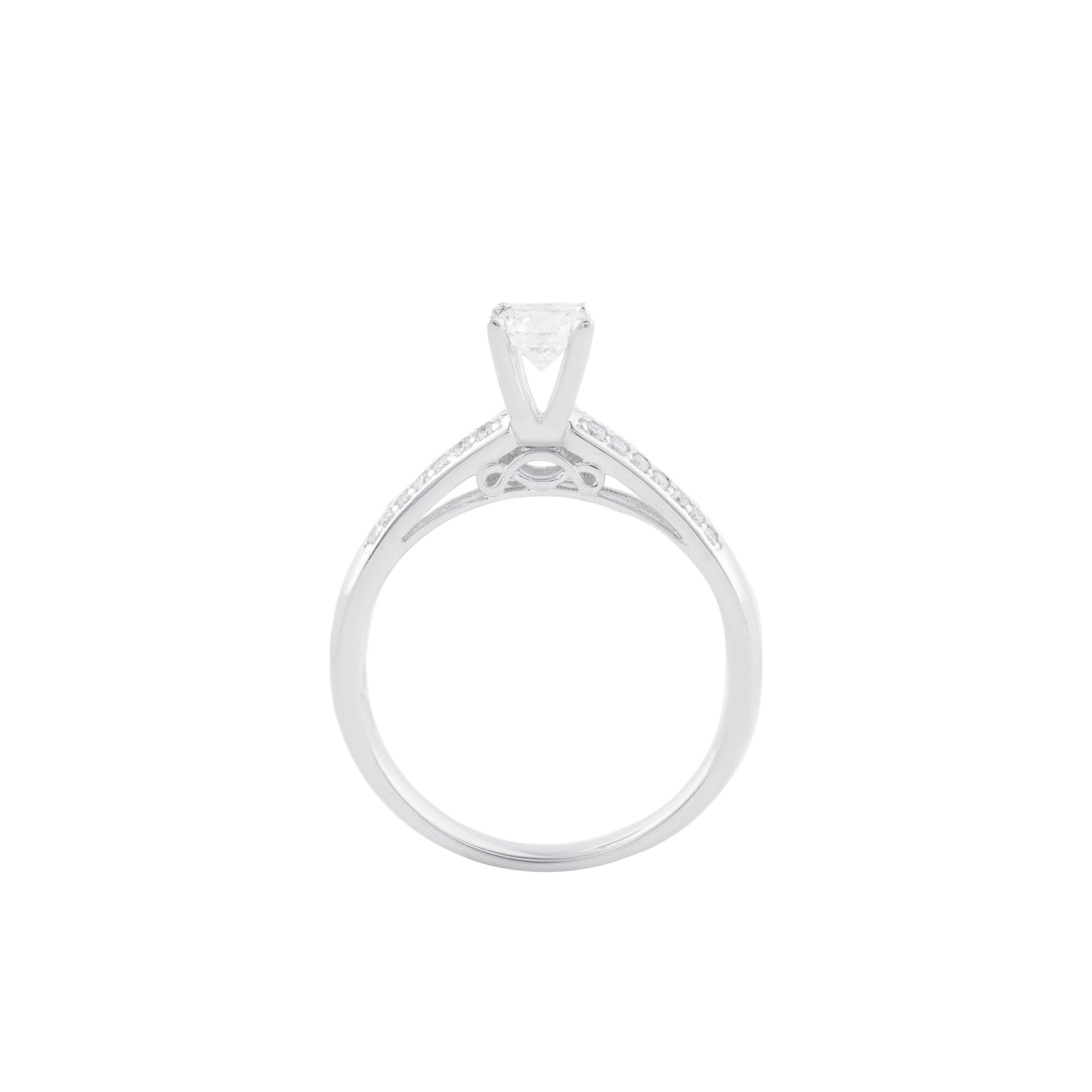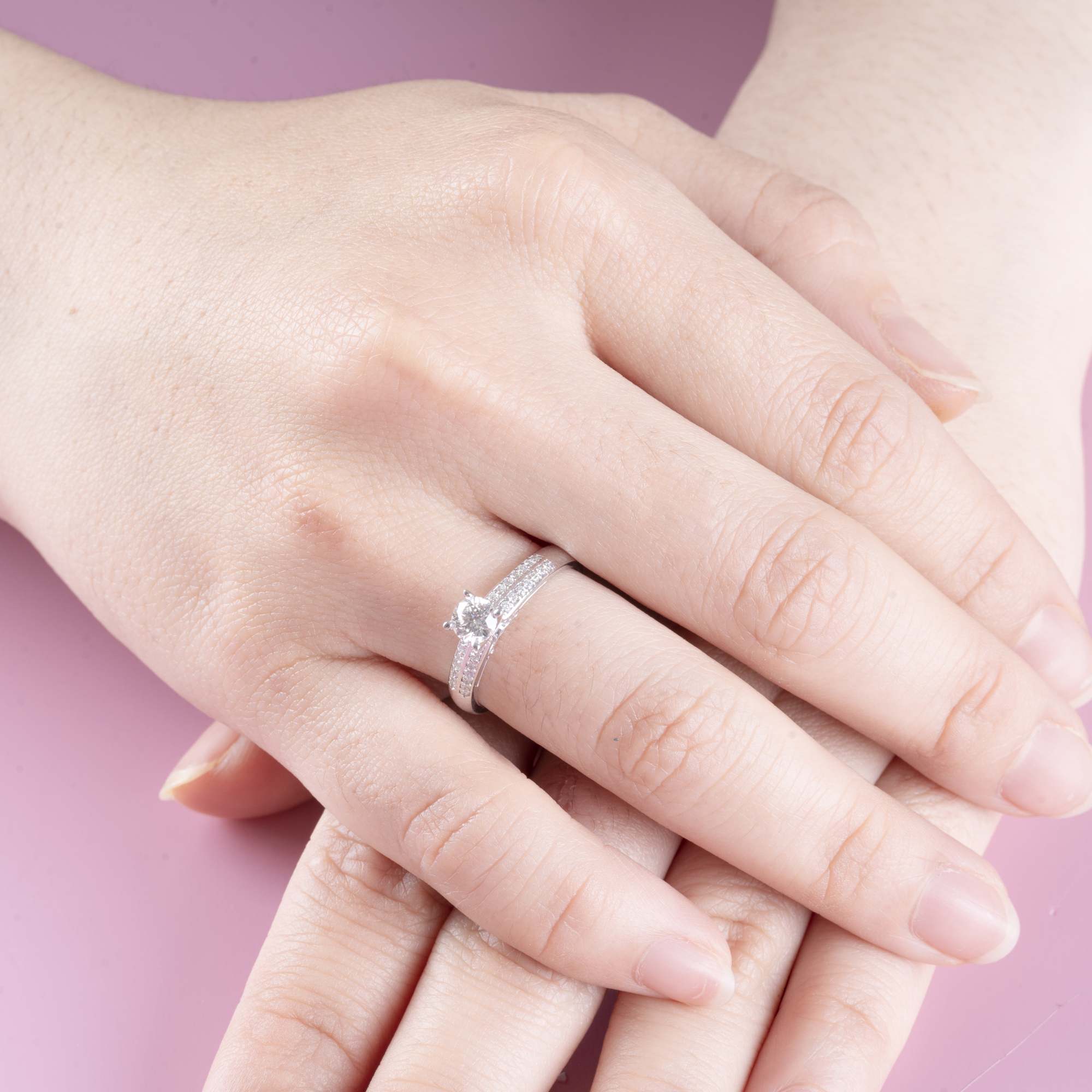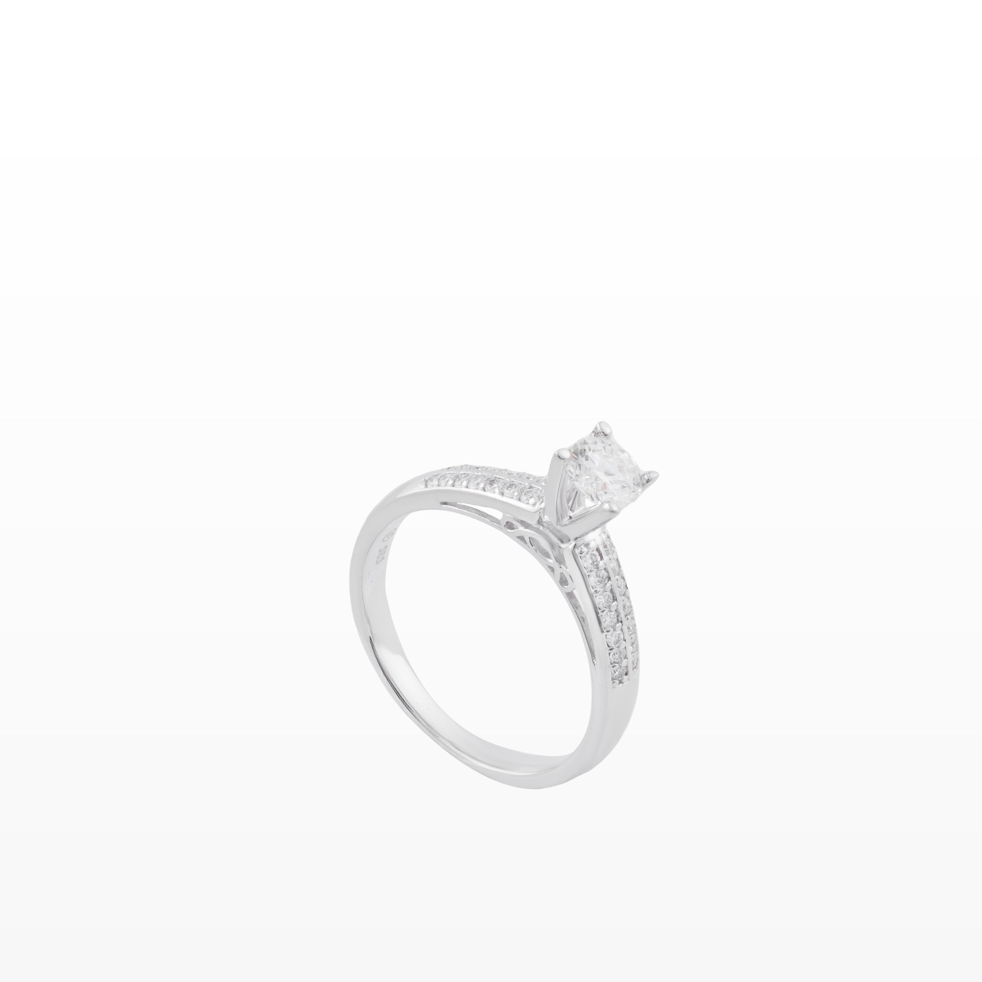 Chiếc nhẫn nổi bật với viên kim cương chủ dáng vuông (princess) được đặt cao, tôn vinh trọn vẹn vẻ đẹp sắc nét và hiện đại. Các cạnh cắt dứt khoát giúp viên đá phản chiếu ánh sáng mạnh mẽ, tạo nên hiệu ứng lấp lánh đầy cuốn hút ở mọi góc nhìn.